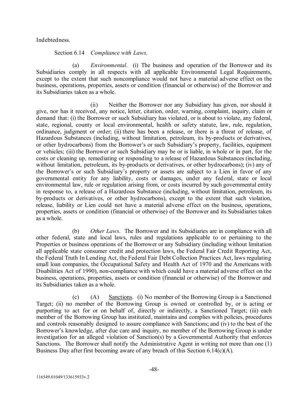 -48- 116549.01049/133615933v.2 Indebtedness. Section 6.14 Compliance with Laws. (a) Environmental. (i) The business and operation of the Borrower and its Subsidiaries comply in all respects with all applicable Environmental Legal Requirements, except to the extent that such noncompliance would not have a material adverse effect on the business, operations, properties, assets or condition (financial or otherwise) of the Borrower and its Subsidiaries taken as a whole. (ii) Neither the Borrower nor any Subsidiary has given, nor should it give, nor has it received, any notice, letter, citation, order, warning, complaint, inquiry, claim or demand that: (i) the Borrower or such Subsidiary has violated, or is about to violate, any federal, state, regional, county or local environmental, health or safety statute, law, rule, regulation, ordinance, judgment or order; (ii) there has been a release, or there is a threat of release, of Hazardous Substances (including, without limitation, petroleum, its by-products or derivatives, or other hydrocarbons) from the Borrower’s or such Subsidiary’s property, facilities, equipment or vehicles; (iii) the Borrower or such Subsidiary may be or is liable, in whole or in part, for the costs or cleaning up, remediating or responding to a release of Hazardous Substances (including, without limitation, petroleum, its by-products or derivatives, or other hydrocarbons); (iv) any of the Borrower’s or such Subsidiary’s property or assets are subject to a Lien in favor of any governmental entity for any liability, costs or damages, under any federal, state or local environmental law, rule or regulation arising from, or costs incurred by such governmental entity in response to, a release of a Hazardous Substance (including, without limitation, petroleum, its by-products or derivatives, or other hydrocarbons), except to the extent that such violation, release, liability or Lien could not have a material adverse effect on the business, operations, properties, assets or condition (financial or otherwise) of the Borrower and its Subsidiaries taken as a whole. (b) Other Laws. The Borrower and its Subsidiaries are in compliance with all other federal, state and local laws, rules and regulations applicable to or pertaining to the Properties or business operations of the Borrower or any Subsidiary (including without limitation all applicable state consumer credit and protection laws, the Federal Fair Credit Reporting Act, the Federal Truth In Lending Act, the Federal Fair Debt Collection Practices Act, laws regulating small loan companies, the Occupational Safety and Health Act of 1970 and the Americans with Disabilities Act of 1990), non-compliance with which could have a material adverse effect on the business, operations, properties, assets or condition (financial or otherwise) of the Borrower and its Subsidiaries taken as a whole. (c) (A) Sanctions. (i) No member of the Borrowing Group is a Sanctioned Target; (ii) no member of the Borrowing Group is owned or controlled by, or is acting or purporting to act for or on behalf of, directly or indirectly, a Sanctioned Target; (iii) each member of the Borrowing Group has instituted, maintains and complies with policies, procedures and controls reasonably designed to assure compliance with Sanctions; and (iv) to the best of the Borrower’s knowledge, after due care and inquiry, no member of the Borrowing Group is under investigation for an alleged violation of Sanction(s) by a Governmental Authority that enforces Sanctions. The Borrower shall notify the Administrative Agent in writing not more than one (1) Business Day after first becoming aware of any breach of this Section 6.14(c)(A).