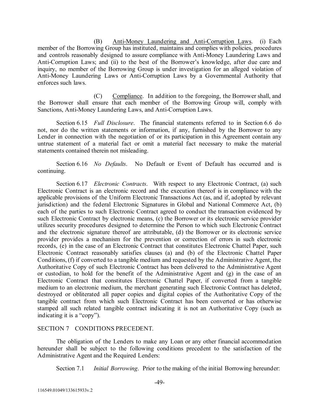 -49- 116549.01049/133615933v.2 (B) Anti-Money Laundering and Anti-Corruption Laws. (i) Each member of the Borrowing Group has instituted, maintains and complies with policies, procedures and controls reasonably designed to assure compliance with Anti-Money Laundering Laws and Anti-Corruption Laws; and (ii) to the best of the Borrower’s knowledge, after due care and inquiry, no member of the Borrowing Group is under investigation for an alleged violation of Anti-Money Laundering Laws or Anti-Corruption Laws by a Governmental Authority that enforces such laws. (C) Compliance. In addition to the foregoing, the Borrower shall, and the Borrower shall ensure that each member of the Borrowing Group will, comply with Sanctions, Anti-Money Laundering Laws, and Anti-Corruption Laws. Section 6.15 Full Disclosure. The financial statements referred to in Section 6.6 do not, nor do the written statements or information, if any, furnished by the Borrower to any Lender in connection with the negotiation of or its participation in this Agreement contain any untrue statement of a material fact or omit a material fact necessary to make the material statements contained therein not misleading. Section 6.16 No Defaults. No Default or Event of Default has occurred and is continuing. Section 6.17 Electronic Contracts. With respect to any Electronic Contract, (a) such Electronic Contract is an electronic record and the execution thereof is in compliance with the applicable provisions of the Uniform Electronic Transactions Act (as, and if, adopted by relevant jurisdiction) and the federal Electronic Signatures in Global and National Commerce Act, (b) each of the parties to such Electronic Contract agreed to conduct the transaction evidenced by such Electronic Contract by electronic means, (c) the Borrower or its electronic service provider utilizes security procedures designed to determine the Person to which such Electronic Contract and the electronic signature thereof are attributable, (d) the Borrower or its electronic service provider provides a mechanism for the prevention or correction of errors in such electronic records, (e) in the case of an Electronic Contract that constitutes Electronic Chattel Paper, such Electronic Contract reasonably satisfies clauses (a) and (b) of the Electronic Chattel Paper Conditions, (f) if converted to a tangible medium and requested by the Administrative Agent, the Authoritative Copy of such Electronic Contract has been delivered to the Administrative Agent or custodian, to hold for the benefit of the Administrative Agent and (g) in the case of an Electronic Contract that constitutes Electronic Chattel Paper, if converted from a tangible medium to an electronic medium, the merchant generating such Electronic Contract has deleted, destroyed or obliterated all paper copies and digital copies of the Authoritative Copy of the tangible contract from which such Electronic Contract has been converted or has otherwise stamped all such related tangible contract indicating it is not an Authoritative Copy (such as indicating it is a “copy”). SECTION 7 CONDITIONS PRECEDENT. The obligation of the Lenders to make any Loan or any other financial accommodation hereunder shall be subject to the following conditions precedent to the satisfaction of the Administrative Agent and the Required Lenders: Section 7.1 Initial Borrowing. Prior to the making of the initial Borrowing hereunder: