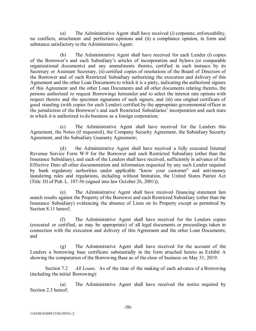 -50- 116549.01049/133615933v.2 (a) The Administrative Agent shall have received (i) corporate, enforceability, no conflicts, attachment and perfection opinions and (ii) a compliance opinion, in form and substance satisfactory to the Administrative Agent; (b) The Administrative Agent shall have received for each Lender (i) copies of the Borrower’s and each Subsidiary’s articles of incorporation and bylaws (or comparable organizational documents) and any amendments thereto, certified in each instance by its Secretary or Assistant Secretary, (ii) certified copies of resolutions of the Board of Directors of the Borrower and of each Restricted Subsidiary authorizing the execution and delivery of this Agreement and the other Loan Documents to which it is a party, indicating the authorized signers of this Agreement and the other Loan Documents and all other documents relating thereto, the persons authorized to request Borrowings hereunder and to select the interest rate options with respect thereto and the specimen signatures of such signers, and (iii) one original certificate of good standing (with copies for each Lender) certified by the appropriate governmental officer in the jurisdiction of the Borrower’s and each Restricted Subsidiaries’ incorporation and each state in which it is authorized to do business as a foreign corporation; (c) The Administrative Agent shall have received for the Lenders this Agreement, the Notes (if requested), the Company Security Agreement, the Subsidiary Security Agreement, and the Subsidiary Guaranty Agreement; (d) the Administrative Agent shall have received a fully executed Internal Revenue Service Form W-9 for the Borrower and each Restricted Subsidiary (other than the Insurance Subsidiary), and each of the Lenders shall have received, sufficiently in advance of the Effective Date all other documentation and information requested by any such Lender required by bank regulatory authorities under applicable “know your customer” and anti-money laundering rules and regulations, including without limitation, the United States Patriot Act (Title III of Pub. L. 107-56 (signed into law October 26, 2001)); (e) The Administrative Agent shall have received financing statement lien search results against the Property of the Borrower and each Restricted Subsidiary (other than the Insurance Subsidiary) evidencing the absence of Liens on its Property except as permitted by Section 8.11 hereof; (f) The Administrative Agent shall have received for the Lenders copies (executed or certified, as may be appropriate) of all legal documents or proceedings taken in connection with the execution and delivery of this Agreement and the other Loan Documents; and (g) The Administrative Agent shall have received for the account of the Lenders a borrowing base certificate substantially in the form attached hereto as Exhibit A showing the computation of the Borrowing Base as of the close of business on May 31, 2019. Section 7.2 All Loans. As of the time of the making of each advance of a Borrowing (including the initial Borrowing): (a) The Administrative Agent shall have received the notice required by Section 2.3 hereof;