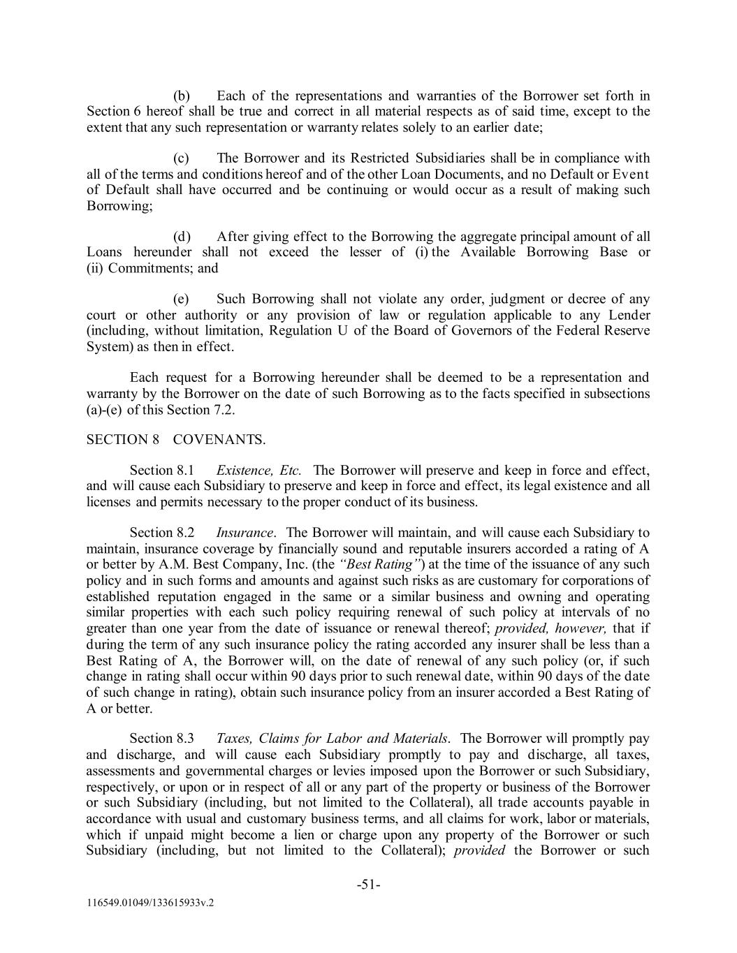 -51- 116549.01049/133615933v.2 (b) Each of the representations and warranties of the Borrower set forth in Section 6 hereof shall be true and correct in all material respects as of said time, except to the extent that any such representation or warranty relates solely to an earlier date; (c) The Borrower and its Restricted Subsidiaries shall be in compliance with all of the terms and conditions hereof and of the other Loan Documents, and no Default or Event of Default shall have occurred and be continuing or would occur as a result of making such Borrowing; (d) After giving effect to the Borrowing the aggregate principal amount of all Loans hereunder shall not exceed the lesser of (i) the Available Borrowing Base or (ii) Commitments; and (e) Such Borrowing shall not violate any order, judgment or decree of any court or other authority or any provision of law or regulation applicable to any Lender (including, without limitation, Regulation U of the Board of Governors of the Federal Reserve System) as then in effect. Each request for a Borrowing hereunder shall be deemed to be a representation and warranty by the Borrower on the date of such Borrowing as to the facts specified in subsections (a)-(e) of this Section 7.2. SECTION 8 COVENANTS. Section 8.1 Existence, Etc. The Borrower will preserve and keep in force and effect, and will cause each Subsidiary to preserve and keep in force and effect, its legal existence and all licenses and permits necessary to the proper conduct of its business. Section 8.2 Insurance. The Borrower will maintain, and will cause each Subsidiary to maintain, insurance coverage by financially sound and reputable insurers accorded a rating of A or better by A.M. Best Company, Inc. (the “Best Rating”) at the time of the issuance of any such policy and in such forms and amounts and against such risks as are customary for corporations of established reputation engaged in the same or a similar business and owning and operating similar properties with each such policy requiring renewal of such policy at intervals of no greater than one year from the date of issuance or renewal thereof; provided, however, that if during the term of any such insurance policy the rating accorded any insurer shall be less than a Best Rating of A, the Borrower will, on the date of renewal of any such policy (or, if such change in rating shall occur within 90 days prior to such renewal date, within 90 days of the date of such change in rating), obtain such insurance policy from an insurer accorded a Best Rating of A or better. Section 8.3 Taxes, Claims for Labor and Materials. The Borrower will promptly pay and discharge, and will cause each Subsidiary promptly to pay and discharge, all taxes, assessments and governmental charges or levies imposed upon the Borrower or such Subsidiary, respectively, or upon or in respect of all or any part of the property or business of the Borrower or such Subsidiary (including, but not limited to the Collateral), all trade accounts payable in accordance with usual and customary business terms, and all claims for work, labor or materials, which if unpaid might become a lien or charge upon any property of the Borrower or such Subsidiary (including, but not limited to the Collateral); provided the Borrower or such