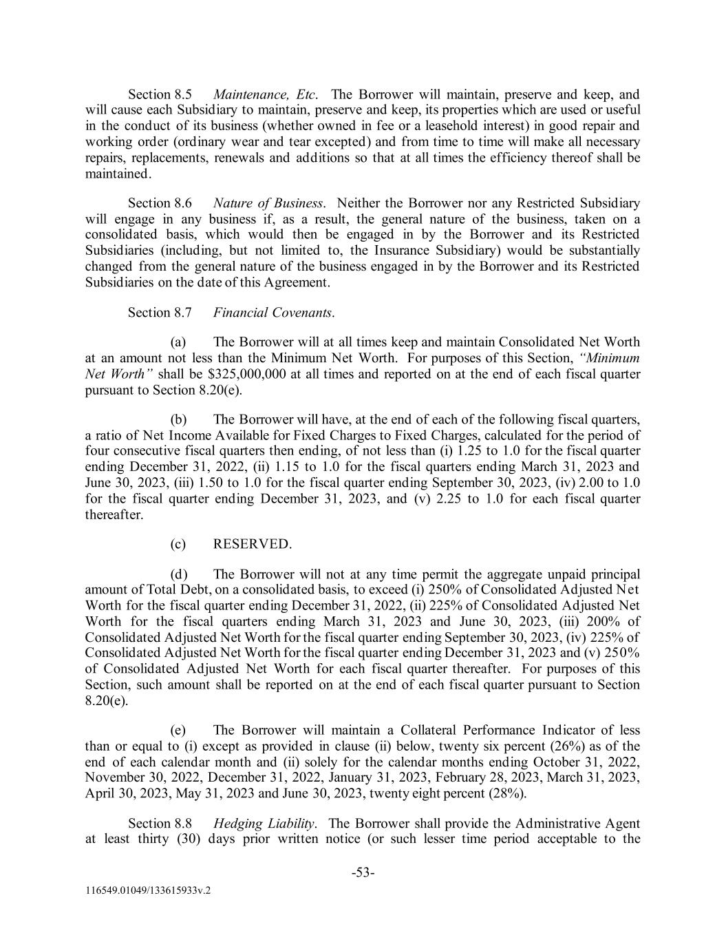 -53- 116549.01049/133615933v.2 Section 8.5 Maintenance, Etc. The Borrower will maintain, preserve and keep, and will cause each Subsidiary to maintain, preserve and keep, its properties which are used or useful in the conduct of its business (whether owned in fee or a leasehold interest) in good repair and working order (ordinary wear and tear excepted) and from time to time will make all necessary repairs, replacements, renewals and additions so that at all times the efficiency thereof shall be maintained. Section 8.6 Nature of Business. Neither the Borrower nor any Restricted Subsidiary will engage in any business if, as a result, the general nature of the business, taken on a consolidated basis, which would then be engaged in by the Borrower and its Restricted Subsidiaries (including, but not limited to, the Insurance Subsidiary) would be substantially changed from the general nature of the business engaged in by the Borrower and its Restricted Subsidiaries on the date of this Agreement. Section 8.7 Financial Covenants. (a) The Borrower will at all times keep and maintain Consolidated Net Worth at an amount not less than the Minimum Net Worth. For purposes of this Section, “Minimum Net Worth” shall be $325,000,000 at all times and reported on at the end of each fiscal quarter pursuant to Section 8.20(e). (b) The Borrower will have, at the end of each of the following fiscal quarters, a ratio of Net Income Available for Fixed Charges to Fixed Charges, calculated for the period of four consecutive fiscal quarters then ending, of not less than (i) 1.25 to 1.0 for the fiscal quarter ending December 31, 2022, (ii) 1.15 to 1.0 for the fiscal quarters ending March 31, 2023 and June 30, 2023, (iii) 1.50 to 1.0 for the fiscal quarter ending September 30, 2023, (iv) 2.00 to 1.0 for the fiscal quarter ending December 31, 2023, and (v) 2.25 to 1.0 for each fiscal quarter thereafter. (c) RESERVED. (d) The Borrower will not at any time permit the aggregate unpaid principal amount of Total Debt, on a consolidated basis, to exceed (i) 250% of Consolidated Adjusted Net Worth for the fiscal quarter ending December 31, 2022, (ii) 225% of Consolidated Adjusted Net Worth for the fiscal quarters ending March 31, 2023 and June 30, 2023, (iii) 200% of Consolidated Adjusted Net Worth for the fiscal quarter ending September 30, 2023, (iv) 225% of Consolidated Adjusted Net Worth for the fiscal quarter ending December 31, 2023 and (v) 250% of Consolidated Adjusted Net Worth for each fiscal quarter thereafter. For purposes of this Section, such amount shall be reported on at the end of each fiscal quarter pursuant to Section 8.20(e). (e) The Borrower will maintain a Collateral Performance Indicator of less than or equal to (i) except as provided in clause (ii) below, twenty six percent (26%) as of the end of each calendar month and (ii) solely for the calendar months ending October 31, 2022, November 30, 2022, December 31, 2022, January 31, 2023, February 28, 2023, March 31, 2023, April 30, 2023, May 31, 2023 and June 30, 2023, twenty eight percent (28%). Section 8.8 Hedging Liability. The Borrower shall provide the Administrative Agent at least thirty (30) days prior written notice (or such lesser time period acceptable to the