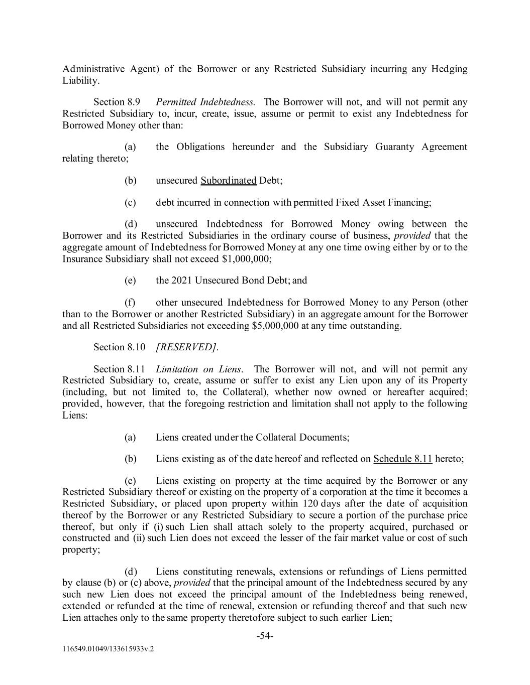 -54- 116549.01049/133615933v.2 Administrative Agent) of the Borrower or any Restricted Subsidiary incurring any Hedging Liability. Section 8.9 Permitted Indebtedness. The Borrower will not, and will not permit any Restricted Subsidiary to, incur, create, issue, assume or permit to exist any Indebtedness for Borrowed Money other than: (a) the Obligations hereunder and the Subsidiary Guaranty Agreement relating thereto; (b) unsecured Subordinated Debt; (c) debt incurred in connection with permitted Fixed Asset Financing; (d) unsecured Indebtedness for Borrowed Money owing between the Borrower and its Restricted Subsidiaries in the ordinary course of business, provided that the aggregate amount of Indebtedness for Borrowed Money at any one time owing either by or to the Insurance Subsidiary shall not exceed $1,000,000; (e) the 2021 Unsecured Bond Debt; and (f) other unsecured Indebtedness for Borrowed Money to any Person (other than to the Borrower or another Restricted Subsidiary) in an aggregate amount for the Borrower and all Restricted Subsidiaries not exceeding $5,000,000 at any time outstanding. Section 8.10 [RESERVED]. Section 8.11 Limitation on Liens. The Borrower will not, and will not permit any Restricted Subsidiary to, create, assume or suffer to exist any Lien upon any of its Property (including, but not limited to, the Collateral), whether now owned or hereafter acquired; provided, however, that the foregoing restriction and limitation shall not apply to the following Liens: (a) Liens created under the Collateral Documents; (b) Liens existing as of the date hereof and reflected on Schedule 8.11 hereto; (c) Liens existing on property at the time acquired by the Borrower or any Restricted Subsidiary thereof or existing on the property of a corporation at the time it becomes a Restricted Subsidiary, or placed upon property within 120 days after the date of acquisition thereof by the Borrower or any Restricted Subsidiary to secure a portion of the purchase price thereof, but only if (i) such Lien shall attach solely to the property acquired, purchased or constructed and (ii) such Lien does not exceed the lesser of the fair market value or cost of such property; (d) Liens constituting renewals, extensions or refundings of Liens permitted by clause (b) or (c) above, provided that the principal amount of the Indebtedness secured by any such new Lien does not exceed the principal amount of the Indebtedness being renewed, extended or refunded at the time of renewal, extension or refunding thereof and that such new Lien attaches only to the same property theretofore subject to such earlier Lien;