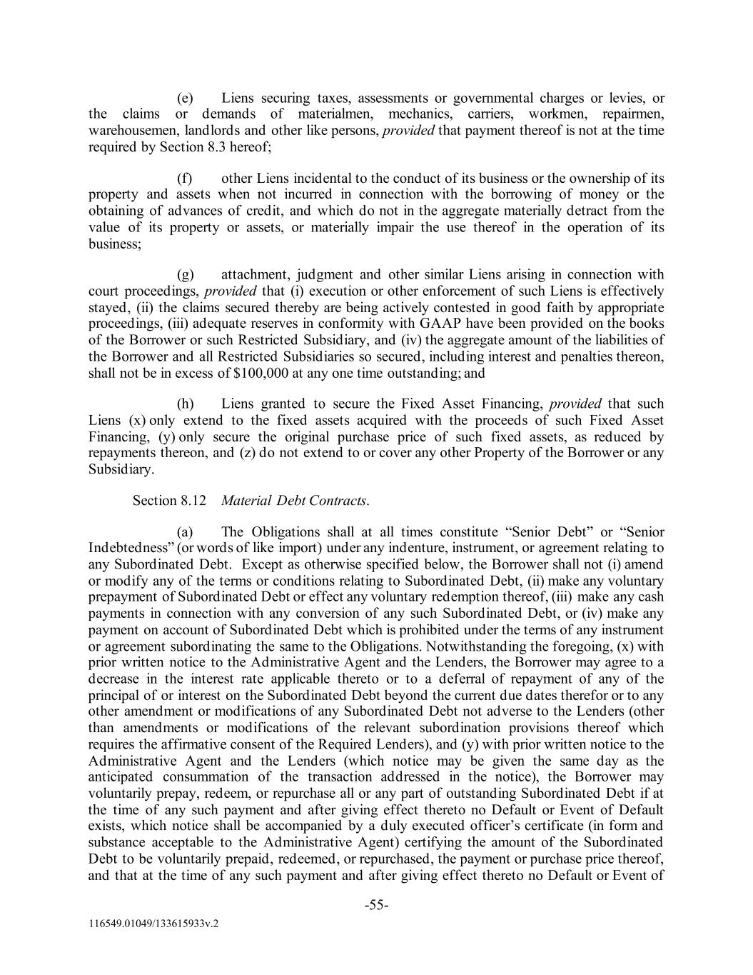 -55- 116549.01049/133615933v.2 (e) Liens securing taxes, assessments or governmental charges or levies, or the claims or demands of materialmen, mechanics, carriers, workmen, repairmen, warehousemen, landlords and other like persons, provided that payment thereof is not at the time required by Section 8.3 hereof; (f) other Liens incidental to the conduct of its business or the ownership of its property and assets when not incurred in connection with the borrowing of money or the obtaining of advances of credit, and which do not in the aggregate materially detract from the value of its property or assets, or materially impair the use thereof in the operation of its business; (g) attachment, judgment and other similar Liens arising in connection with court proceedings, provided that (i) execution or other enforcement of such Liens is effectively stayed, (ii) the claims secured thereby are being actively contested in good faith by appropriate proceedings, (iii) adequate reserves in conformity with GAAP have been provided on the books of the Borrower or such Restricted Subsidiary, and (iv) the aggregate amount of the liabilities of the Borrower and all Restricted Subsidiaries so secured, including interest and penalties thereon, shall not be in excess of $100,000 at any one time outstanding; and (h) Liens granted to secure the Fixed Asset Financing, provided that such Liens (x) only extend to the fixed assets acquired with the proceeds of such Fixed Asset Financing, (y) only secure the original purchase price of such fixed assets, as reduced by repayments thereon, and (z) do not extend to or cover any other Property of the Borrower or any Subsidiary. Section 8.12 Material Debt Contracts. (a) The Obligations shall at all times constitute “Senior Debt” or “Senior Indebtedness” (or words of like import) under any indenture, instrument, or agreement relating to any Subordinated Debt. Except as otherwise specified below, the Borrower shall not (i) amend or modify any of the terms or conditions relating to Subordinated Debt, (ii) make any voluntary prepayment of Subordinated Debt or effect any voluntary redemption thereof, (iii) make any cash payments in connection with any conversion of any such Subordinated Debt, or (iv) make any payment on account of Subordinated Debt which is prohibited under the terms of any instrument or agreement subordinating the same to the Obligations. Notwithstanding the foregoing, (x) with prior written notice to the Administrative Agent and the Lenders, the Borrower may agree to a decrease in the interest rate applicable thereto or to a deferral of repayment of any of the principal of or interest on the Subordinated Debt beyond the current due dates therefor or to any other amendment or modifications of any Subordinated Debt not adverse to the Lenders (other than amendments or modifications of the relevant subordination provisions thereof which requires the affirmative consent of the Required Lenders), and (y) with prior written notice to the Administrative Agent and the Lenders (which notice may be given the same day as the anticipated consummation of the transaction addressed in the notice), the Borrower may voluntarily prepay, redeem, or repurchase all or any part of outstanding Subordinated Debt if at the time of any such payment and after giving effect thereto no Default or Event of Default exists, which notice shall be accompanied by a duly executed officer’s certificate (in form and substance acceptable to the Administrative Agent) certifying the amount of the Subordinated Debt to be voluntarily prepaid, redeemed, or repurchased, the payment or purchase price thereof, and that at the time of any such payment and after giving effect thereto no Default or Event of