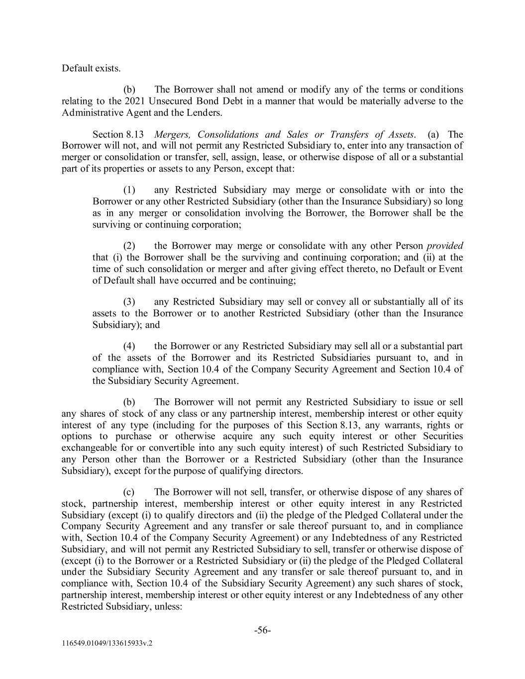 -56- 116549.01049/133615933v.2 Default exists. (b) The Borrower shall not amend or modify any of the terms or conditions relating to the 2021 Unsecured Bond Debt in a manner that would be materially adverse to the Administrative Agent and the Lenders. Section 8.13 Mergers, Consolidations and Sales or Transfers of Assets. (a) The Borrower will not, and will not permit any Restricted Subsidiary to, enter into any transaction of merger or consolidation or transfer, sell, assign, lease, or otherwise dispose of all or a substantial part of its properties or assets to any Person, except that: (1) any Restricted Subsidiary may merge or consolidate with or into the Borrower or any other Restricted Subsidiary (other than the Insurance Subsidiary) so long as in any merger or consolidation involving the Borrower, the Borrower shall be the surviving or continuing corporation; (2) the Borrower may merge or consolidate with any other Person provided that (i) the Borrower shall be the surviving and continuing corporation; and (ii) at the time of such consolidation or merger and after giving effect thereto, no Default or Event of Default shall have occurred and be continuing; (3) any Restricted Subsidiary may sell or convey all or substantially all of its assets to the Borrower or to another Restricted Subsidiary (other than the Insurance Subsidiary); and (4) the Borrower or any Restricted Subsidiary may sell all or a substantial part of the assets of the Borrower and its Restricted Subsidiaries pursuant to, and in compliance with, Section 10.4 of the Company Security Agreement and Section 10.4 of the Subsidiary Security Agreement. (b) The Borrower will not permit any Restricted Subsidiary to issue or sell any shares of stock of any class or any partnership interest, membership interest or other equity interest of any type (including for the purposes of this Section 8.13, any warrants, rights or options to purchase or otherwise acquire any such equity interest or other Securities exchangeable for or convertible into any such equity interest) of such Restricted Subsidiary to any Person other than the Borrower or a Restricted Subsidiary (other than the Insurance Subsidiary), except for the purpose of qualifying directors. (c) The Borrower will not sell, transfer, or otherwise dispose of any shares of stock, partnership interest, membership interest or other equity interest in any Restricted Subsidiary (except (i) to qualify directors and (ii) the pledge of the Pledged Collateral under the Company Security Agreement and any transfer or sale thereof pursuant to, and in compliance with, Section 10.4 of the Company Security Agreement) or any Indebtedness of any Restricted Subsidiary, and will not permit any Restricted Subsidiary to sell, transfer or otherwise dispose of (except (i) to the Borrower or a Restricted Subsidiary or (ii) the pledge of the Pledged Collateral under the Subsidiary Security Agreement and any transfer or sale thereof pursuant to, and in compliance with, Section 10.4 of the Subsidiary Security Agreement) any such shares of stock, partnership interest, membership interest or other equity interest or any Indebtedness of any other Restricted Subsidiary, unless: