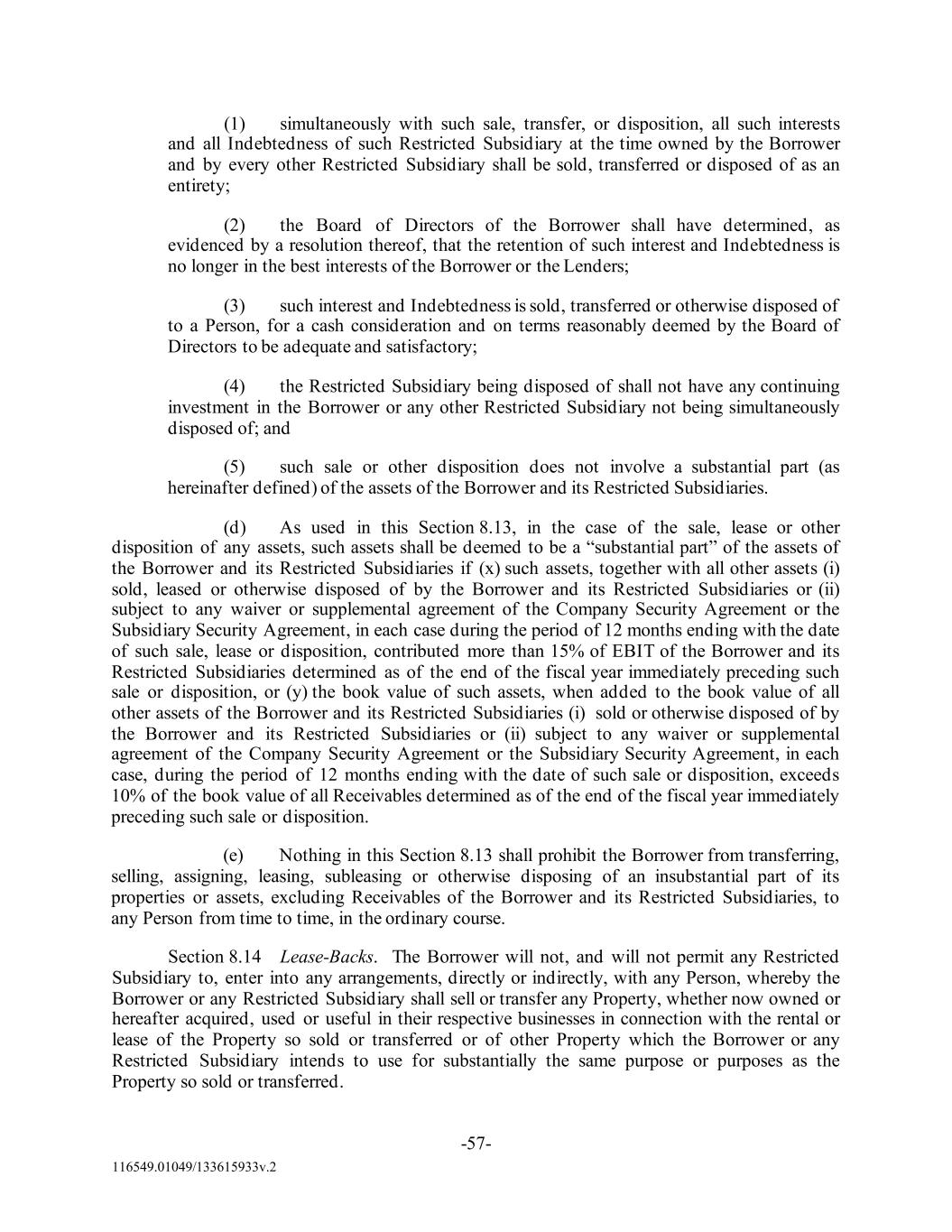 -57- 116549.01049/133615933v.2 (1) simultaneously with such sale, transfer, or disposition, all such interests and all Indebtedness of such Restricted Subsidiary at the time owned by the Borrower and by every other Restricted Subsidiary shall be sold, transferred or disposed of as an entirety; (2) the Board of Directors of the Borrower shall have determined, as evidenced by a resolution thereof, that the retention of such interest and Indebtedness is no longer in the best interests of the Borrower or the Lenders; (3) such interest and Indebtedness is sold, transferred or otherwise disposed of to a Person, for a cash consideration and on terms reasonably deemed by the Board of Directors to be adequate and satisfactory; (4) the Restricted Subsidiary being disposed of shall not have any continuing investment in the Borrower or any other Restricted Subsidiary not being simultaneously disposed of; and (5) such sale or other disposition does not involve a substantial part (as hereinafter defined) of the assets of the Borrower and its Restricted Subsidiaries. (d) As used in this Section 8.13, in the case of the sale, lease or other disposition of any assets, such assets shall be deemed to be a “substantial part” of the assets of the Borrower and its Restricted Subsidiaries if (x) such assets, together with all other assets (i) sold, leased or otherwise disposed of by the Borrower and its Restricted Subsidiaries or (ii) subject to any waiver or supplemental agreement of the Company Security Agreement or the Subsidiary Security Agreement, in each case during the period of 12 months ending with the date of such sale, lease or disposition, contributed more than 15% of EBIT of the Borrower and its Restricted Subsidiaries determined as of the end of the fiscal year immediately preceding such sale or disposition, or (y) the book value of such assets, when added to the book value of all other assets of the Borrower and its Restricted Subsidiaries (i) sold or otherwise disposed of by the Borrower and its Restricted Subsidiaries or (ii) subject to any waiver or supplemental agreement of the Company Security Agreement or the Subsidiary Security Agreement, in each case, during the period of 12 months ending with the date of such sale or disposition, exceeds 10% of the book value of all Receivables determined as of the end of the fiscal year immediately preceding such sale or disposition. (e) Nothing in this Section 8.13 shall prohibit the Borrower from transferring, selling, assigning, leasing, subleasing or otherwise disposing of an insubstantial part of its properties or assets, excluding Receivables of the Borrower and its Restricted Subsidiaries, to any Person from time to time, in the ordinary course. Section 8.14 Lease-Backs. The Borrower will not, and will not permit any Restricted Subsidiary to, enter into any arrangements, directly or indirectly, with any Person, whereby the Borrower or any Restricted Subsidiary shall sell or transfer any Property, whether now owned or hereafter acquired, used or useful in their respective businesses in connection with the rental or lease of the Property so sold or transferred or of other Property which the Borrower or any Restricted Subsidiary intends to use for substantially the same purpose or purposes as the Property so sold or transferred.