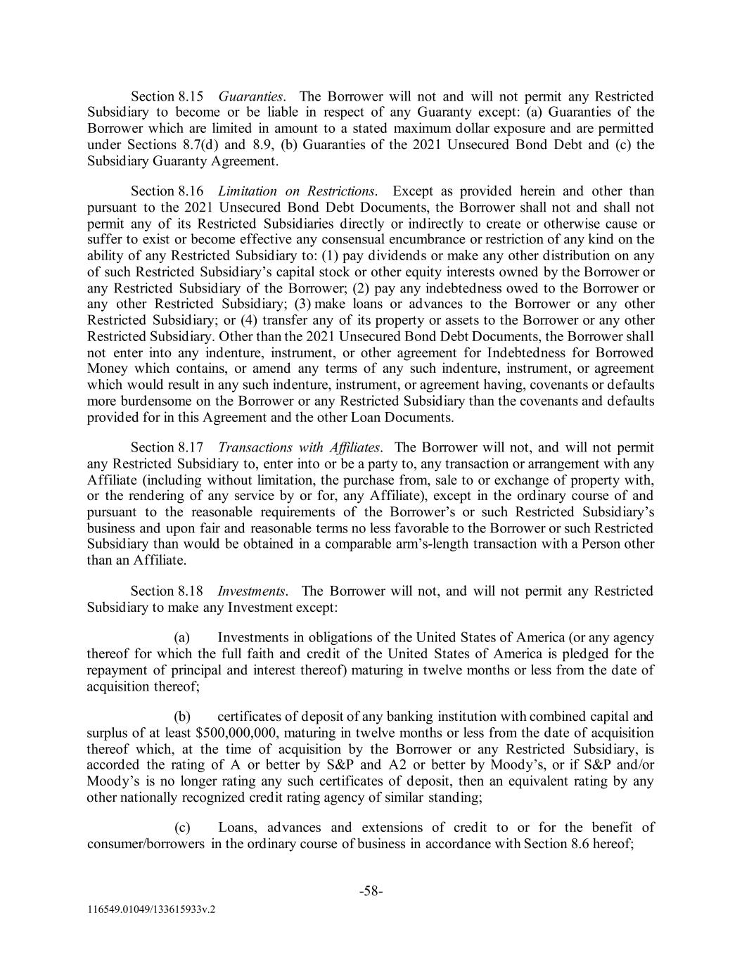 -58- 116549.01049/133615933v.2 Section 8.15 Guaranties. The Borrower will not and will not permit any Restricted Subsidiary to become or be liable in respect of any Guaranty except: (a) Guaranties of the Borrower which are limited in amount to a stated maximum dollar exposure and are permitted under Sections 8.7(d) and 8.9, (b) Guaranties of the 2021 Unsecured Bond Debt and (c) the Subsidiary Guaranty Agreement. Section 8.16 Limitation on Restrictions. Except as provided herein and other than pursuant to the 2021 Unsecured Bond Debt Documents, the Borrower shall not and shall not permit any of its Restricted Subsidiaries directly or indirectly to create or otherwise cause or suffer to exist or become effective any consensual encumbrance or restriction of any kind on the ability of any Restricted Subsidiary to: (1) pay dividends or make any other distribution on any of such Restricted Subsidiary’s capital stock or other equity interests owned by the Borrower or any Restricted Subsidiary of the Borrower; (2) pay any indebtedness owed to the Borrower or any other Restricted Subsidiary; (3) make loans or advances to the Borrower or any other Restricted Subsidiary; or (4) transfer any of its property or assets to the Borrower or any other Restricted Subsidiary. Other than the 2021 Unsecured Bond Debt Documents, the Borrower shall not enter into any indenture, instrument, or other agreement for Indebtedness for Borrowed Money which contains, or amend any terms of any such indenture, instrument, or agreement which would result in any such indenture, instrument, or agreement having, covenants or defaults more burdensome on the Borrower or any Restricted Subsidiary than the covenants and defaults provided for in this Agreement and the other Loan Documents. Section 8.17 Transactions with Affiliates. The Borrower will not, and will not permit any Restricted Subsidiary to, enter into or be a party to, any transaction or arrangement with any Affiliate (including without limitation, the purchase from, sale to or exchange of property with, or the rendering of any service by or for, any Affiliate), except in the ordinary course of and pursuant to the reasonable requirements of the Borrower’s or such Restricted Subsidiary’s business and upon fair and reasonable terms no less favorable to the Borrower or such Restricted Subsidiary than would be obtained in a comparable arm’s-length transaction with a Person other than an Affiliate. Section 8.18 Investments. The Borrower will not, and will not permit any Restricted Subsidiary to make any Investment except: (a) Investments in obligations of the United States of America (or any agency thereof for which the full faith and credit of the United States of America is pledged for the repayment of principal and interest thereof) maturing in twelve months or less from the date of acquisition thereof; (b) certificates of deposit of any banking institution with combined capital and surplus of at least $500,000,000, maturing in twelve months or less from the date of acquisition thereof which, at the time of acquisition by the Borrower or any Restricted Subsidiary, is accorded the rating of A or better by S&P and A2 or better by Moody’s, or if S&P and/or Moody’s is no longer rating any such certificates of deposit, then an equivalent rating by any other nationally recognized credit rating agency of similar standing; (c) Loans, advances and extensions of credit to or for the benefit of consumer/borrowers in the ordinary course of business in accordance with Section 8.6 hereof;