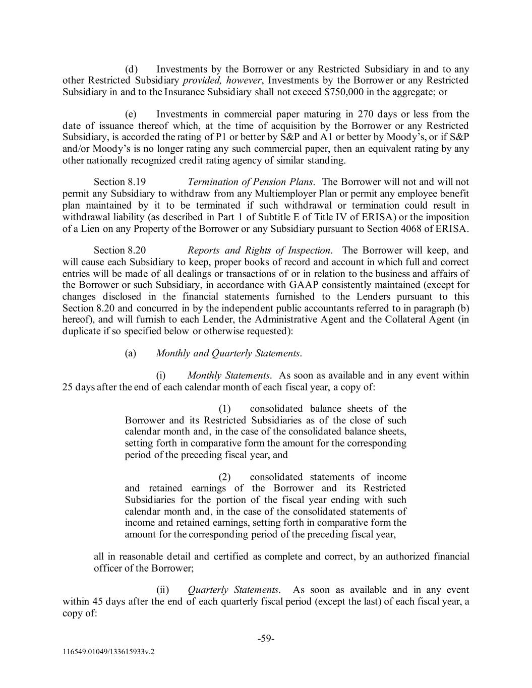 -59- 116549.01049/133615933v.2 (d) Investments by the Borrower or any Restricted Subsidiary in and to any other Restricted Subsidiary provided, however, Investments by the Borrower or any Restricted Subsidiary in and to the Insurance Subsidiary shall not exceed $750,000 in the aggregate; or (e) Investments in commercial paper maturing in 270 days or less from the date of issuance thereof which, at the time of acquisition by the Borrower or any Restricted Subsidiary, is accorded the rating of P1 or better by S&P and A1 or better by Moody’s, or if S&P and/or Moody’s is no longer rating any such commercial paper, then an equivalent rating by any other nationally recognized credit rating agency of similar standing. Section 8.19 Termination of Pension Plans. The Borrower will not and will not permit any Subsidiary to withdraw from any Multiemployer Plan or permit any employee benefit plan maintained by it to be terminated if such withdrawal or termination could result in withdrawal liability (as described in Part 1 of Subtitle E of Title IV of ERISA) or the imposition of a Lien on any Property of the Borrower or any Subsidiary pursuant to Section 4068 of ERISA. Section 8.20 Reports and Rights of Inspection. The Borrower will keep, and will cause each Subsidiary to keep, proper books of record and account in which full and correct entries will be made of all dealings or transactions of or in relation to the business and affairs of the Borrower or such Subsidiary, in accordance with GAAP consistently maintained (except for changes disclosed in the financial statements furnished to the Lenders pursuant to this Section 8.20 and concurred in by the independent public accountants referred to in paragraph (b) hereof), and will furnish to each Lender, the Administrative Agent and the Collateral Agent (in duplicate if so specified below or otherwise requested): (a) Monthly and Quarterly Statements. (i) Monthly Statements. As soon as available and in any event within 25 days after the end of each calendar month of each fiscal year, a copy of: (1) consolidated balance sheets of the Borrower and its Restricted Subsidiaries as of the close of such calendar month and, in the case of the consolidated balance sheets, setting forth in comparative form the amount for the corresponding period of the preceding fiscal year, and (2) consolidated statements of income and retained earnings of the Borrower and its Restricted Subsidiaries for the portion of the fiscal year ending with such calendar month and, in the case of the consolidated statements of income and retained earnings, setting forth in comparative form the amount for the corresponding period of the preceding fiscal year, all in reasonable detail and certified as complete and correct, by an authorized financial officer of the Borrower; (ii) Quarterly Statements. As soon as available and in any event within 45 days after the end of each quarterly fiscal period (except the last) of each fiscal year, a copy of: