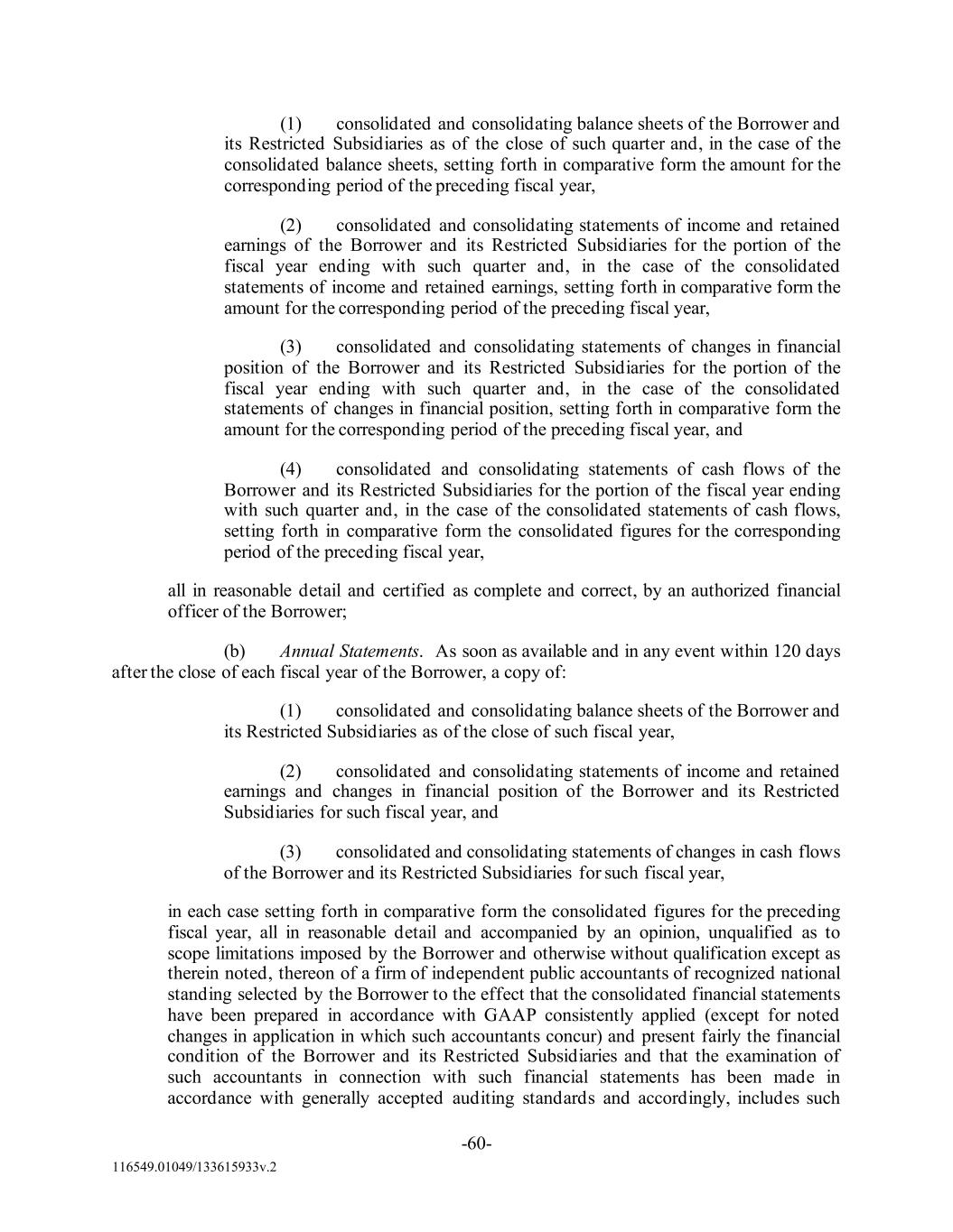 -60- 116549.01049/133615933v.2 (1) consolidated and consolidating balance sheets of the Borrower and its Restricted Subsidiaries as of the close of such quarter and, in the case of the consolidated balance sheets, setting forth in comparative form the amount for the corresponding period of the preceding fiscal year, (2) consolidated and consolidating statements of income and retained earnings of the Borrower and its Restricted Subsidiaries for the portion of the fiscal year ending with such quarter and, in the case of the consolidated statements of income and retained earnings, setting forth in comparative form the amount for the corresponding period of the preceding fiscal year, (3) consolidated and consolidating statements of changes in financial position of the Borrower and its Restricted Subsidiaries for the portion of the fiscal year ending with such quarter and, in the case of the consolidated statements of changes in financial position, setting forth in comparative form the amount for the corresponding period of the preceding fiscal year, and (4) consolidated and consolidating statements of cash flows of the Borrower and its Restricted Subsidiaries for the portion of the fiscal year ending with such quarter and, in the case of the consolidated statements of cash flows, setting forth in comparative form the consolidated figures for the corresponding period of the preceding fiscal year, all in reasonable detail and certified as complete and correct, by an authorized financial officer of the Borrower; (b) Annual Statements. As soon as available and in any event within 120 days after the close of each fiscal year of the Borrower, a copy of: (1) consolidated and consolidating balance sheets of the Borrower and its Restricted Subsidiaries as of the close of such fiscal year, (2) consolidated and consolidating statements of income and retained earnings and changes in financial position of the Borrower and its Restricted Subsidiaries for such fiscal year, and (3) consolidated and consolidating statements of changes in cash flows of the Borrower and its Restricted Subsidiaries for such fiscal year, in each case setting forth in comparative form the consolidated figures for the preceding fiscal year, all in reasonable detail and accompanied by an opinion, unqualified as to scope limitations imposed by the Borrower and otherwise without qualification except as therein noted, thereon of a firm of independent public accountants of recognized national standing selected by the Borrower to the effect that the consolidated financial statements have been prepared in accordance with GAAP consistently applied (except for noted changes in application in which such accountants concur) and present fairly the financial condition of the Borrower and its Restricted Subsidiaries and that the examination of such accountants in connection with such financial statements has been made in accordance with generally accepted auditing standards and accordingly, includes such