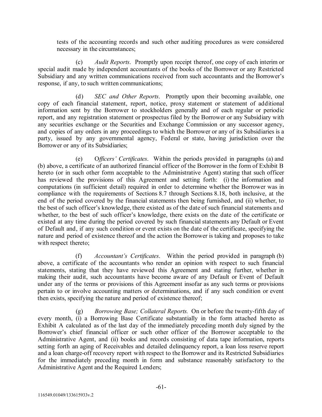 -61- 116549.01049/133615933v.2 tests of the accounting records and such other auditing procedures as were considered necessary in the circumstances; (c) Audit Reports. Promptly upon receipt thereof, one copy of each interim or special audit made by independent accountants of the books of the Borrower or any Restricted Subsidiary and any written communications received from such accountants and the Borrower’s response, if any, to such written communications; (d) SEC and Other Reports. Promptly upon their becoming available, one copy of each financial statement, report, notice, proxy statement or statement of additional information sent by the Borrower to stockholders generally and of each regular or periodic report, and any registration statement or prospectus filed by the Borrower or any Subsidiary with any securities exchange or the Securities and Exchange Commission or any successor agency, and copies of any orders in any proceedings to which the Borrower or any of its Subsidiaries is a party, issued by any governmental agency, Federal or state, having jurisdiction over the Borrower or any of its Subsidiaries; (e) Officers’ Certificates. Within the periods provided in paragraphs (a) and (b) above, a certificate of an authorized financial officer of the Borrower in the form of Exhibit B hereto (or in such other form acceptable to the Administrative Agent) stating that such officer has reviewed the provisions of this Agreement and setting forth: (i) the information and computations (in sufficient detail) required in order to determine whether the Borrower was in compliance with the requirements of Sections 8.7 through Sections 8.18, both inclusive, at the end of the period covered by the financial statements then being furnished, and (ii) whether, to the best of such officer’s knowledge, there existed as of the date of such financial statements and whether, to the best of such officer’s knowledge, there exists on the date of the certificate or existed at any time during the period covered by such financial statements any Default or Event of Default and, if any such condition or event exists on the date of the certificate, specifying the nature and period of existence thereof and the action the Borrower is taking and proposes to take with respect thereto; (f) Accountant’s Certificates. Within the period provided in paragraph (b) above, a certificate of the accountants who render an opinion with respect to such financial statements, stating that they have reviewed this Agreement and stating further, whether in making their audit, such accountants have become aware of any Default or Event of Default under any of the terms or provisions of this Agreement insofar as any such terms or provisions pertain to or involve accounting matters or determinations, and if any such condition or event then exists, specifying the nature and period of existence thereof; (g) Borrowing Base; Collateral Reports. On or before the twenty-fifth day of every month, (i) a Borrowing Base Certificate substantially in the form attached hereto as Exhibit A calculated as of the last day of the immediately preceding month duly signed by the Borrower’s chief financial officer or such other officer of the Borrower acceptable to the Administrative Agent, and (ii) books and records consisting of data tape information, reports setting forth an aging of Receivables and detailed delinquency report, a loan loss reserve report and a loan charge-off recovery report with respect to the Borrower and its Restricted Subsidiaries for the immediately preceding month in form and substance reasonably satisfactory to the Administrative Agent and the Required Lenders;