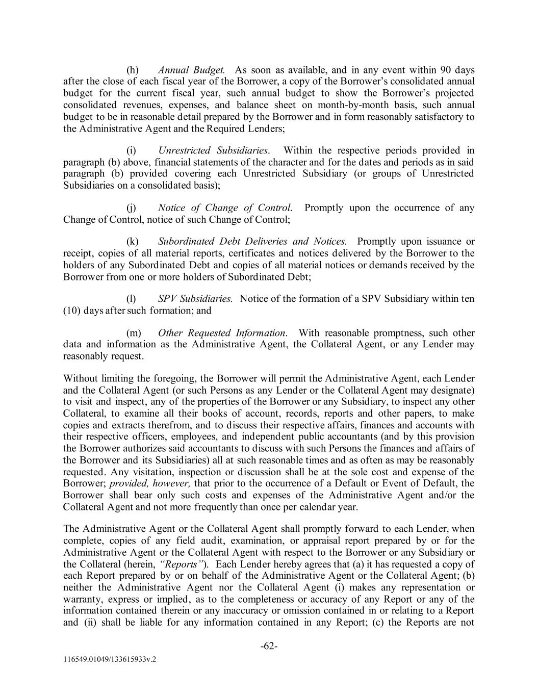 -62- 116549.01049/133615933v.2 (h) Annual Budget. As soon as available, and in any event within 90 days after the close of each fiscal year of the Borrower, a copy of the Borrower’s consolidated annual budget for the current fiscal year, such annual budget to show the Borrower’s projected consolidated revenues, expenses, and balance sheet on month-by-month basis, such annual budget to be in reasonable detail prepared by the Borrower and in form reasonably satisfactory to the Administrative Agent and the Required Lenders; (i) Unrestricted Subsidiaries. Within the respective periods provided in paragraph (b) above, financial statements of the character and for the dates and periods as in said paragraph (b) provided covering each Unrestricted Subsidiary (or groups of Unrestricted Subsidiaries on a consolidated basis); (j) Notice of Change of Control. Promptly upon the occurrence of any Change of Control, notice of such Change of Control; (k) Subordinated Debt Deliveries and Notices. Promptly upon issuance or receipt, copies of all material reports, certificates and notices delivered by the Borrower to the holders of any Subordinated Debt and copies of all material notices or demands received by the Borrower from one or more holders of Subordinated Debt; (l) SPV Subsidiaries. Notice of the formation of a SPV Subsidiary within ten (10) days after such formation; and (m) Other Requested Information. With reasonable promptness, such other data and information as the Administrative Agent, the Collateral Agent, or any Lender may reasonably request. Without limiting the foregoing, the Borrower will permit the Administrative Agent, each Lender and the Collateral Agent (or such Persons as any Lender or the Collateral Agent may designate) to visit and inspect, any of the properties of the Borrower or any Subsidiary, to inspect any other Collateral, to examine all their books of account, records, reports and other papers, to make copies and extracts therefrom, and to discuss their respective affairs, finances and accounts with their respective officers, employees, and independent public accountants (and by this provision the Borrower authorizes said accountants to discuss with such Persons the finances and affairs of the Borrower and its Subsidiaries) all at such reasonable times and as often as may be reasonably requested. Any visitation, inspection or discussion shall be at the sole cost and expense of the Borrower; provided, however, that prior to the occurrence of a Default or Event of Default, the Borrower shall bear only such costs and expenses of the Administrative Agent and/or the Collateral Agent and not more frequently than once per calendar year. The Administrative Agent or the Collateral Agent shall promptly forward to each Lender, when complete, copies of any field audit, examination, or appraisal report prepared by or for the Administrative Agent or the Collateral Agent with respect to the Borrower or any Subsidiary or the Collateral (herein, “Reports”). Each Lender hereby agrees that (a) it has requested a copy of each Report prepared by or on behalf of the Administrative Agent or the Collateral Agent; (b) neither the Administrative Agent nor the Collateral Agent (i) makes any representation or warranty, express or implied, as to the completeness or accuracy of any Report or any of the information contained therein or any inaccuracy or omission contained in or relating to a Report and (ii) shall be liable for any information contained in any Report; (c) the Reports are not