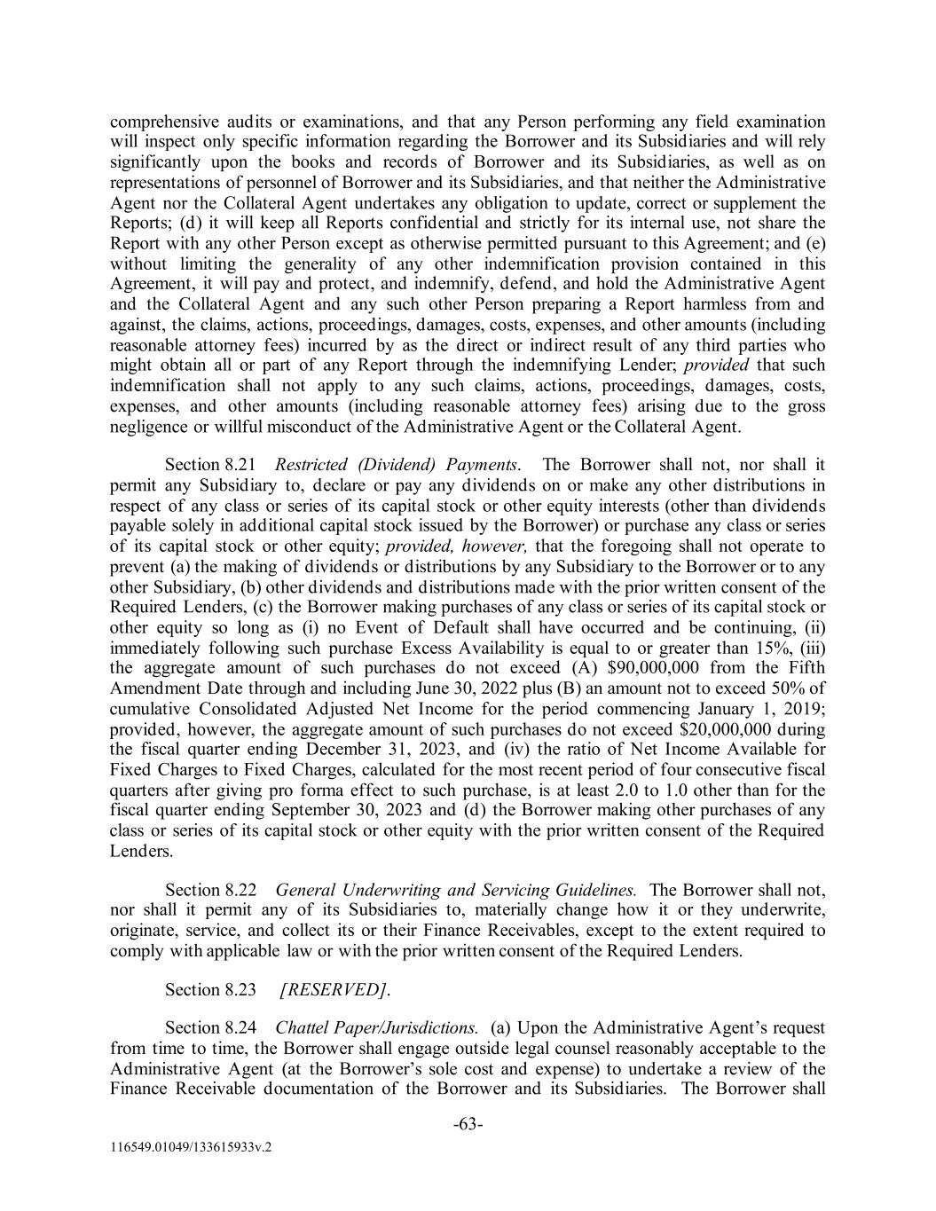 -63- 116549.01049/133615933v.2 comprehensive audits or examinations, and that any Person performing any field examination will inspect only specific information regarding the Borrower and its Subsidiaries and will rely significantly upon the books and records of Borrower and its Subsidiaries, as well as on representations of personnel of Borrower and its Subsidiaries, and that neither the Administrative Agent nor the Collateral Agent undertakes any obligation to update, correct or supplement the Reports; (d) it will keep all Reports confidential and strictly for its internal use, not share the Report with any other Person except as otherwise permitted pursuant to this Agreement; and (e) without limiting the generality of any other indemnification provision contained in this Agreement, it will pay and protect, and indemnify, defend, and hold the Administrative Agent and the Collateral Agent and any such other Person preparing a Report harmless from and against, the claims, actions, proceedings, damages, costs, expenses, and other amounts (including reasonable attorney fees) incurred by as the direct or indirect result of any third parties who might obtain all or part of any Report through the indemnifying Lender; provided that such indemnification shall not apply to any such claims, actions, proceedings, damages, costs, expenses, and other amounts (including reasonable attorney fees) arising due to the gross negligence or willful misconduct of the Administrative Agent or the Collateral Agent. Section 8.21 Restricted (Dividend) Payments. The Borrower shall not, nor shall it permit any Subsidiary to, declare or pay any dividends on or make any other distributions in respect of any class or series of its capital stock or other equity interests (other than dividends payable solely in additional capital stock issued by the Borrower) or purchase any class or series of its capital stock or other equity; provided, however, that the foregoing shall not operate to prevent (a) the making of dividends or distributions by any Subsidiary to the Borrower or to any other Subsidiary, (b) other dividends and distributions made with the prior written consent of the Required Lenders, (c) the Borrower making purchases of any class or series of its capital stock or other equity so long as (i) no Event of Default shall have occurred and be continuing, (ii) immediately following such purchase Excess Availability is equal to or greater than 15%, (iii) the aggregate amount of such purchases do not exceed (A) $90,000,000 from the Fifth Amendment Date through and including June 30, 2022 plus (B) an amount not to exceed 50% of cumulative Consolidated Adjusted Net Income for the period commencing January 1, 2019; provided, however, the aggregate amount of such purchases do not exceed $20,000,000 during the fiscal quarter ending December 31, 2023, and (iv) the ratio of Net Income Available for Fixed Charges to Fixed Charges, calculated for the most recent period of four consecutive fiscal quarters after giving pro forma effect to such purchase, is at least 2.0 to 1.0 other than for the fiscal quarter ending September 30, 2023 and (d) the Borrower making other purchases of any class or series of its capital stock or other equity with the prior written consent of the Required Lenders. Section 8.22 General Underwriting and Servicing Guidelines. The Borrower shall not, nor shall it permit any of its Subsidiaries to, materially change how it or they underwrite, originate, service, and collect its or their Finance Receivables, except to the extent required to comply with applicable law or with the prior written consent of the Required Lenders. Section 8.23 [RESERVED]. Section 8.24 Chattel Paper/Jurisdictions. (a) Upon the Administrative Agent’s request from time to time, the Borrower shall engage outside legal counsel reasonably acceptable to the Administrative Agent (at the Borrower’s sole cost and expense) to undertake a review of the Finance Receivable documentation of the Borrower and its Subsidiaries. The Borrower shall