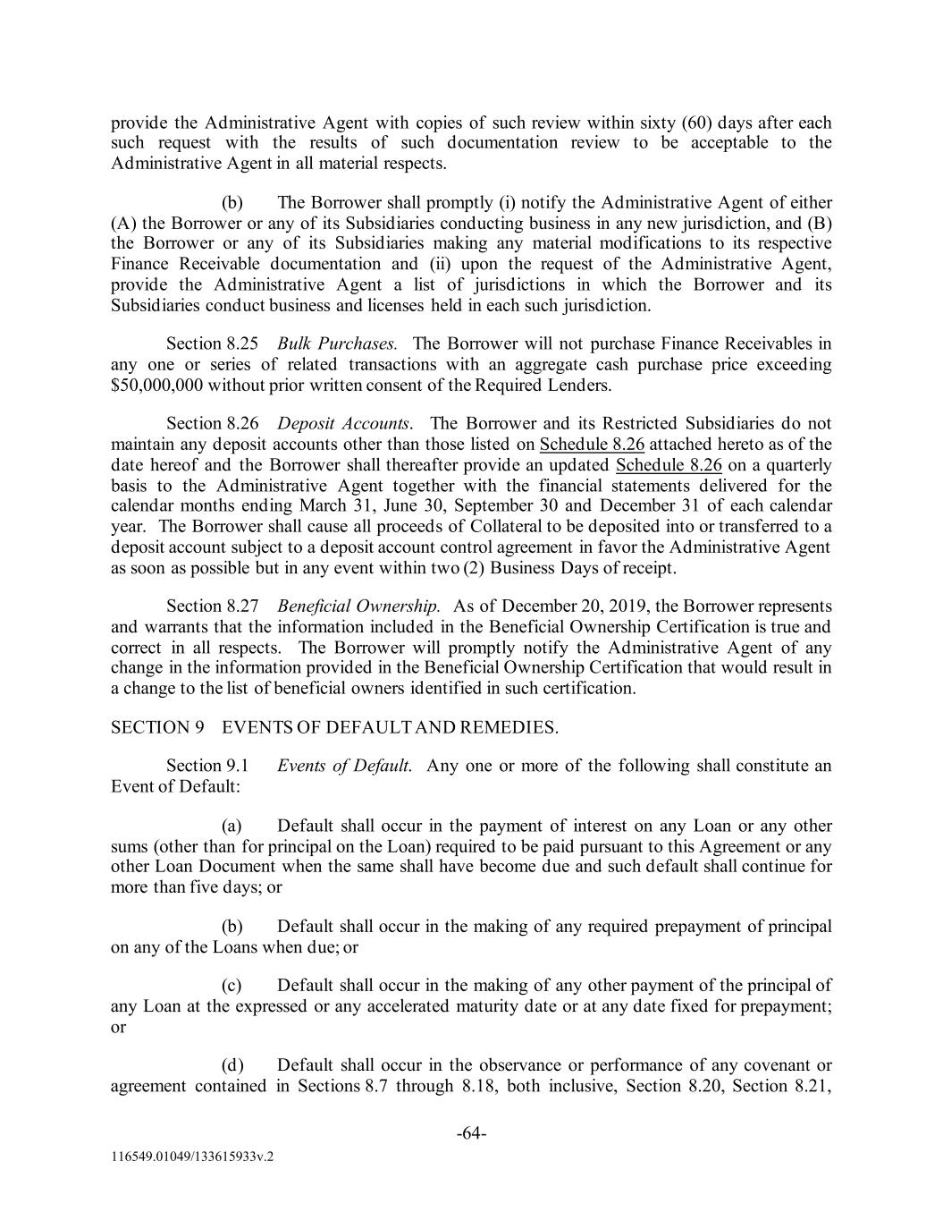 -64- 116549.01049/133615933v.2 provide the Administrative Agent with copies of such review within sixty (60) days after each such request with the results of such documentation review to be acceptable to the Administrative Agent in all material respects. (b) The Borrower shall promptly (i) notify the Administrative Agent of either (A) the Borrower or any of its Subsidiaries conducting business in any new jurisdiction, and (B) the Borrower or any of its Subsidiaries making any material modifications to its respective Finance Receivable documentation and (ii) upon the request of the Administrative Agent, provide the Administrative Agent a list of jurisdictions in which the Borrower and its Subsidiaries conduct business and licenses held in each such jurisdiction. Section 8.25 Bulk Purchases. The Borrower will not purchase Finance Receivables in any one or series of related transactions with an aggregate cash purchase price exceeding $50,000,000 without prior written consent of the Required Lenders. Section 8.26 Deposit Accounts. The Borrower and its Restricted Subsidiaries do not maintain any deposit accounts other than those listed on Schedule 8.26 attached hereto as of the date hereof and the Borrower shall thereafter provide an updated Schedule 8.26 on a quarterly basis to the Administrative Agent together with the financial statements delivered for the calendar months ending March 31, June 30, September 30 and December 31 of each calendar year. The Borrower shall cause all proceeds of Collateral to be deposited into or transferred to a deposit account subject to a deposit account control agreement in favor the Administrative Agent as soon as possible but in any event within two (2) Business Days of receipt. Section 8.27 Beneficial Ownership. As of December 20, 2019, the Borrower represents and warrants that the information included in the Beneficial Ownership Certification is true and correct in all respects. The Borrower will promptly notify the Administrative Agent of any change in the information provided in the Beneficial Ownership Certification that would result in a change to the list of beneficial owners identified in such certification. SECTION 9 EVENTS OF DEFAULT AND REMEDIES. Section 9.1 Events of Default. Any one or more of the following shall constitute an Event of Default: (a) Default shall occur in the payment of interest on any Loan or any other sums (other than for principal on the Loan) required to be paid pursuant to this Agreement or any other Loan Document when the same shall have become due and such default shall continue for more than five days; or (b) Default shall occur in the making of any required prepayment of principal on any of the Loans when due; or (c) Default shall occur in the making of any other payment of the principal of any Loan at the expressed or any accelerated maturity date or at any date fixed for prepayment; or (d) Default shall occur in the observance or performance of any covenant or agreement contained in Sections 8.7 through 8.18, both inclusive, Section 8.20, Section 8.21,