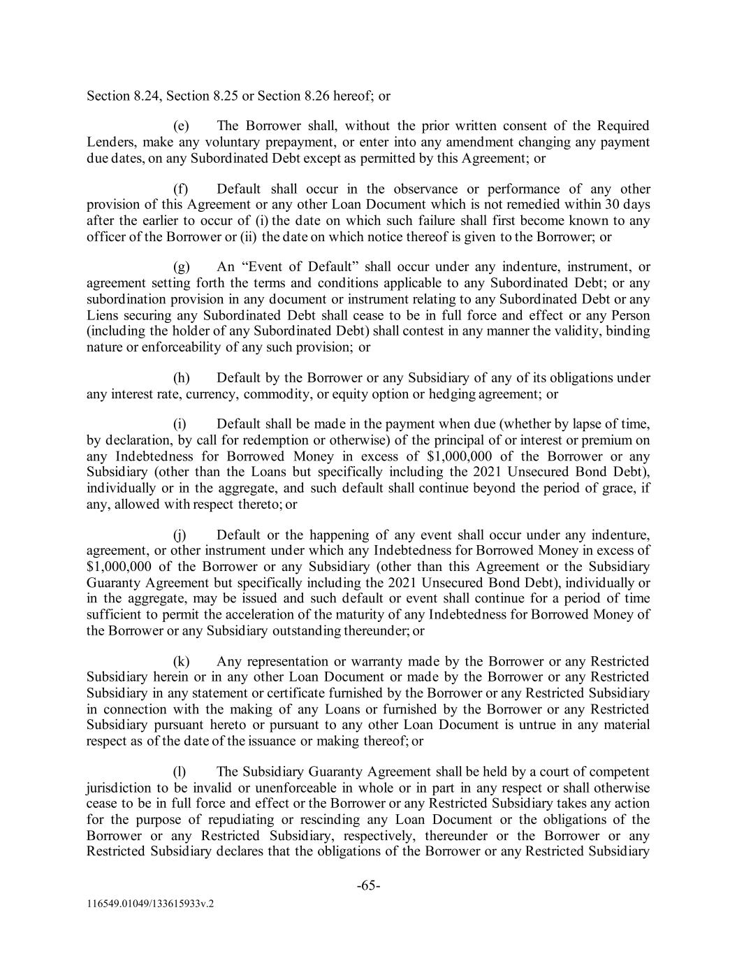 -65- 116549.01049/133615933v.2 Section 8.24, Section 8.25 or Section 8.26 hereof; or (e) The Borrower shall, without the prior written consent of the Required Lenders, make any voluntary prepayment, or enter into any amendment changing any payment due dates, on any Subordinated Debt except as permitted by this Agreement; or (f) Default shall occur in the observance or performance of any other provision of this Agreement or any other Loan Document which is not remedied within 30 days after the earlier to occur of (i) the date on which such failure shall first become known to any officer of the Borrower or (ii) the date on which notice thereof is given to the Borrower; or (g) An “Event of Default” shall occur under any indenture, instrument, or agreement setting forth the terms and conditions applicable to any Subordinated Debt; or any subordination provision in any document or instrument relating to any Subordinated Debt or any Liens securing any Subordinated Debt shall cease to be in full force and effect or any Person (including the holder of any Subordinated Debt) shall contest in any manner the validity, binding nature or enforceability of any such provision; or (h) Default by the Borrower or any Subsidiary of any of its obligations under any interest rate, currency, commodity, or equity option or hedging agreement; or (i) Default shall be made in the payment when due (whether by lapse of time, by declaration, by call for redemption or otherwise) of the principal of or interest or premium on any Indebtedness for Borrowed Money in excess of $1,000,000 of the Borrower or any Subsidiary (other than the Loans but specifically including the 2021 Unsecured Bond Debt), individually or in the aggregate, and such default shall continue beyond the period of grace, if any, allowed with respect thereto; or (j) Default or the happening of any event shall occur under any indenture, agreement, or other instrument under which any Indebtedness for Borrowed Money in excess of $1,000,000 of the Borrower or any Subsidiary (other than this Agreement or the Subsidiary Guaranty Agreement but specifically including the 2021 Unsecured Bond Debt), individually or in the aggregate, may be issued and such default or event shall continue for a period of time sufficient to permit the acceleration of the maturity of any Indebtedness for Borrowed Money of the Borrower or any Subsidiary outstanding thereunder; or (k) Any representation or warranty made by the Borrower or any Restricted Subsidiary herein or in any other Loan Document or made by the Borrower or any Restricted Subsidiary in any statement or certificate furnished by the Borrower or any Restricted Subsidiary in connection with the making of any Loans or furnished by the Borrower or any Restricted Subsidiary pursuant hereto or pursuant to any other Loan Document is untrue in any material respect as of the date of the issuance or making thereof; or (l) The Subsidiary Guaranty Agreement shall be held by a court of competent jurisdiction to be invalid or unenforceable in whole or in part in any respect or shall otherwise cease to be in full force and effect or the Borrower or any Restricted Subsidiary takes any action for the purpose of repudiating or rescinding any Loan Document or the obligations of the Borrower or any Restricted Subsidiary, respectively, thereunder or the Borrower or any Restricted Subsidiary declares that the obligations of the Borrower or any Restricted Subsidiary