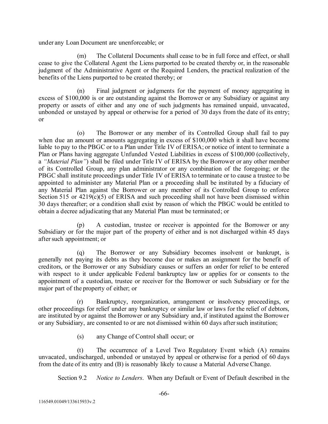 -66- 116549.01049/133615933v.2 under any Loan Document are unenforceable; or (m) The Collateral Documents shall cease to be in full force and effect, or shall cease to give the Collateral Agent the Liens purported to be created thereby or, in the reasonable judgment of the Administrative Agent or the Required Lenders, the practical realization of the benefits of the Liens purported to be created thereby; or (n) Final judgment or judgments for the payment of money aggregating in excess of $100,000 is or are outstanding against the Borrower or any Subsidiary or against any property or assets of either and any one of such judgments has remained unpaid, unvacated, unbonded or unstayed by appeal or otherwise for a period of 30 days from the date of its entry; or (o) The Borrower or any member of its Controlled Group shall fail to pay when due an amount or amounts aggregating in excess of $100,000 which it shall have become liable to pay to the PBGC or to a Plan under Title IV of ERISA; or notice of intent to terminate a Plan or Plans having aggregate Unfunded Vested Liabilities in excess of $100,000 (collectively, a “Material Plan”) shall be filed under Title IV of ERISA by the Borrower or any other member of its Controlled Group, any plan administrator or any combination of the foregoing; or the PBGC shall institute proceedings under Title IV of ERISA to terminate or to cause a trustee to be appointed to administer any Material Plan or a proceeding shall be instituted by a fiduciary of any Material Plan against the Borrower or any member of its Controlled Group to enforce Section 515 or 4219(c)(5) of ERISA and such proceeding shall not have been dismissed within 30 days thereafter; or a condition shall exist by reason of which the PBGC would be entitled to obtain a decree adjudicating that any Material Plan must be terminated; or (p) A custodian, trustee or receiver is appointed for the Borrower or any Subsidiary or for the major part of the property of either and is not discharged within 45 days after such appointment; or (q) The Borrower or any Subsidiary becomes insolvent or bankrupt, is generally not paying its debts as they become due or makes an assignment for the benefit of creditors, or the Borrower or any Subsidiary causes or suffers an order for relief to be entered with respect to it under applicable Federal bankruptcy law or applies for or consents to the appointment of a custodian, trustee or receiver for the Borrower or such Subsidiary or for the major part of the property of either; or (r) Bankruptcy, reorganization, arrangement or insolvency proceedings, or other proceedings for relief under any bankruptcy or similar law or laws for the relief of debtors, are instituted by or against the Borrower or any Subsidiary and, if instituted against the Borrower or any Subsidiary, are consented to or are not dismissed within 60 days after such institution; (s) any Change of Control shall occur; or (t) The occurrence of a Level Two Regulatory Event which (A) remains unvacated, undischarged, unbonded or unstayed by appeal or otherwise for a period of 60 days from the date of its entry and (B) is reasonably likely to cause a Material Adverse Change. Section 9.2 Notice to Lenders. When any Default or Event of Default described in the
