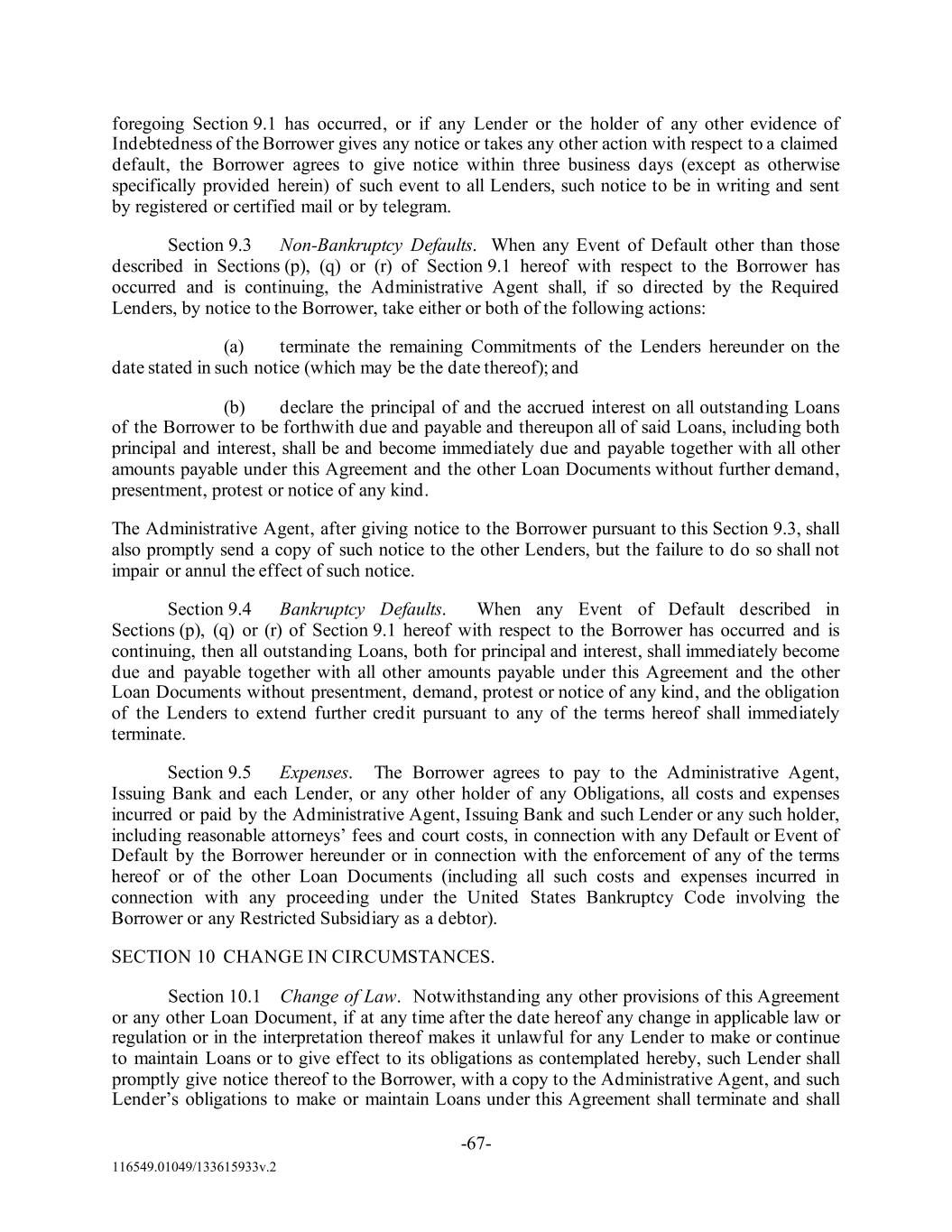 -67- 116549.01049/133615933v.2 foregoing Section 9.1 has occurred, or if any Lender or the holder of any other evidence of Indebtedness of the Borrower gives any notice or takes any other action with respect to a claimed default, the Borrower agrees to give notice within three business days (except as otherwise specifically provided herein) of such event to all Lenders, such notice to be in writing and sent by registered or certified mail or by telegram. Section 9.3 Non-Bankruptcy Defaults. When any Event of Default other than those described in Sections (p), (q) or (r) of Section 9.1 hereof with respect to the Borrower has occurred and is continuing, the Administrative Agent shall, if so directed by the Required Lenders, by notice to the Borrower, take either or both of the following actions: (a) terminate the remaining Commitments of the Lenders hereunder on the date stated in such notice (which may be the date thereof); and (b) declare the principal of and the accrued interest on all outstanding Loans of the Borrower to be forthwith due and payable and thereupon all of said Loans, including both principal and interest, shall be and become immediately due and payable together with all other amounts payable under this Agreement and the other Loan Documents without further demand, presentment, protest or notice of any kind. The Administrative Agent, after giving notice to the Borrower pursuant to this Section 9.3, shall also promptly send a copy of such notice to the other Lenders, but the failure to do so shall not impair or annul the effect of such notice. Section 9.4 Bankruptcy Defaults. When any Event of Default described in Sections (p), (q) or (r) of Section 9.1 hereof with respect to the Borrower has occurred and is continuing, then all outstanding Loans, both for principal and interest, shall immediately become due and payable together with all other amounts payable under this Agreement and the other Loan Documents without presentment, demand, protest or notice of any kind, and the obligation of the Lenders to extend further credit pursuant to any of the terms hereof shall immediately terminate. Section 9.5 Expenses. The Borrower agrees to pay to the Administrative Agent, Issuing Bank and each Lender, or any other holder of any Obligations, all costs and expenses incurred or paid by the Administrative Agent, Issuing Bank and such Lender or any such holder, including reasonable attorneys’ fees and court costs, in connection with any Default or Event of Default by the Borrower hereunder or in connection with the enforcement of any of the terms hereof or of the other Loan Documents (including all such costs and expenses incurred in connection with any proceeding under the United States Bankruptcy Code involving the Borrower or any Restricted Subsidiary as a debtor). SECTION 10 CHANGE IN CIRCUMSTANCES. Section 10.1 Change of Law. Notwithstanding any other provisions of this Agreement or any other Loan Document, if at any time after the date hereof any change in applicable law or regulation or in the interpretation thereof makes it unlawful for any Lender to make or continue to maintain Loans or to give effect to its obligations as contemplated hereby, such Lender shall promptly give notice thereof to the Borrower, with a copy to the Administrative Agent, and such Lender’s obligations to make or maintain Loans under this Agreement shall terminate and shall