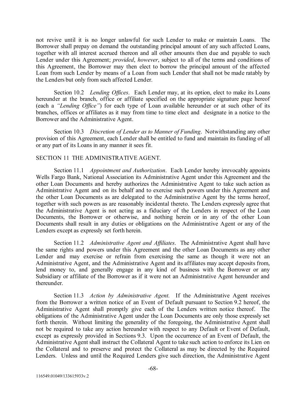 -68- 116549.01049/133615933v.2 not revive until it is no longer unlawful for such Lender to make or maintain Loans. The Borrower shall prepay on demand the outstanding principal amount of any such affected Loans, together with all interest accrued thereon and all other amounts then due and payable to such Lender under this Agreement; provided, however, subject to all of the terms and conditions of this Agreement, the Borrower may then elect to borrow the principal amount of the affected Loan from such Lender by means of a Loan from such Lender that shall not be made ratably by the Lenders but only from such affected Lender. Section 10.2 Lending Offices. Each Lender may, at its option, elect to make its Loans hereunder at the branch, office or affiliate specified on the appropriate signature page hereof (each a “Lending Office”) for each type of Loan available hereunder or at such other of its branches, offices or affiliates as it may from time to time elect and designate in a notice to the Borrower and the Administrative Agent. Section 10.3 Discretion of Lender as to Manner of Funding. Notwithstanding any other provision of this Agreement, each Lender shall be entitled to fund and maintain its funding of all or any part of its Loans in any manner it sees fit. SECTION 11 THE ADMINISTRATIVE AGENT. Section 11.1 Appointment and Authorization. Each Lender hereby irrevocably appoints Wells Fargo Bank, National Association its Administrative Agent under this Agreement and the other Loan Documents and hereby authorizes the Administrative Agent to take such action as Administrative Agent and on its behalf and to exercise such powers under this Agreement and the other Loan Documents as are delegated to the Administrative Agent by the terms hereof, together with such powers as are reasonably incidental thereto. The Lenders expressly agree that the Administrative Agent is not acting as a fiduciary of the Lenders in respect of the Loan Documents, the Borrower or otherwise, and nothing herein or in any of the other Loan Documents shall result in any duties or obligations on the Administrative Agent or any of the Lenders except as expressly set forth herein. Section 11.2 Administrative Agent and Affiliates. The Administrative Agent shall have the same rights and powers under this Agreement and the other Loan Documents as any other Lender and may exercise or refrain from exercising the same as though it were not an Administrative Agent, and the Administrative Agent and its affiliates may accept deposits from, lend money to, and generally engage in any kind of business with the Borrower or any Subsidiary or affiliate of the Borrower as if it were not an Administrative Agent hereunder and thereunder. Section 11.3 Action by Administrative Agent. If the Administrative Agent receives from the Borrower a written notice of an Event of Default pursuant to Section 9.2 hereof, the Administrative Agent shall promptly give each of the Lenders written notice thereof. The obligations of the Administrative Agent under the Loan Documents are only those expressly set forth therein. Without limiting the generality of the foregoing, the Administrative Agent shall not be required to take any action hereunder with respect to any Default or Event of Default, except as expressly provided in Sections 9.3. Upon the occurrence of an Event of Default, the Administrative Agent shall instruct the Collateral Agent to take such action to enforce its Lien on the Collateral and to preserve and protect the Collateral as may be directed by the Required Lenders. Unless and until the Required Lenders give such direction, the Administrative Agent
