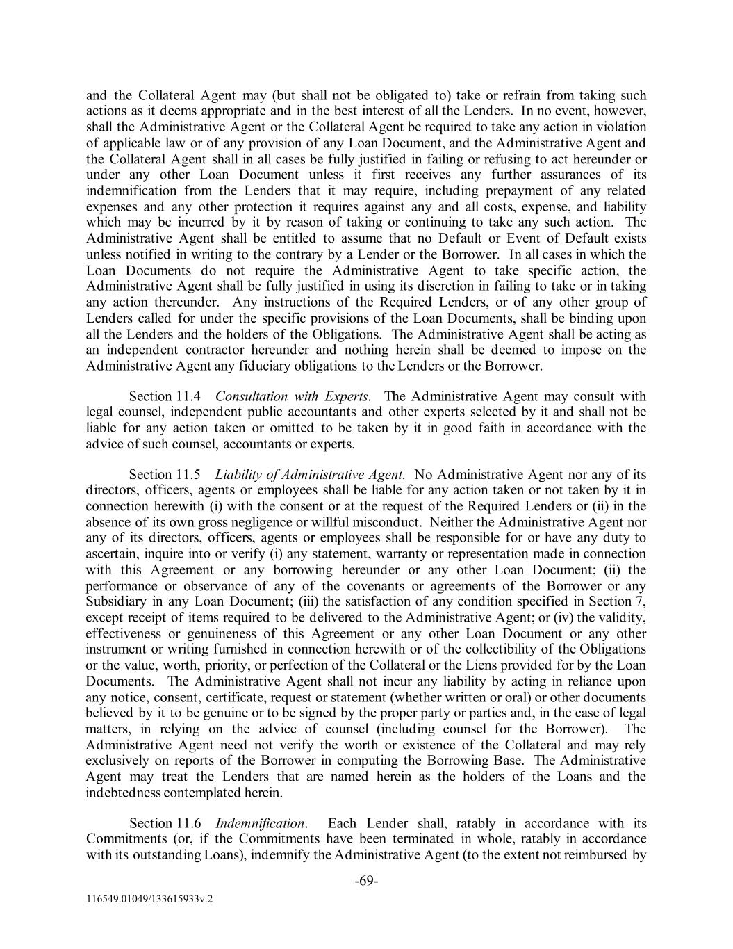 -69- 116549.01049/133615933v.2 and the Collateral Agent may (but shall not be obligated to) take or refrain from taking such actions as it deems appropriate and in the best interest of all the Lenders. In no event, however, shall the Administrative Agent or the Collateral Agent be required to take any action in violation of applicable law or of any provision of any Loan Document, and the Administrative Agent and the Collateral Agent shall in all cases be fully justified in failing or refusing to act hereunder or under any other Loan Document unless it first receives any further assurances of its indemnification from the Lenders that it may require, including prepayment of any related expenses and any other protection it requires against any and all costs, expense, and liability which may be incurred by it by reason of taking or continuing to take any such action. The Administrative Agent shall be entitled to assume that no Default or Event of Default exists unless notified in writing to the contrary by a Lender or the Borrower. In all cases in which the Loan Documents do not require the Administrative Agent to take specific action, the Administrative Agent shall be fully justified in using its discretion in failing to take or in taking any action thereunder. Any instructions of the Required Lenders, or of any other group of Lenders called for under the specific provisions of the Loan Documents, shall be binding upon all the Lenders and the holders of the Obligations. The Administrative Agent shall be acting as an independent contractor hereunder and nothing herein shall be deemed to impose on the Administrative Agent any fiduciary obligations to the Lenders or the Borrower. Section 11.4 Consultation with Experts. The Administrative Agent may consult with legal counsel, independent public accountants and other experts selected by it and shall not be liable for any action taken or omitted to be taken by it in good faith in accordance with the advice of such counsel, accountants or experts. Section 11.5 Liability of Administrative Agent. No Administrative Agent nor any of its directors, officers, agents or employees shall be liable for any action taken or not taken by it in connection herewith (i) with the consent or at the request of the Required Lenders or (ii) in the absence of its own gross negligence or willful misconduct. Neither the Administrative Agent nor any of its directors, officers, agents or employees shall be responsible for or have any duty to ascertain, inquire into or verify (i) any statement, warranty or representation made in connection with this Agreement or any borrowing hereunder or any other Loan Document; (ii) the performance or observance of any of the covenants or agreements of the Borrower or any Subsidiary in any Loan Document; (iii) the satisfaction of any condition specified in Section 7, except receipt of items required to be delivered to the Administrative Agent; or (iv) the validity, effectiveness or genuineness of this Agreement or any other Loan Document or any other instrument or writing furnished in connection herewith or of the collectibility of the Obligations or the value, worth, priority, or perfection of the Collateral or the Liens provided for by the Loan Documents. The Administrative Agent shall not incur any liability by acting in reliance upon any notice, consent, certificate, request or statement (whether written or oral) or other documents believed by it to be genuine or to be signed by the proper party or parties and, in the case of legal matters, in relying on the advice of counsel (including counsel for the Borrower). The Administrative Agent need not verify the worth or existence of the Collateral and may rely exclusively on reports of the Borrower in computing the Borrowing Base. The Administrative Agent may treat the Lenders that are named herein as the holders of the Loans and the indebtedness contemplated herein. Section 11.6 Indemnification. Each Lender shall, ratably in accordance with its Commitments (or, if the Commitments have been terminated in whole, ratably in accordance with its outstanding Loans), indemnify the Administrative Agent (to the extent not reimbursed by
