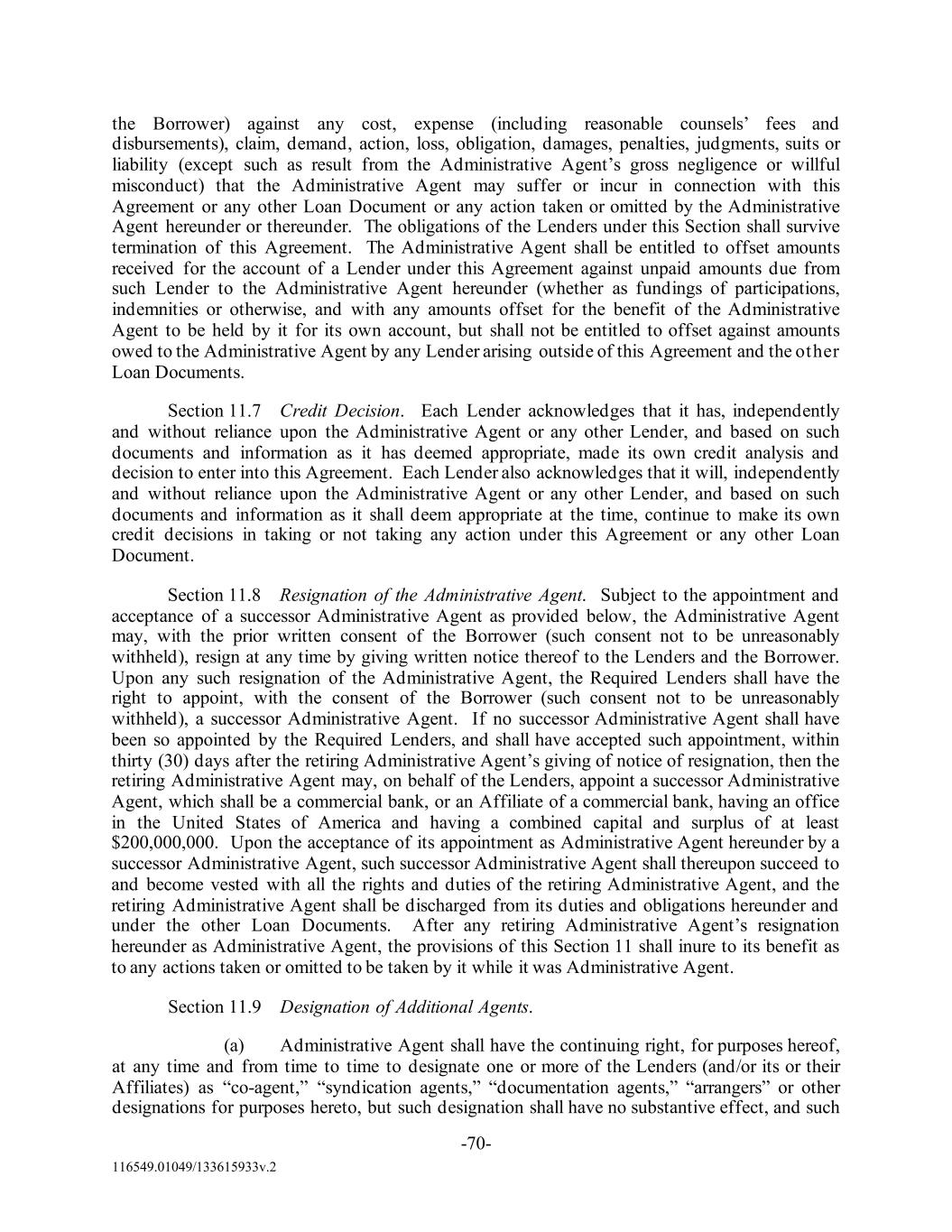 -70- 116549.01049/133615933v.2 the Borrower) against any cost, expense (including reasonable counsels’ fees and disbursements), claim, demand, action, loss, obligation, damages, penalties, judgments, suits or liability (except such as result from the Administrative Agent’s gross negligence or willful misconduct) that the Administrative Agent may suffer or incur in connection with this Agreement or any other Loan Document or any action taken or omitted by the Administrative Agent hereunder or thereunder. The obligations of the Lenders under this Section shall survive termination of this Agreement. The Administrative Agent shall be entitled to offset amounts received for the account of a Lender under this Agreement against unpaid amounts due from such Lender to the Administrative Agent hereunder (whether as fundings of participations, indemnities or otherwise, and with any amounts offset for the benefit of the Administrative Agent to be held by it for its own account, but shall not be entitled to offset against amounts owed to the Administrative Agent by any Lender arising outside of this Agreement and the other Loan Documents. Section 11.7 Credit Decision. Each Lender acknowledges that it has, independently and without reliance upon the Administrative Agent or any other Lender, and based on such documents and information as it has deemed appropriate, made its own credit analysis and decision to enter into this Agreement. Each Lender also acknowledges that it will, independently and without reliance upon the Administrative Agent or any other Lender, and based on such documents and information as it shall deem appropriate at the time, continue to make its own credit decisions in taking or not taking any action under this Agreement or any other Loan Document. Section 11.8 Resignation of the Administrative Agent. Subject to the appointment and acceptance of a successor Administrative Agent as provided below, the Administrative Agent may, with the prior written consent of the Borrower (such consent not to be unreasonably withheld), resign at any time by giving written notice thereof to the Lenders and the Borrower. Upon any such resignation of the Administrative Agent, the Required Lenders shall have the right to appoint, with the consent of the Borrower (such consent not to be unreasonably withheld), a successor Administrative Agent. If no successor Administrative Agent shall have been so appointed by the Required Lenders, and shall have accepted such appointment, within thirty (30) days after the retiring Administrative Agent’s giving of notice of resignation, then the retiring Administrative Agent may, on behalf of the Lenders, appoint a successor Administrative Agent, which shall be a commercial bank, or an Affiliate of a commercial bank, having an office in the United States of America and having a combined capital and surplus of at least $200,000,000. Upon the acceptance of its appointment as Administrative Agent hereunder by a successor Administrative Agent, such successor Administrative Agent shall thereupon succeed to and become vested with all the rights and duties of the retiring Administrative Agent, and the retiring Administrative Agent shall be discharged from its duties and obligations hereunder and under the other Loan Documents. After any retiring Administrative Agent’s resignation hereunder as Administrative Agent, the provisions of this Section 11 shall inure to its benefit as to any actions taken or omitted to be taken by it while it was Administrative Agent. Section 11.9 Designation of Additional Agents. (a) Administrative Agent shall have the continuing right, for purposes hereof, at any time and from time to time to designate one or more of the Lenders (and/or its or their Affiliates) as “co-agent,” “syndication agents,” “documentation agents,” “arrangers” or other designations for purposes hereto, but such designation shall have no substantive effect, and such