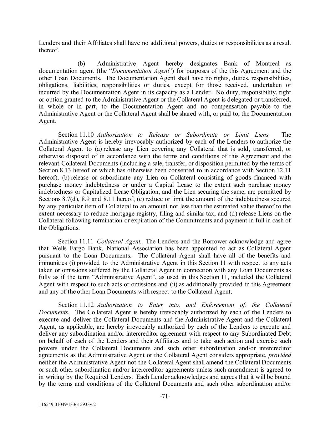-71- 116549.01049/133615933v.2 Lenders and their Affiliates shall have no additional powers, duties or responsibilities as a result thereof. (b) Administrative Agent hereby designates Bank of Montreal as documentation agent (the “Documentation Agent”) for purposes of the this Agreement and the other Loan Documents. The Documentation Agent shall have no rights, duties, responsibilities, obligations, liabilities, responsibilities or duties, except for those received, undertaken or incurred by the Documentation Agent in its capacity as a Lender. No duty, responsibility, right or option granted to the Administrative Agent or the Collateral Agent is delegated or transferred, in whole or in part, to the Documentation Agent and no compensation payable to the Administrative Agent or the Collateral Agent shall be shared with, or paid to, the Documentation Agent. Section 11.10 Authorization to Release or Subordinate or Limit Liens. The Administrative Agent is hereby irrevocably authorized by each of the Lenders to authorize the Collateral Agent to (a) release any Lien covering any Collateral that is sold, transferred, or otherwise disposed of in accordance with the terms and conditions of this Agreement and the relevant Collateral Documents (including a sale, transfer, or disposition permitted by the terms of Section 8.13 hereof or which has otherwise been consented to in accordance with Section 12.11 hereof), (b) release or subordinate any Lien on Collateral consisting of goods financed with purchase money indebtedness or under a Capital Lease to the extent such purchase money indebtedness or Capitalized Lease Obligation, and the Lien securing the same, are permitted by Sections 8.7(d), 8.9 and 8.11 hereof, (c) reduce or limit the amount of the indebtedness secured by any particular item of Collateral to an amount not less than the estimated value thereof to the extent necessary to reduce mortgage registry, filing and similar tax, and (d) release Liens on the Collateral following termination or expiration of the Commitments and payment in full in cash of the Obligations. Section 11.11 Collateral Agent. The Lenders and the Borrower acknowledge and agree that Wells Fargo Bank, National Association has been appointed to act as Collateral Agent pursuant to the Loan Documents. The Collateral Agent shall have all of the benefits and immunities (i) provided to the Administrative Agent in this Section 11 with respect to any acts taken or omissions suffered by the Collateral Agent in connection with any Loan Documents as fully as if the term “Administrative Agent”, as used in this Section 11, included the Collateral Agent with respect to such acts or omissions and (ii) as additionally provided in this Agreement and any of the other Loan Documents with respect to the Collateral Agent. Section 11.12 Authorization to Enter into, and Enforcement of, the Collateral Documents. The Collateral Agent is hereby irrevocably authorized by each of the Lenders to execute and deliver the Collateral Documents and the Administrative Agent and the Collateral Agent, as applicable, are hereby irrevocably authorized by each of the Lenders to execute and deliver any subordination and/or intercreditor agreement with respect to any Subordinated Debt on behalf of each of the Lenders and their Affiliates and to take such action and exercise such powers under the Collateral Documents and such other subordination and/or intercreditor agreements as the Administrative Agent or the Collateral Agent considers appropriate, provided neither the Administrative Agent not the Collateral Agent shall amend the Collateral Documents or such other subordination and/or intercreditor agreements unless such amendment is agreed to in writing by the Required Lenders. Each Lender acknowledges and agrees that it will be bound by the terms and conditions of the Collateral Documents and such other subordination and/or