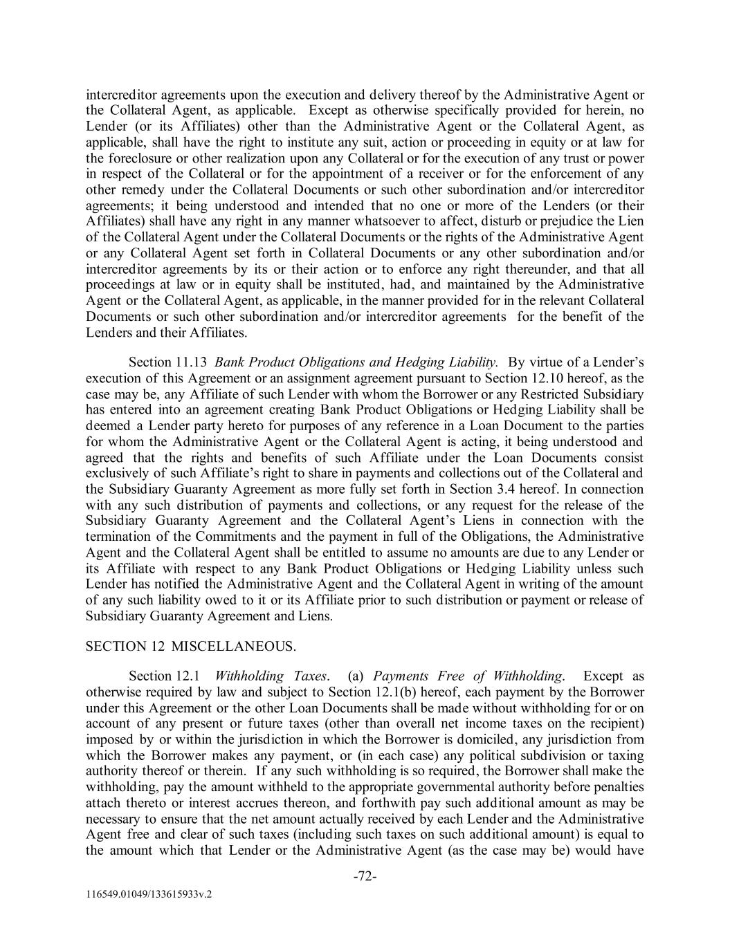 -72- 116549.01049/133615933v.2 intercreditor agreements upon the execution and delivery thereof by the Administrative Agent or the Collateral Agent, as applicable. Except as otherwise specifically provided for herein, no Lender (or its Affiliates) other than the Administrative Agent or the Collateral Agent, as applicable, shall have the right to institute any suit, action or proceeding in equity or at law for the foreclosure or other realization upon any Collateral or for the execution of any trust or power in respect of the Collateral or for the appointment of a receiver or for the enforcement of any other remedy under the Collateral Documents or such other subordination and/or intercreditor agreements; it being understood and intended that no one or more of the Lenders (or their Affiliates) shall have any right in any manner whatsoever to affect, disturb or prejudice the Lien of the Collateral Agent under the Collateral Documents or the rights of the Administrative Agent or any Collateral Agent set forth in Collateral Documents or any other subordination and/or intercreditor agreements by its or their action or to enforce any right thereunder, and that all proceedings at law or in equity shall be instituted, had, and maintained by the Administrative Agent or the Collateral Agent, as applicable, in the manner provided for in the relevant Collateral Documents or such other subordination and/or intercreditor agreements for the benefit of the Lenders and their Affiliates. Section 11.13 Bank Product Obligations and Hedging Liability. By virtue of a Lender’s execution of this Agreement or an assignment agreement pursuant to Section 12.10 hereof, as the case may be, any Affiliate of such Lender with whom the Borrower or any Restricted Subsidiary has entered into an agreement creating Bank Product Obligations or Hedging Liability shall be deemed a Lender party hereto for purposes of any reference in a Loan Document to the parties for whom the Administrative Agent or the Collateral Agent is acting, it being understood and agreed that the rights and benefits of such Affiliate under the Loan Documents consist exclusively of such Affiliate’s right to share in payments and collections out of the Collateral and the Subsidiary Guaranty Agreement as more fully set forth in Section 3.4 hereof. In connection with any such distribution of payments and collections, or any request for the release of the Subsidiary Guaranty Agreement and the Collateral Agent’s Liens in connection with the termination of the Commitments and the payment in full of the Obligations, the Administrative Agent and the Collateral Agent shall be entitled to assume no amounts are due to any Lender or its Affiliate with respect to any Bank Product Obligations or Hedging Liability unless such Lender has notified the Administrative Agent and the Collateral Agent in writing of the amount of any such liability owed to it or its Affiliate prior to such distribution or payment or release of Subsidiary Guaranty Agreement and Liens. SECTION 12 MISCELLANEOUS. Section 12.1 Withholding Taxes. (a) Payments Free of Withholding. Except as otherwise required by law and subject to Section 12.1(b) hereof, each payment by the Borrower under this Agreement or the other Loan Documents shall be made without withholding for or on account of any present or future taxes (other than overall net income taxes on the recipient) imposed by or within the jurisdiction in which the Borrower is domiciled, any jurisdiction from which the Borrower makes any payment, or (in each case) any political subdivision or taxing authority thereof or therein. If any such withholding is so required, the Borrower shall make the withholding, pay the amount withheld to the appropriate governmental authority before penalties attach thereto or interest accrues thereon, and forthwith pay such additional amount as may be necessary to ensure that the net amount actually received by each Lender and the Administrative Agent free and clear of such taxes (including such taxes on such additional amount) is equal to the amount which that Lender or the Administrative Agent (as the case may be) would have