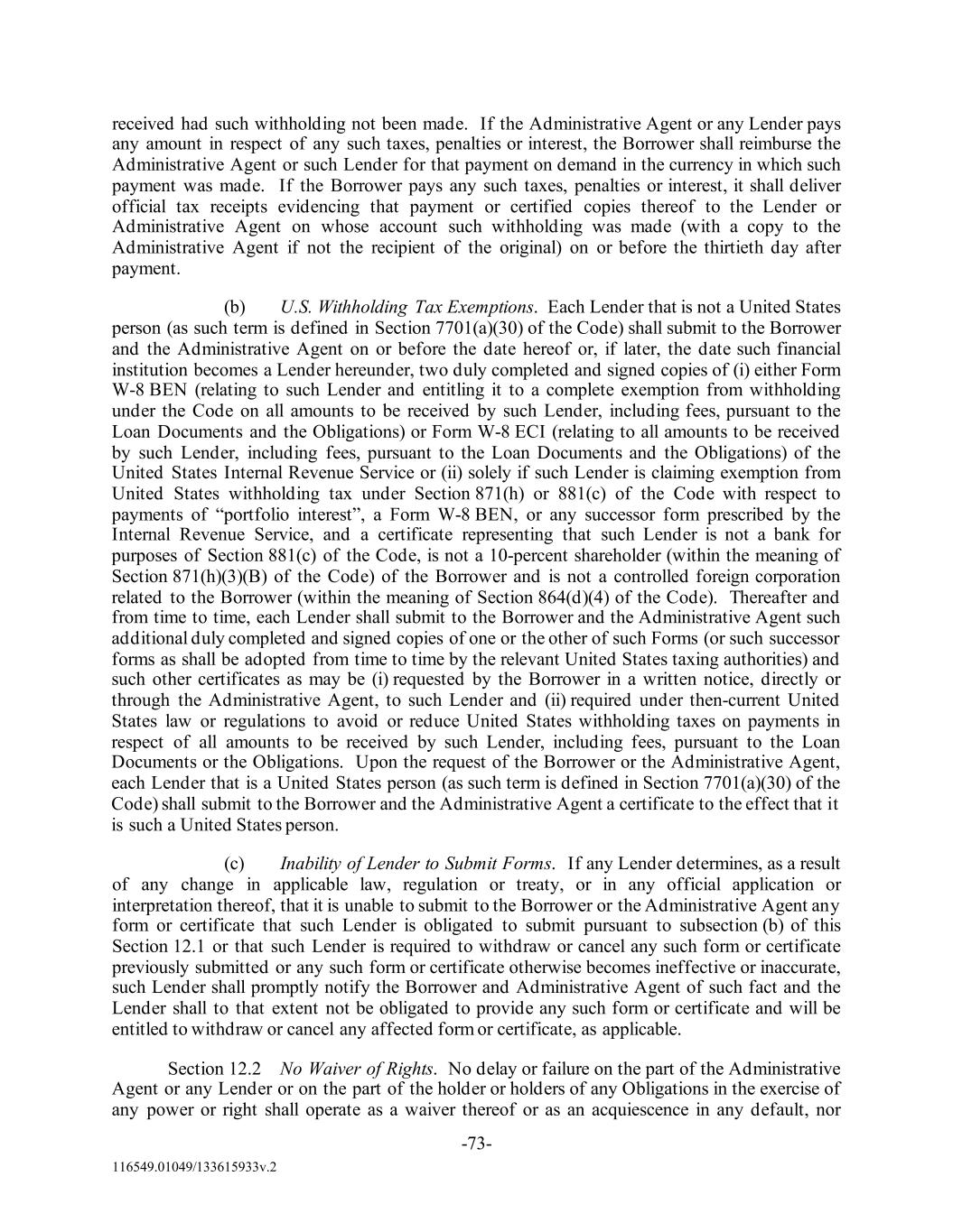 -73- 116549.01049/133615933v.2 received had such withholding not been made. If the Administrative Agent or any Lender pays any amount in respect of any such taxes, penalties or interest, the Borrower shall reimburse the Administrative Agent or such Lender for that payment on demand in the currency in which such payment was made. If the Borrower pays any such taxes, penalties or interest, it shall deliver official tax receipts evidencing that payment or certified copies thereof to the Lender or Administrative Agent on whose account such withholding was made (with a copy to the Administrative Agent if not the recipient of the original) on or before the thirtieth day after payment. (b) U.S. Withholding Tax Exemptions. Each Lender that is not a United States person (as such term is defined in Section 7701(a)(30) of the Code) shall submit to the Borrower and the Administrative Agent on or before the date hereof or, if later, the date such financial institution becomes a Lender hereunder, two duly completed and signed copies of (i) either Form W-8 BEN (relating to such Lender and entitling it to a complete exemption from withholding under the Code on all amounts to be received by such Lender, including fees, pursuant to the Loan Documents and the Obligations) or Form W-8 ECI (relating to all amounts to be received by such Lender, including fees, pursuant to the Loan Documents and the Obligations) of the United States Internal Revenue Service or (ii) solely if such Lender is claiming exemption from United States withholding tax under Section 871(h) or 881(c) of the Code with respect to payments of “portfolio interest”, a Form W-8 BEN, or any successor form prescribed by the Internal Revenue Service, and a certificate representing that such Lender is not a bank for purposes of Section 881(c) of the Code, is not a 10-percent shareholder (within the meaning of Section 871(h)(3)(B) of the Code) of the Borrower and is not a controlled foreign corporation related to the Borrower (within the meaning of Section 864(d)(4) of the Code). Thereafter and from time to time, each Lender shall submit to the Borrower and the Administrative Agent such additional duly completed and signed copies of one or the other of such Forms (or such successor forms as shall be adopted from time to time by the relevant United States taxing authorities) and such other certificates as may be (i) requested by the Borrower in a written notice, directly or through the Administrative Agent, to such Lender and (ii) required under then-current United States law or regulations to avoid or reduce United States withholding taxes on payments in respect of all amounts to be received by such Lender, including fees, pursuant to the Loan Documents or the Obligations. Upon the request of the Borrower or the Administrative Agent, each Lender that is a United States person (as such term is defined in Section 7701(a)(30) of the Code) shall submit to the Borrower and the Administrative Agent a certificate to the effect that it is such a United States person. (c) Inability of Lender to Submit Forms. If any Lender determines, as a result of any change in applicable law, regulation or treaty, or in any official application or interpretation thereof, that it is unable to submit to the Borrower or the Administrative Agent any form or certificate that such Lender is obligated to submit pursuant to subsection (b) of this Section 12.1 or that such Lender is required to withdraw or cancel any such form or certificate previously submitted or any such form or certificate otherwise becomes ineffective or inaccurate, such Lender shall promptly notify the Borrower and Administrative Agent of such fact and the Lender shall to that extent not be obligated to provide any such form or certificate and will be entitled to withdraw or cancel any affected form or certificate, as applicable. Section 12.2 No Waiver of Rights. No delay or failure on the part of the Administrative Agent or any Lender or on the part of the holder or holders of any Obligations in the exercise of any power or right shall operate as a waiver thereof or as an acquiescence in any default, nor