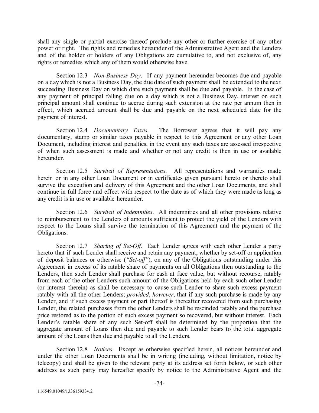 -74- 116549.01049/133615933v.2 shall any single or partial exercise thereof preclude any other or further exercise of any other power or right. The rights and remedies hereunder of the Administrative Agent and the Lenders and of the holder or holders of any Obligations are cumulative to, and not exclusive of, any rights or remedies which any of them would otherwise have. Section 12.3 Non-Business Day. If any payment hereunder becomes due and payable on a day which is not a Business Day, the due date of such payment shall be extended to the next succeeding Business Day on which date such payment shall be due and payable. In the case of any payment of principal falling due on a day which is not a Business Day, interest on such principal amount shall continue to accrue during such extension at the rate per annum then in effect, which accrued amount shall be due and payable on the next scheduled date for the payment of interest. Section 12.4 Documentary Taxes. The Borrower agrees that it will pay any documentary, stamp or similar taxes payable in respect to this Agreement or any other Loan Document, including interest and penalties, in the event any such taxes are assessed irrespective of when such assessment is made and whether or not any credit is then in use or available hereunder. Section 12.5 Survival of Representations. All representations and warranties made herein or in any other Loan Document or in certificates given pursuant hereto or thereto shall survive the execution and delivery of this Agreement and the other Loan Documents, and shall continue in full force and effect with respect to the date as of which they were made as long as any credit is in use or available hereunder. Section 12.6 Survival of Indemnities. All indemnities and all other provisions relative to reimbursement to the Lenders of amounts sufficient to protect the yield of the Lenders with respect to the Loans shall survive the termination of this Agreement and the payment of the Obligations. Section 12.7 Sharing of Set-Off. Each Lender agrees with each other Lender a party hereto that if such Lender shall receive and retain any payment, whether by set-off or application of deposit balances or otherwise (“Set-off”), on any of the Obligations outstanding under this Agreement in excess of its ratable share of payments on all Obligations then outstanding to the Lenders, then such Lender shall purchase for cash at face value, but without recourse, ratably from each of the other Lenders such amount of the Obligations held by each such other Lender (or interest therein) as shall be necessary to cause such Lender to share such excess payment ratably with all the other Lenders; provided, however, that if any such purchase is made by any Lender, and if such excess payment or part thereof is thereafter recovered from such purchasing Lender, the related purchases from the other Lenders shall be rescinded ratably and the purchase price restored as to the portion of such excess payment so recovered, but without interest. Each Lender’s ratable share of any such Set-off shall be determined by the proportion that the aggregate amount of Loans then due and payable to such Lender bears to the total aggregate amount of the Loans then due and payable to all the Lenders. Section 12.8 Notices. Except as otherwise specified herein, all notices hereunder and under the other Loan Documents shall be in writing (including, without limitation, notice by telecopy) and shall be given to the relevant party at its address set forth below, or such other address as such party may hereafter specify by notice to the Administrative Agent and the