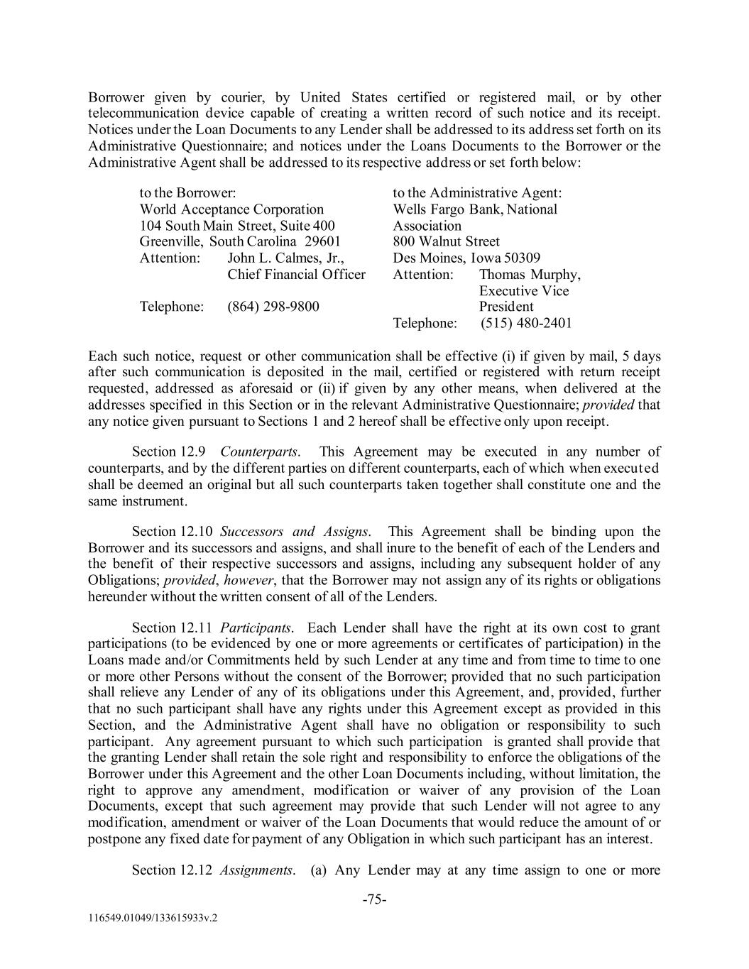 -75- 116549.01049/133615933v.2 Borrower given by courier, by United States certified or registered mail, or by other telecommunication device capable of creating a written record of such notice and its receipt. Notices under the Loan Documents to any Lender shall be addressed to its address set forth on its Administrative Questionnaire; and notices under the Loans Documents to the Borrower or the Administrative Agent shall be addressed to its respective address or set forth below: to the Borrower: World Acceptance Corporation 104 South Main Street, Suite 400 Greenville, South Carolina 29601 Attention: John L. Calmes, Jr., Chief Financial Officer Telephone: (864) 298-9800 to the Administrative Agent: Wells Fargo Bank, National Association 800 Walnut Street Des Moines, Iowa 50309 Attention: Thomas Murphy, Executive Vice President Telephone: (515) 480-2401 Each such notice, request or other communication shall be effective (i) if given by mail, 5 days after such communication is deposited in the mail, certified or registered with return receipt requested, addressed as aforesaid or (ii) if given by any other means, when delivered at the addresses specified in this Section or in the relevant Administrative Questionnaire; provided that any notice given pursuant to Sections 1 and 2 hereof shall be effective only upon receipt. Section 12.9 Counterparts. This Agreement may be executed in any number of counterparts, and by the different parties on different counterparts, each of which when executed shall be deemed an original but all such counterparts taken together shall constitute one and the same instrument. Section 12.10 Successors and Assigns. This Agreement shall be binding upon the Borrower and its successors and assigns, and shall inure to the benefit of each of the Lenders and the benefit of their respective successors and assigns, including any subsequent holder of any Obligations; provided, however, that the Borrower may not assign any of its rights or obligations hereunder without the written consent of all of the Lenders. Section 12.11 Participants. Each Lender shall have the right at its own cost to grant participations (to be evidenced by one or more agreements or certificates of participation) in the Loans made and/or Commitments held by such Lender at any time and from time to time to one or more other Persons without the consent of the Borrower; provided that no such participation shall relieve any Lender of any of its obligations under this Agreement, and, provided, further that no such participant shall have any rights under this Agreement except as provided in this Section, and the Administrative Agent shall have no obligation or responsibility to such participant. Any agreement pursuant to which such participation is granted shall provide that the granting Lender shall retain the sole right and responsibility to enforce the obligations of the Borrower under this Agreement and the other Loan Documents including, without limitation, the right to approve any amendment, modification or waiver of any provision of the Loan Documents, except that such agreement may provide that such Lender will not agree to any modification, amendment or waiver of the Loan Documents that would reduce the amount of or postpone any fixed date for payment of any Obligation in which such participant has an interest. Section 12.12 Assignments. (a) Any Lender may at any time assign to one or more