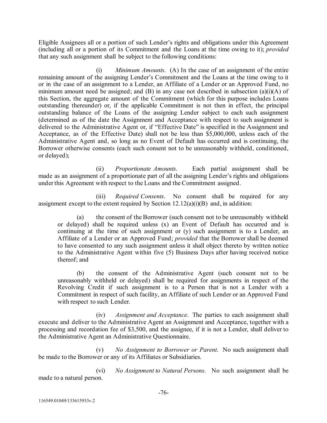 -76- 116549.01049/133615933v.2 Eligible Assignees all or a portion of such Lender’s rights and obligations under this Agreement (including all or a portion of its Commitment and the Loans at the time owing to it); provided that any such assignment shall be subject to the following conditions: (i) Minimum Amounts. (A) In the case of an assignment of the entire remaining amount of the assigning Lender’s Commitment and the Loans at the time owing to it or in the case of an assignment to a Lender, an Affiliate of a Lender or an Approved Fund, no minimum amount need be assigned; and (B) in any case not described in subsection (a)(i)(A) of this Section, the aggregate amount of the Commitment (which for this purpose includes Loans outstanding thereunder) or, if the applicable Commitment is not then in effect, the principal outstanding balance of the Loans of the assigning Lender subject to each such assignment (determined as of the date the Assignment and Acceptance with respect to such assignment is delivered to the Administrative Agent or, if “Effective Date” is specified in the Assignment and Acceptance, as of the Effective Date) shall not be less than $5,000,000, unless each of the Administrative Agent and, so long as no Event of Default has occurred and is continuing, the Borrower otherwise consents (each such consent not to be unreasonably withheld, conditioned, or delayed); (ii) Proportionate Amounts. Each partial assignment shall be made as an assignment of a proportionate part of all the assigning Lender’s rights and obligations under this Agreement with respect to the Loans and the Commitment assigned. (iii) Required Consents. No consent shall be required for any assignment except to the extent required by Section 12.12(a)(i)(B) and, in addition: (a) the consent of the Borrower (such consent not to be unreasonably withheld or delayed) shall be required unless (x) an Event of Default has occurred and is continuing at the time of such assignment or (y) such assignment is to a Lender, an Affiliate of a Lender or an Approved Fund; provided that the Borrower shall be deemed to have consented to any such assignment unless it shall object thereto by written notice to the Administrative Agent within five (5) Business Days after having received notice thereof; and (b) the consent of the Administrative Agent (such consent not to be unreasonably withheld or delayed) shall be required for assignments in respect of the Revolving Credit if such assignment is to a Person that is not a Lender with a Commitment in respect of such facility, an Affiliate of such Lender or an Approved Fund with respect to such Lender. (iv) Assignment and Acceptance. The parties to each assignment shall execute and deliver to the Administrative Agent an Assignment and Acceptance, together with a processing and recordation fee of $3,500, and the assignee, if it is not a Lender, shall deliver to the Administrative Agent an Administrative Questionnaire. (v) No Assignment to Borrower or Parent. No such assignment shall be made to the Borrower or any of its Affiliates or Subsidiaries. (vi) No Assignment to Natural Persons. No such assignment shall be made to a natural person.