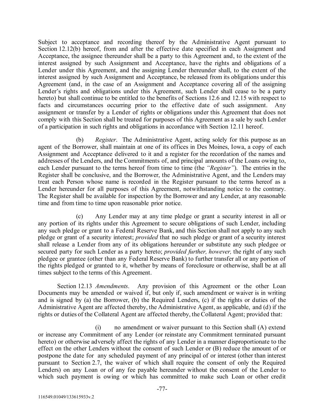 -77- 116549.01049/133615933v.2 Subject to acceptance and recording thereof by the Administrative Agent pursuant to Section 12.12(b) hereof, from and after the effective date specified in each Assignment and Acceptance, the assignee thereunder shall be a party to this Agreement and, to the extent of the interest assigned by such Assignment and Acceptance, have the rights and obligations of a Lender under this Agreement, and the assigning Lender thereunder shall, to the extent of the interest assigned by such Assignment and Acceptance, be released from its obligations under this Agreement (and, in the case of an Assignment and Acceptance covering all of the assigning Lender’s rights and obligations under this Agreement, such Lender shall cease to be a party hereto) but shall continue to be entitled to the benefits of Sections 12.6 and 12.15 with respect to facts and circumstances occurring prior to the effective date of such assignment. Any assignment or transfer by a Lender of rights or obligations under this Agreement that does not comply with this Section shall be treated for purposes of this Agreement as a sale by such Lender of a participation in such rights and obligations in accordance with Section 12.11 hereof. (b) Register. The Administrative Agent, acting solely for this purpose as an agent of the Borrower, shall maintain at one of its offices in Des Moines, Iowa, a copy of each Assignment and Acceptance delivered to it and a register for the recordation of the names and addresses of the Lenders, and the Commitments of, and principal amounts of the Loans owing to, each Lender pursuant to the terms hereof from time to time (the “Register”). The entries in the Register shall be conclusive, and the Borrower, the Administrative Agent, and the Lenders may treat each Person whose name is recorded in the Register pursuant to the terms hereof as a Lender hereunder for all purposes of this Agreement, notwithstanding notice to the contrary. The Register shall be available for inspection by the Borrower and any Lender, at any reasonable time and from time to time upon reasonable prior notice. (c) Any Lender may at any time pledge or grant a security interest in all or any portion of its rights under this Agreement to secure obligations of such Lender, including any such pledge or grant to a Federal Reserve Bank, and this Section shall not apply to any such pledge or grant of a security interest; provided that no such pledge or grant of a security interest shall release a Lender from any of its obligations hereunder or substitute any such pledgee or secured party for such Lender as a party hereto; provided further, however, the right of any such pledgee or grantee (other than any Federal Reserve Bank) to further transfer all or any portion of the rights pledged or granted to it, whether by means of foreclosure or otherwise, shall be at all times subject to the terms of this Agreement. Section 12.13 Amendments. Any provision of this Agreement or the other Loan Documents may be amended or waived if, but only if, such amendment or waiver is in writing and is signed by (a) the Borrower, (b) the Required Lenders, (c) if the rights or duties of the Administrative Agent are affected thereby, the Administrative Agent, as applicable, and (d) if the rights or duties of the Collateral Agent are affected thereby, the Collateral Agent; provided that: (i) no amendment or waiver pursuant to this Section shall (A) extend or increase any Commitment of any Lender (or reinstate any Commitment terminated pursuant hereto) or otherwise adversely affect the rights of any Lender in a manner disproportionate to the effect on the other Lenders without the consent of such Lender or (B) reduce the amount of or postpone the date for any scheduled payment of any principal of or interest (other than interest pursuant to Section 2.7, the waiver of which shall require the consent of only the Required Lenders) on any Loan or of any fee payable hereunder without the consent of the Lender to which such payment is owing or which has committed to make such Loan or other credit