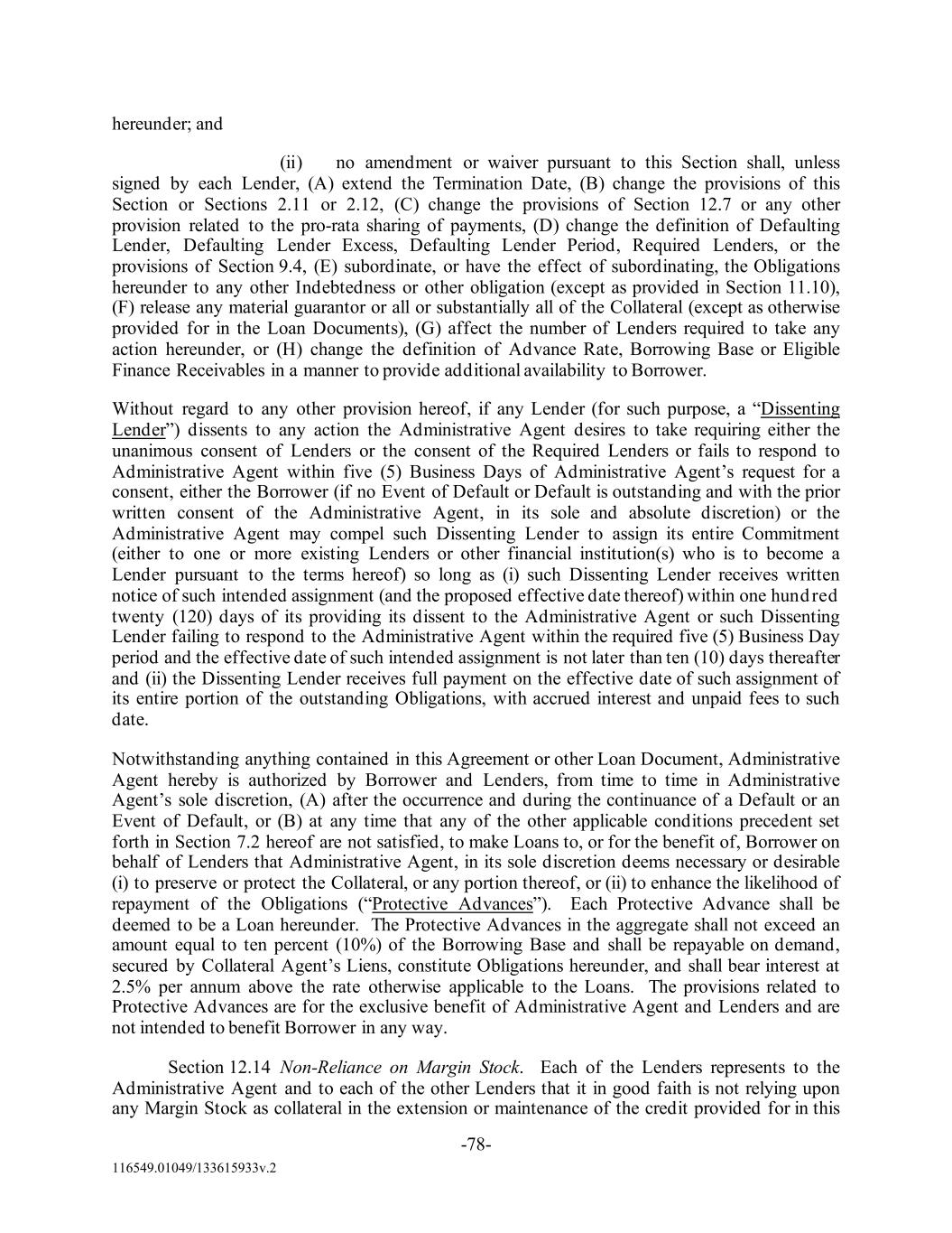 -78- 116549.01049/133615933v.2 hereunder; and (ii) no amendment or waiver pursuant to this Section shall, unless signed by each Lender, (A) extend the Termination Date, (B) change the provisions of this Section or Sections 2.11 or 2.12, (C) change the provisions of Section 12.7 or any other provision related to the pro-rata sharing of payments, (D) change the definition of Defaulting Lender, Defaulting Lender Excess, Defaulting Lender Period, Required Lenders, or the provisions of Section 9.4, (E) subordinate, or have the effect of subordinating, the Obligations hereunder to any other Indebtedness or other obligation (except as provided in Section 11.10), (F) release any material guarantor or all or substantially all of the Collateral (except as otherwise provided for in the Loan Documents), (G) affect the number of Lenders required to take any action hereunder, or (H) change the definition of Advance Rate, Borrowing Base or Eligible Finance Receivables in a manner to provide additional availability to Borrower. Without regard to any other provision hereof, if any Lender (for such purpose, a “Dissenting Lender”) dissents to any action the Administrative Agent desires to take requiring either the unanimous consent of Lenders or the consent of the Required Lenders or fails to respond to Administrative Agent within five (5) Business Days of Administrative Agent’s request for a consent, either the Borrower (if no Event of Default or Default is outstanding and with the prior written consent of the Administrative Agent, in its sole and absolute discretion) or the Administrative Agent may compel such Dissenting Lender to assign its entire Commitment (either to one or more existing Lenders or other financial institution(s) who is to become a Lender pursuant to the terms hereof) so long as (i) such Dissenting Lender receives written notice of such intended assignment (and the proposed effective date thereof) within one hund red twenty (120) days of its providing its dissent to the Administrative Agent or such Dissenting Lender failing to respond to the Administrative Agent within the required five (5) Business Day period and the effective date of such intended assignment is not later than ten (10) days thereafter and (ii) the Dissenting Lender receives full payment on the effective date of such assignment of its entire portion of the outstanding Obligations, with accrued interest and unpaid fees to such date. Notwithstanding anything contained in this Agreement or other Loan Document, Administrative Agent hereby is authorized by Borrower and Lenders, from time to time in Administrative Agent’s sole discretion, (A) after the occurrence and during the continuance of a Default or an Event of Default, or (B) at any time that any of the other applicable conditions precedent set forth in Section 7.2 hereof are not satisfied, to make Loans to, or for the benefit of, Borrower on behalf of Lenders that Administrative Agent, in its sole discretion deems necessary or desirable (i) to preserve or protect the Collateral, or any portion thereof, or (ii) to enhance the likelihood of repayment of the Obligations (“Protective Advances”). Each Protective Advance shall be deemed to be a Loan hereunder. The Protective Advances in the aggregate shall not exceed an amount equal to ten percent (10%) of the Borrowing Base and shall be repayable on demand, secured by Collateral Agent’s Liens, constitute Obligations hereunder, and shall bear interest at 2.5% per annum above the rate otherwise applicable to the Loans. The provisions related to Protective Advances are for the exclusive benefit of Administrative Agent and Lenders and are not intended to benefit Borrower in any way. Section 12.14 Non-Reliance on Margin Stock. Each of the Lenders represents to the Administrative Agent and to each of the other Lenders that it in good faith is not relying upon any Margin Stock as collateral in the extension or maintenance of the credit provided for in this