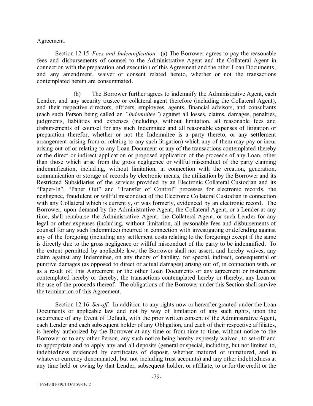-79- 116549.01049/133615933v.2 Agreement. Section 12.15 Fees and Indemnification. (a) The Borrower agrees to pay the reasonable fees and disbursements of counsel to the Administrative Agent and the Collateral Agent in connection with the preparation and execution of this Agreement and the other Loan Documents, and any amendment, waiver or consent related hereto, whether or not the transactions contemplated herein are consummated. (b) The Borrower further agrees to indemnify the Administrative Agent, each Lender, and any security trustee or collateral agent therefore (including the Collateral Agent), and their respective directors, officers, employees, agents, financial advisors, and consultants (each such Person being called an “Indemnitee”) against all losses, claims, damages, penalties, judgments, liabilities and expenses (including, without limitation, all reasonable fees and disbursements of counsel for any such Indemnitee and all reasonable expenses of litigation or preparation therefor, whether or not the Indemnitee is a party thereto, or any settlement arrangement arising from or relating to any such litigation) which any of them may pay or incur arising out of or relating to any Loan Document or any of the transactions contemplated thereby or the direct or indirect application or proposed application of the proceeds of any Loan, other than those which arise from the gross negligence or willful misconduct of the party claiming indemnification, including, without limitation, in connection with the creation, generation, communication or storage of records by electronic means, the utilization by the Borrower and its Restricted Subsidiaries of the services provided by an Electronic Collateral Custodian and its “Paper-In”, “Paper Out” and “Transfer of Control” processes for electronic records, the negligence, fraudulent or willful misconduct of the Electronic Collateral Custodian in connection with any Collateral which is currently, or was formerly, evidenced by an electronic record. The Borrower, upon demand by the Administrative Agent, the Collateral Agent, or a Lender at any time, shall reimburse the Administrative Agent, the Collateral Agent, or such Lender for any legal or other expenses (including, without limitation, all reasonable fees and disbursements of counsel for any such Indemnitee) incurred in connection with investigating or defending against any of the foregoing (including any settlement costs relating to the foregoing) except if the same is directly due to the gross negligence or willful misconduct of the party to be indemnified. To the extent permitted by applicable law, the Borrower shall not assert, and hereby waives, any claim against any Indemnitee, on any theory of liability, for special, indirect, consequential or punitive damages (as opposed to direct or actual damages) arising out of, in connection with, or as a result of, this Agreement or the other Loan Documents or any agreement or instrument contemplated hereby or thereby, the transactions contemplated hereby or thereby, any Loan or the use of the proceeds thereof. The obligations of the Borrower under this Section shall survive the termination of this Agreement. Section 12.16 Set-off. In addition to any rights now or hereafter granted under the Loan Documents or applicable law and not by way of limitation of any such rights, upon the occurrence of any Event of Default, with the prior written consent of the Administrative Agent, each Lender and each subsequent holder of any Obligation, and each of their respective affiliates, is hereby authorized by the Borrower at any time or from time to time, without notice to the Borrower or to any other Person, any such notice being hereby expressly waived, to set-off and to appropriate and to apply any and all deposits (general or special, including, but not limited to, indebtedness evidenced by certificates of deposit, whether matured or unmatured, and in whatever currency denominated, but not including trust accounts) and any other indebtedness at any time held or owing by that Lender, subsequent holder, or affiliate, to or for the credit or the