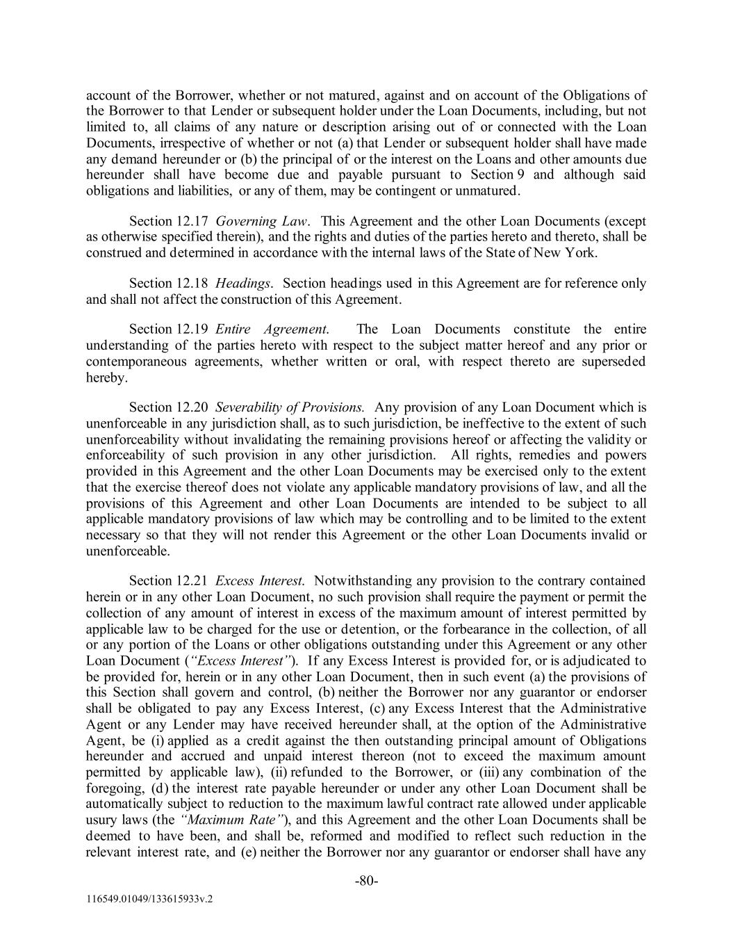 -80- 116549.01049/133615933v.2 account of the Borrower, whether or not matured, against and on account of the Obligations of the Borrower to that Lender or subsequent holder under the Loan Documents, including, but not limited to, all claims of any nature or description arising out of or connected with the Loan Documents, irrespective of whether or not (a) that Lender or subsequent holder shall have made any demand hereunder or (b) the principal of or the interest on the Loans and other amounts due hereunder shall have become due and payable pursuant to Section 9 and although said obligations and liabilities, or any of them, may be contingent or unmatured. Section 12.17 Governing Law. This Agreement and the other Loan Documents (except as otherwise specified therein), and the rights and duties of the parties hereto and thereto, shall be construed and determined in accordance with the internal laws of the State of New York. Section 12.18 Headings. Section headings used in this Agreement are for reference only and shall not affect the construction of this Agreement. Section 12.19 Entire Agreement. The Loan Documents constitute the entire understanding of the parties hereto with respect to the subject matter hereof and any prior or contemporaneous agreements, whether written or oral, with respect thereto are superseded hereby. Section 12.20 Severability of Provisions. Any provision of any Loan Document which is unenforceable in any jurisdiction shall, as to such jurisdiction, be ineffective to the extent of such unenforceability without invalidating the remaining provisions hereof or affecting the validity or enforceability of such provision in any other jurisdiction. All rights, remedies and powers provided in this Agreement and the other Loan Documents may be exercised only to the extent that the exercise thereof does not violate any applicable mandatory provisions of law, and all the provisions of this Agreement and other Loan Documents are intended to be subject to all applicable mandatory provisions of law which may be controlling and to be limited to the extent necessary so that they will not render this Agreement or the other Loan Documents invalid or unenforceable. Section 12.21 Excess Interest. Notwithstanding any provision to the contrary contained herein or in any other Loan Document, no such provision shall require the payment or permit the collection of any amount of interest in excess of the maximum amount of interest permitted by applicable law to be charged for the use or detention, or the forbearance in the collection, of all or any portion of the Loans or other obligations outstanding under this Agreement or any other Loan Document (“Excess Interest”). If any Excess Interest is provided for, or is adjudicated to be provided for, herein or in any other Loan Document, then in such event (a) the provisions of this Section shall govern and control, (b) neither the Borrower nor any guarantor or endorser shall be obligated to pay any Excess Interest, (c) any Excess Interest that the Administrative Agent or any Lender may have received hereunder shall, at the option of the Administrative Agent, be (i) applied as a credit against the then outstanding principal amount of Obligations hereunder and accrued and unpaid interest thereon (not to exceed the maximum amount permitted by applicable law), (ii) refunded to the Borrower, or (iii) any combination of the foregoing, (d) the interest rate payable hereunder or under any other Loan Document shall be automatically subject to reduction to the maximum lawful contract rate allowed under applicable usury laws (the “Maximum Rate”), and this Agreement and the other Loan Documents shall be deemed to have been, and shall be, reformed and modified to reflect such reduction in the relevant interest rate, and (e) neither the Borrower nor any guarantor or endorser shall have any