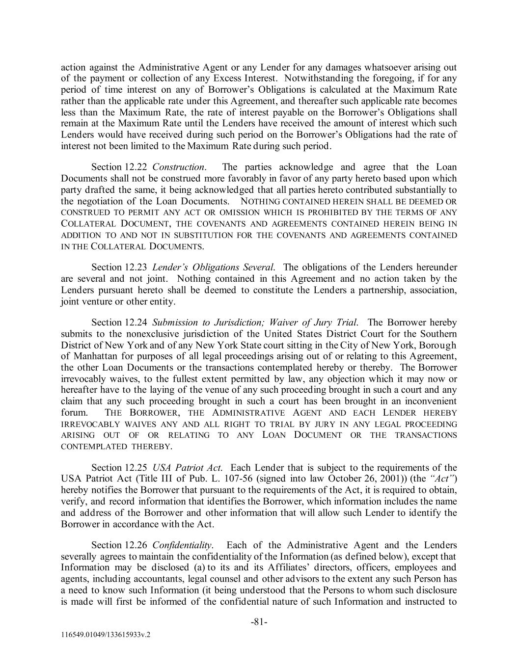 -81- 116549.01049/133615933v.2 action against the Administrative Agent or any Lender for any damages whatsoever arising out of the payment or collection of any Excess Interest. Notwithstanding the foregoing, if for any period of time interest on any of Borrower’s Obligations is calculated at the Maximum Rate rather than the applicable rate under this Agreement, and thereafter such applicable rate becomes less than the Maximum Rate, the rate of interest payable on the Borrower’s Obligations shall remain at the Maximum Rate until the Lenders have received the amount of interest which such Lenders would have received during such period on the Borrower’s Obligations had the rate of interest not been limited to the Maximum Rate during such period. Section 12.22 Construction. The parties acknowledge and agree that the Loan Documents shall not be construed more favorably in favor of any party hereto based upon which party drafted the same, it being acknowledged that all parties hereto contributed substantially to the negotiation of the Loan Documents. NOTHING CONTAINED HEREIN SHALL BE DEEMED OR CONSTRUED TO PERMIT ANY ACT OR OMISSION WHICH IS PROHIBITED BY THE TERMS OF ANY COLLATERAL DOCUMENT, THE COVENANTS AND AGREEMENTS CONTAINED HEREIN BEING IN ADDITION TO AND NOT IN SUBSTITUTION FOR THE COVENANTS AND AGREEMENTS CONTAINED IN THE COLLATERAL DOCUMENTS. Section 12.23 Lender’s Obligations Several. The obligations of the Lenders hereunder are several and not joint. Nothing contained in this Agreement and no action taken by the Lenders pursuant hereto shall be deemed to constitute the Lenders a partnership, association, joint venture or other entity. Section 12.24 Submission to Jurisdiction; Waiver of Jury Trial. The Borrower hereby submits to the nonexclusive jurisdiction of the United States District Court for the Southern District of New York and of any New York State court sitting in the City of New York, Borough of Manhattan for purposes of all legal proceedings arising out of or relating to this Agreement, the other Loan Documents or the transactions contemplated hereby or thereby. The Borrower irrevocably waives, to the fullest extent permitted by law, any objection which it may now or hereafter have to the laying of the venue of any such proceeding brought in such a court and any claim that any such proceeding brought in such a court has been brought in an inconvenient forum. THE BORROWER, THE ADMINISTRATIVE AGENT AND EACH LENDER HEREBY IRREVOCABLY WAIVES ANY AND ALL RIGHT TO TRIAL BY JURY IN ANY LEGAL PROCEEDING ARISING OUT OF OR RELATING TO ANY LOAN DOCUMENT OR THE TRANSACTIONS CONTEMPLATED THEREBY. Section 12.25 USA Patriot Act. Each Lender that is subject to the requirements of the USA Patriot Act (Title III of Pub. L. 107-56 (signed into law October 26, 2001)) (the “Act”) hereby notifies the Borrower that pursuant to the requirements of the Act, it is required to obtain, verify, and record information that identifies the Borrower, which information includes the name and address of the Borrower and other information that will allow such Lender to identify the Borrower in accordance with the Act. Section 12.26 Confidentiality. Each of the Administrative Agent and the Lenders severally agrees to maintain the confidentiality of the Information (as defined below), except that Information may be disclosed (a) to its and its Affiliates’ directors, officers, employees and agents, including accountants, legal counsel and other advisors to the extent any such Person has a need to know such Information (it being understood that the Persons to whom such disclosure is made will first be informed of the confidential nature of such Information and instructed to