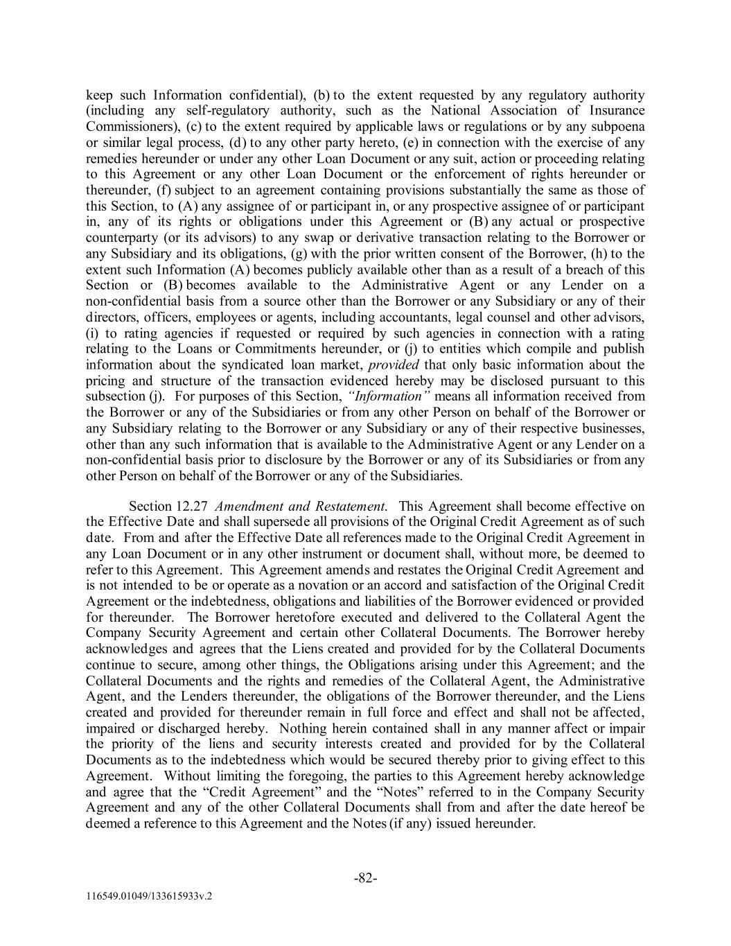 -82- 116549.01049/133615933v.2 keep such Information confidential), (b) to the extent requested by any regulatory authority (including any self-regulatory authority, such as the National Association of Insurance Commissioners), (c) to the extent required by applicable laws or regulations or by any subpoena or similar legal process, (d) to any other party hereto, (e) in connection with the exercise of any remedies hereunder or under any other Loan Document or any suit, action or proceeding relating to this Agreement or any other Loan Document or the enforcement of rights hereunder or thereunder, (f) subject to an agreement containing provisions substantially the same as those of this Section, to (A) any assignee of or participant in, or any prospective assignee of or participant in, any of its rights or obligations under this Agreement or (B) any actual or prospective counterparty (or its advisors) to any swap or derivative transaction relating to the Borrower or any Subsidiary and its obligations, (g) with the prior written consent of the Borrower, (h) to the extent such Information (A) becomes publicly available other than as a result of a breach of this Section or (B) becomes available to the Administrative Agent or any Lender on a non-confidential basis from a source other than the Borrower or any Subsidiary or any of their directors, officers, employees or agents, including accountants, legal counsel and other advisors, (i) to rating agencies if requested or required by such agencies in connection with a rating relating to the Loans or Commitments hereunder, or (j) to entities which compile and publish information about the syndicated loan market, provided that only basic information about the pricing and structure of the transaction evidenced hereby may be disclosed pursuant to this subsection (j). For purposes of this Section, “Information” means all information received from the Borrower or any of the Subsidiaries or from any other Person on behalf of the Borrower or any Subsidiary relating to the Borrower or any Subsidiary or any of their respective businesses, other than any such information that is available to the Administrative Agent or any Lender on a non-confidential basis prior to disclosure by the Borrower or any of its Subsidiaries or from any other Person on behalf of the Borrower or any of the Subsidiaries. Section 12.27 Amendment and Restatement. This Agreement shall become effective on the Effective Date and shall supersede all provisions of the Original Credit Agreement as of such date. From and after the Effective Date all references made to the Original Credit Agreement in any Loan Document or in any other instrument or document shall, without more, be deemed to refer to this Agreement. This Agreement amends and restates the Original Credit Agreement and is not intended to be or operate as a novation or an accord and satisfaction of the Original Credit Agreement or the indebtedness, obligations and liabilities of the Borrower evidenced or provided for thereunder. The Borrower heretofore executed and delivered to the Collateral Agent the Company Security Agreement and certain other Collateral Documents. The Borrower hereby acknowledges and agrees that the Liens created and provided for by the Collateral Documents continue to secure, among other things, the Obligations arising under this Agreement; and the Collateral Documents and the rights and remedies of the Collateral Agent, the Administrative Agent, and the Lenders thereunder, the obligations of the Borrower thereunder, and the Liens created and provided for thereunder remain in full force and effect and shall not be affected, impaired or discharged hereby. Nothing herein contained shall in any manner affect or impair the priority of the liens and security interests created and provided for by the Collateral Documents as to the indebtedness which would be secured thereby prior to giving effect to this Agreement. Without limiting the foregoing, the parties to this Agreement hereby acknowledge and agree that the “Credit Agreement” and the “Notes” referred to in the Company Security Agreement and any of the other Collateral Documents shall from and after the date hereof be deemed a reference to this Agreement and the Notes (if any) issued hereunder.