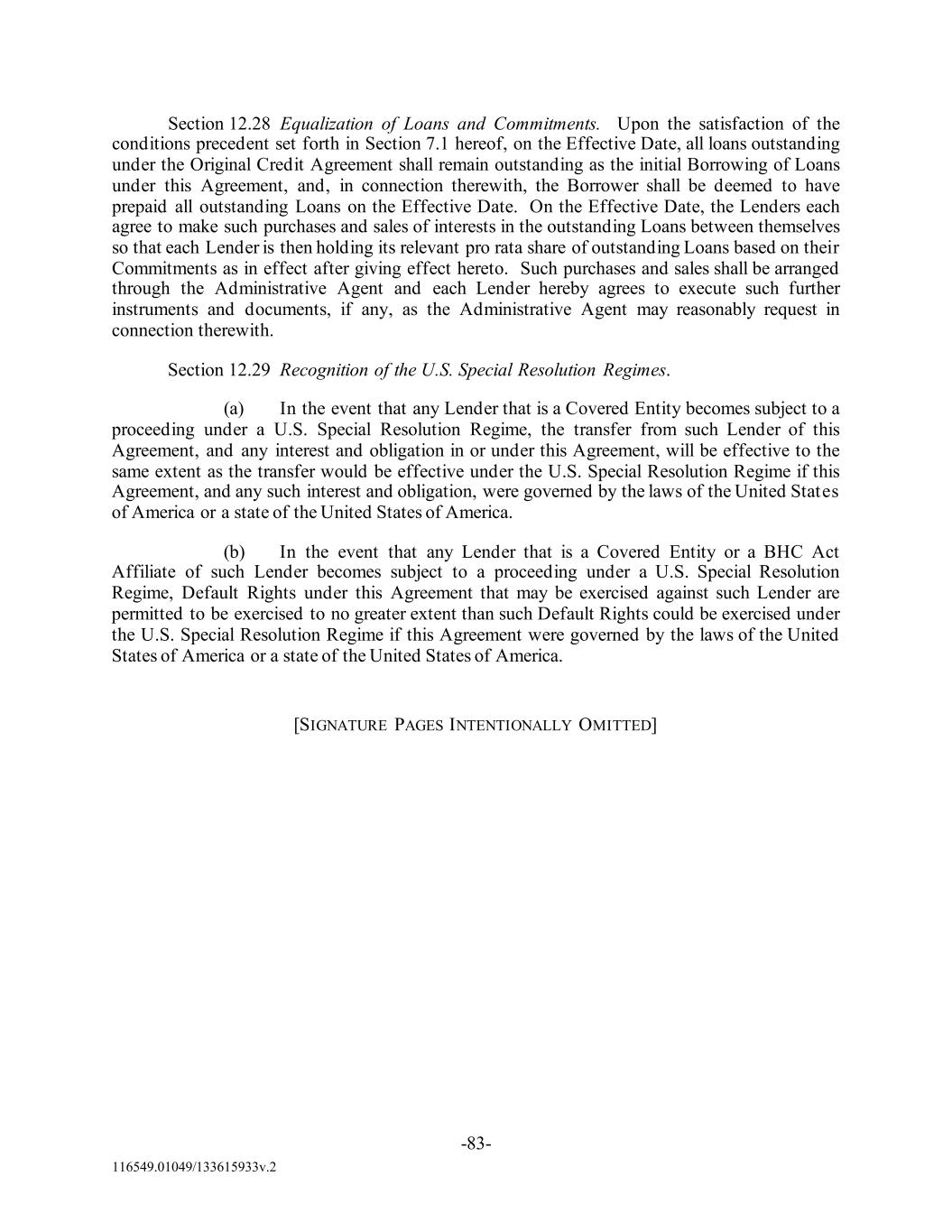 -83- 116549.01049/133615933v.2 Section 12.28 Equalization of Loans and Commitments. Upon the satisfaction of the conditions precedent set forth in Section 7.1 hereof, on the Effective Date, all loans outstanding under the Original Credit Agreement shall remain outstanding as the initial Borrowing of Loans under this Agreement, and, in connection therewith, the Borrower shall be deemed to have prepaid all outstanding Loans on the Effective Date. On the Effective Date, the Lenders each agree to make such purchases and sales of interests in the outstanding Loans between themselves so that each Lender is then holding its relevant pro rata share of outstanding Loans based on their Commitments as in effect after giving effect hereto. Such purchases and sales shall be arranged through the Administrative Agent and each Lender hereby agrees to execute such further instruments and documents, if any, as the Administrative Agent may reasonably request in connection therewith. Section 12.29 Recognition of the U.S. Special Resolution Regimes. (a) In the event that any Lender that is a Covered Entity becomes subject to a proceeding under a U.S. Special Resolution Regime, the transfer from such Lender of this Agreement, and any interest and obligation in or under this Agreement, will be effective to the same extent as the transfer would be effective under the U.S. Special Resolution Regime if this Agreement, and any such interest and obligation, were governed by the laws of the United States of America or a state of the United States of America. (b) In the event that any Lender that is a Covered Entity or a BHC Act Affiliate of such Lender becomes subject to a proceeding under a U.S. Special Resolution Regime, Default Rights under this Agreement that may be exercised against such Lender are permitted to be exercised to no greater extent than such Default Rights could be exercised under the U.S. Special Resolution Regime if this Agreement were governed by the laws of the United States of America or a state of the United States of America. [SIGNATURE PAGES INTENTIONALLY OMITTED]