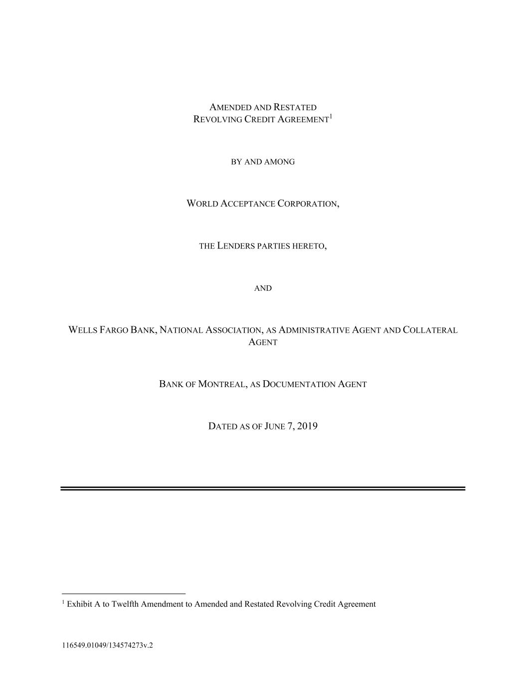 116549.01049/134574273v.2 AMENDED AND RESTATED REVOLVING CREDIT AGREEMENT1 BY AND AMONG WORLD ACCEPTANCE CORPORATION, THE LENDERS PARTIES HERETO, AND WELLS FARGO BANK, NATIONAL ASSOCIATION, AS ADMINISTRATIVE AGENT AND COLLATERAL AGENT BANK OF MONTREAL, AS DOCUMENTATION AGENT DATED AS OF JUNE 7, 2019 1 Exhibit A to Twelfth Amendment to Amended and Restated Revolving Credit Agreement
