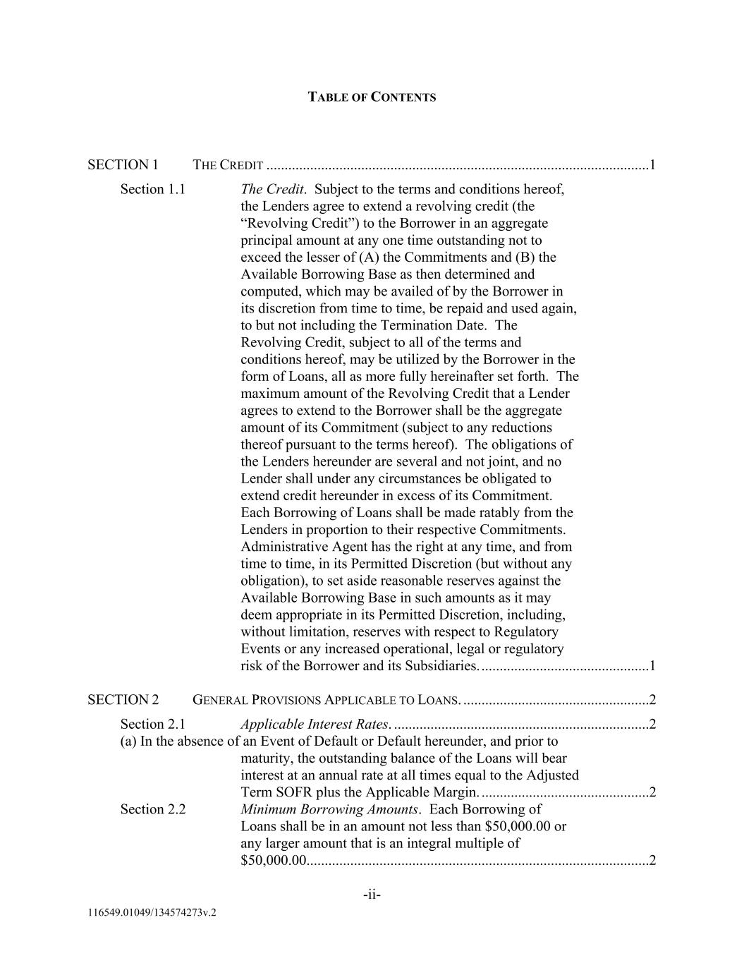 -ii- 116549.01049/134574273v.2 TABLE OF CONTENTS SECTION 1  THE CREDIT .........................................................................................................1  Section 1.1  The Credit. Subject to the terms and conditions hereof, the Lenders agree to extend a revolving credit (the “Revolving Credit”) to the Borrower in an aggregate principal amount at any one time outstanding not to exceed the lesser of (A) the Commitments and (B) the Available Borrowing Base as then determined and computed, which may be availed of by the Borrower in its discretion from time to time, be repaid and used again, to but not including the Termination Date. The Revolving Credit, subject to all of the terms and conditions hereof, may be utilized by the Borrower in the form of Loans, all as more fully hereinafter set forth. The maximum amount of the Revolving Credit that a Lender agrees to extend to the Borrower shall be the aggregate amount of its Commitment (subject to any reductions thereof pursuant to the terms hereof). The obligations of the Lenders hereunder are several and not joint, and no Lender shall under any circumstances be obligated to extend credit hereunder in excess of its Commitment. Each Borrowing of Loans shall be made ratably from the Lenders in proportion to their respective Commitments. Administrative Agent has the right at any time, and from time to time, in its Permitted Discretion (but without any obligation), to set aside reasonable reserves against the Available Borrowing Base in such amounts as it may deem appropriate in its Permitted Discretion, including, without limitation, reserves with respect to Regulatory Events or any increased operational, legal or regulatory risk of the Borrower and its Subsidiaries. ..............................................1  SECTION 2  GENERAL PROVISIONS APPLICABLE TO LOANS. ...................................................2  Section 2.1  Applicable Interest Rates. ......................................................................2  (a) In the absence of an Event of Default or Default hereunder, and prior to maturity, the outstanding balance of the Loans will bear interest at an annual rate at all times equal to the Adjusted Term SOFR plus the Applicable Margin. ..............................................2  Section 2.2  Minimum Borrowing Amounts. Each Borrowing of Loans shall be in an amount not less than $50,000.00 or any larger amount that is an integral multiple of $50,000.00..............................................................................................2