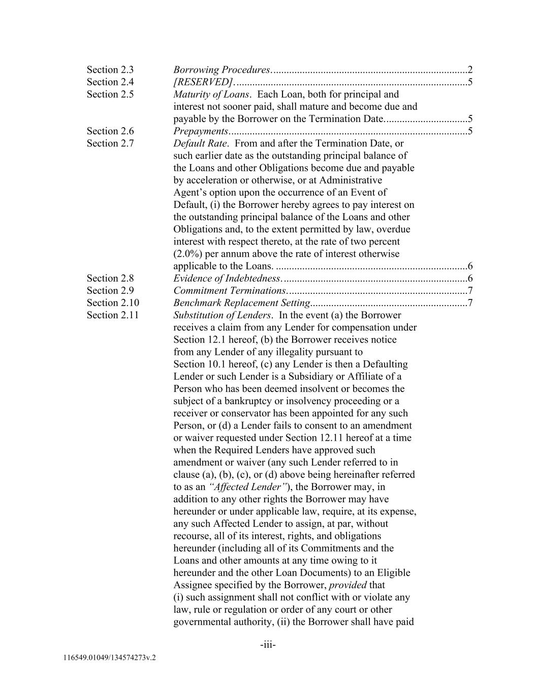 -iii- 116549.01049/134574273v.2 Section 2.3  Borrowing Procedures. ..........................................................................2  Section 2.4  [RESERVED]. ........................................................................................5  Section 2.5  Maturity of Loans. Each Loan, both for principal and interest not sooner paid, shall mature and become due and payable by the Borrower on the Termination Date. ...............................5  Section 2.6  Prepayments. ..........................................................................................5  Section 2.7  Default Rate. From and after the Termination Date, or such earlier date as the outstanding principal balance of the Loans and other Obligations become due and payable by acceleration or otherwise, or at Administrative Agent’s option upon the occurrence of an Event of Default, (i) the Borrower hereby agrees to pay interest on the outstanding principal balance of the Loans and other Obligations and, to the extent permitted by law, overdue interest with respect thereto, at the rate of two percent (2.0%) per annum above the rate of interest otherwise applicable to the Loans. .........................................................................6  Section 2.8  Evidence of Indebtedness. ......................................................................6  Section 2.9  Commitment Terminations. ....................................................................7  Section 2.10  Benchmark Replacement Setting. ...........................................................7  Section 2.11  Substitution of Lenders. In the event (a) the Borrower receives a claim from any Lender for compensation under Section 12.1 hereof, (b) the Borrower receives notice from any Lender of any illegality pursuant to Section 10.1 hereof, (c) any Lender is then a Defaulting Lender or such Lender is a Subsidiary or Affiliate of a Person who has been deemed insolvent or becomes the subject of a bankruptcy or insolvency proceeding or a receiver or conservator has been appointed for any such Person, or (d) a Lender fails to consent to an amendment or waiver requested under Section 12.11 hereof at a time when the Required Lenders have approved such amendment or waiver (any such Lender referred to in clause (a), (b), (c), or (d) above being hereinafter referred to as an “Affected Lender”), the Borrower may, in addition to any other rights the Borrower may have hereunder or under applicable law, require, at its expense, any such Affected Lender to assign, at par, without recourse, all of its interest, rights, and obligations hereunder (including all of its Commitments and the Loans and other amounts at any time owing to it hereunder and the other Loan Documents) to an Eligible Assignee specified by the Borrower, provided that (i) such assignment shall not conflict with or violate any law, rule or regulation or order of any court or other governmental authority, (ii) the Borrower shall have paid