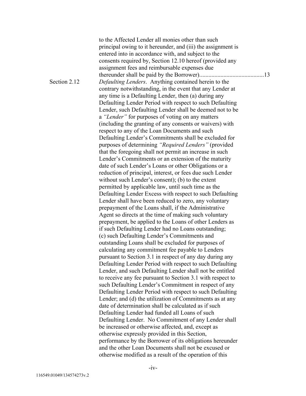 -iv- 116549.01049/134574273v.2 to the Affected Lender all monies other than such principal owing to it hereunder, and (iii) the assignment is entered into in accordance with, and subject to the consents required by, Section 12.10 hereof (provided any assignment fees and reimbursable expenses due thereunder shall be paid by the Borrower). ..........................................13  Section 2.12  Defaulting Lenders. Anything contained herein to the contrary notwithstanding, in the event that any Lender at any time is a Defaulting Lender, then (a) during any Defaulting Lender Period with respect to such Defaulting Lender, such Defaulting Lender shall be deemed not to be a “Lender” for purposes of voting on any matters (including the granting of any consents or waivers) with respect to any of the Loan Documents and such Defaulting Lender’s Commitments shall be excluded for purposes of determining “Required Lenders” (provided that the foregoing shall not permit an increase in such Lender’s Commitments or an extension of the maturity date of such Lender’s Loans or other Obligations or a reduction of principal, interest, or fees due such Lender without such Lender’s consent); (b) to the extent permitted by applicable law, until such time as the Defaulting Lender Excess with respect to such Defaulting Lender shall have been reduced to zero, any voluntary prepayment of the Loans shall, if the Administrative Agent so directs at the time of making such voluntary prepayment, be applied to the Loans of other Lenders as if such Defaulting Lender had no Loans outstanding; (c) such Defaulting Lender’s Commitments and outstanding Loans shall be excluded for purposes of calculating any commitment fee payable to Lenders pursuant to Section 3.1 in respect of any day during any Defaulting Lender Period with respect to such Defaulting Lender, and such Defaulting Lender shall not be entitled to receive any fee pursuant to Section 3.1 with respect to such Defaulting Lender’s Commitment in respect of any Defaulting Lender Period with respect to such Defaulting Lender; and (d) the utilization of Commitments as at any date of determination shall be calculated as if such Defaulting Lender had funded all Loans of such Defaulting Lender. No Commitment of any Lender shall be increased or otherwise affected, and, except as otherwise expressly provided in this Section, performance by the Borrower of its obligations hereunder and the other Loan Documents shall not be excused or otherwise modified as a result of the operation of this