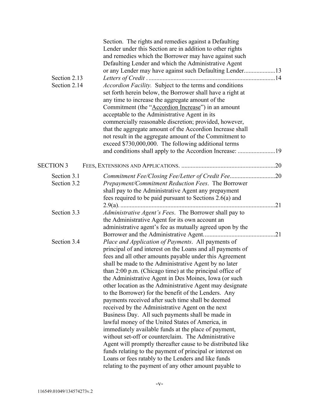 -v- 116549.01049/134574273v.2 Section. The rights and remedies against a Defaulting Lender under this Section are in addition to other rights and remedies which the Borrower may have against such Defaulting Lender and which the Administrative Agent or any Lender may have against such Defaulting Lender. ...................13  Section 2.13  Letters of Credit . .................................................................................14  Section 2.14  Accordion Facility. Subject to the terms and conditions set forth herein below, the Borrower shall have a right at any time to increase the aggregate amount of the Commitment (the “Accordion Increase”) in an amount acceptable to the Administrative Agent in its commercially reasonable discretion; provided, however, that the aggregate amount of the Accordion Increase shall not result in the aggregate amount of the Commitment to exceed $730,000,000. The following additional terms and conditions shall apply to the Accordion Increase: ........................19  SECTION 3  FEES, EXTENSIONS AND APPLICATIONS. ............................................................20  Section 3.1  Commitment Fee/Closing Fee/Letter of Credit Fee.............................20  Section 3.2  Prepayment/Commitment Reduction Fees. The Borrower shall pay to the Administrative Agent any prepayment fees required to be paid pursuant to Sections 2.6(a) and 2.9(a). ...................................................................................................21  Section 3.3  Administrative Agent’s Fees. The Borrower shall pay to the Administrative Agent for its own account an administrative agent’s fee as mutually agreed upon by the Borrower and the Administrative Agent. .............................................21  Section 3.4  Place and Application of Payments. All payments of principal of and interest on the Loans and all payments of fees and all other amounts payable under this Agreement shall be made to the Administrative Agent by no later than 2:00 p.m. (Chicago time) at the principal office of the Administrative Agent in Des Moines, Iowa (or such other location as the Administrative Agent may designate to the Borrower) for the benefit of the Lenders. Any payments received after such time shall be deemed received by the Administrative Agent on the next Business Day. All such payments shall be made in lawful money of the United States of America, in immediately available funds at the place of payment, without set-off or counterclaim. The Administrative Agent will promptly thereafter cause to be distributed like funds relating to the payment of principal or interest on Loans or fees ratably to the Lenders and like funds relating to the payment of any other amount payable to