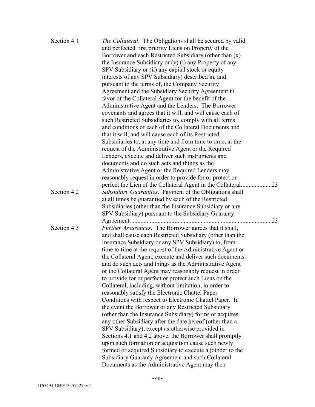 -vii- 116549.01049/134574273v.2 Section 4.1  The Collateral. The Obligations shall be secured by valid and perfected first priority Liens on Property of the Borrower and each Restricted Subsidiary (other than (x) the Insurance Subsidiary or (y) (i) any Property of any SPV Subsidiary or (ii) any capital stock or equity interests of any SPV Subsidiary) described in, and pursuant to the terms of, the Company Security Agreement and the Subsidiary Security Agreement in favor of the Collateral Agent for the benefit of the Administrative Agent and the Lenders. The Borrower covenants and agrees that it will, and will cause each of such Restricted Subsidiaries to, comply with all terms and conditions of each of the Collateral Documents and that it will, and will cause each of its Restricted Subsidiaries to, at any time and from time to time, at the request of the Administrative Agent or the Required Lenders, execute and deliver such instruments and documents and do such acts and things as the Administrative Agent or the Required Lenders may reasonably request in order to provide for or protect or perfect the Lien of the Collateral Agent in the Collateral. ...................23  Section 4.2  Subsidiary Guaranties. Payment of the Obligations shall at all times be guarantied by each of the Restricted Subsidiaries (other than the Insurance Subsidiary or any SPV Subsidiary) pursuant to the Subsidiary Guaranty Agreement. ...........................................................................................23  Section 4.3  Further Assurances. The Borrower agrees that it shall, and shall cause each Restricted Subsidiary (other than the Insurance Subsidiary or any SPV Subsidiary) to, from time to time at the request of the Administrative Agent or the Collateral Agent, execute and deliver such documents and do such acts and things as the Administrative Agent or the Collateral Agent may reasonably request in order to provide for or perfect or protect such Liens on the Collateral, including, without limitation, in order to reasonably satisfy the Electronic Chattel Paper Conditions with respect to Electronic Chattel Paper. In the event the Borrower or any Restricted Subsidiary (other than the Insurance Subsidiary) forms or acquires any other Subsidiary after the date hereof (other than a SPV Subsidiary), except as otherwise provided in Sections 4.1 and 4.2 above, the Borrower shall promptly upon such formation or acquisition cause such newly formed or acquired Subsidiary to execute a joinder to the Subsidiary Guaranty Agreement and such Collateral Documents as the Administrative Agent may then