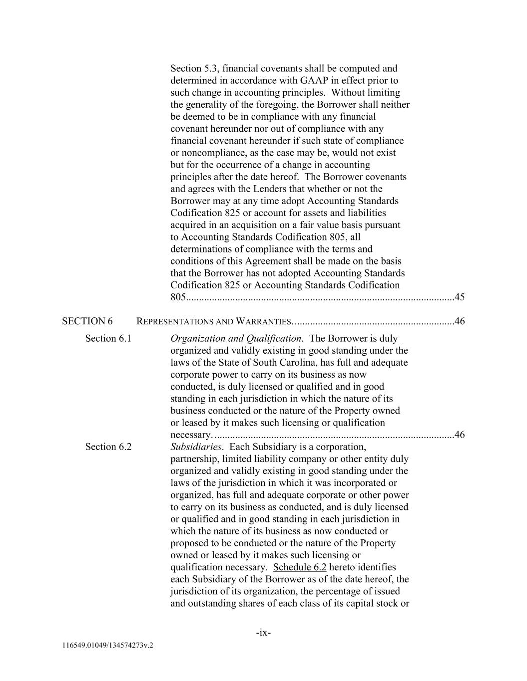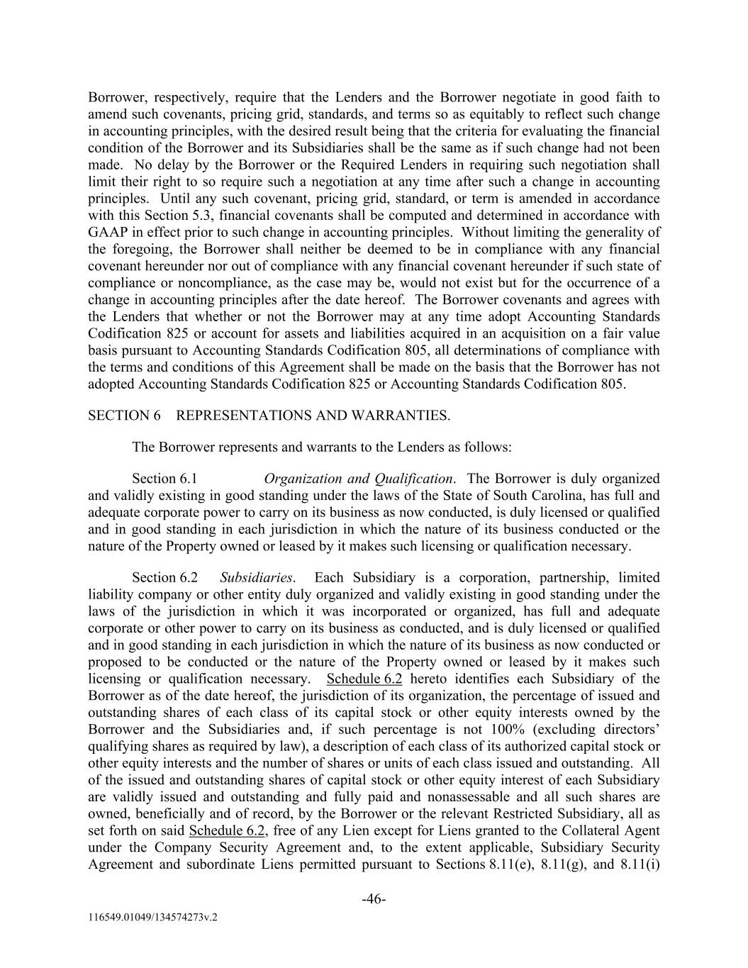 -ix- 116549.01049/134574273v.2 Section 5.3, financial covenants shall be computed and determined in accordance with GAAP in effect prior to such change in accounting principles. Without limiting the generality of the foregoing, the Borrower shall neither be deemed to be in compliance with any financial covenant hereunder nor out of compliance with any financial covenant hereunder if such state of compliance or noncompliance, as the case may be, would not exist but for the occurrence of a change in accounting principles after the date hereof. The Borrower covenants and agrees with the Lenders that whether or not the Borrower may at any time adopt Accounting Standards Codification 825 or account for assets and liabilities acquired in an acquisition on a fair value basis pursuant to Accounting Standards Codification 805, all determinations of compliance with the terms and conditions of this Agreement shall be made on the basis that the Borrower has not adopted Accounting Standards Codification 825 or Accounting Standards Codification 805........................................................................................................45  SECTION 6  REPRESENTATIONS AND WARRANTIES. ..............................................................46  Section 6.1  Organization and Qualification. The Borrower is duly organized and validly existing in good standing under the laws of the State of South Carolina, has full and adequate corporate power to carry on its business as now conducted, is duly licensed or qualified and in good standing in each jurisdiction in which the nature of its business conducted or the nature of the Property owned or leased by it makes such licensing or qualification necessary. .............................................................................................46  Section 6.2  Subsidiaries. Each Subsidiary is a corporation, partnership, limited liability company or other entity duly organized and validly existing in good standing under the laws of the jurisdiction in which it was incorporated or organized, has full and adequate corporate or other power to carry on its business as conducted, and is duly licensed or qualified and in good standing in each jurisdiction in which the nature of its business as now conducted or proposed to be conducted or the nature of the Property owned or leased by it makes such licensing or qualification necessary. Schedule 6.2 hereto identifies each Subsidiary of the Borrower as of the date hereof, the jurisdiction of its organization, the percentage of issued and outstanding shares of each class of its capital stock or