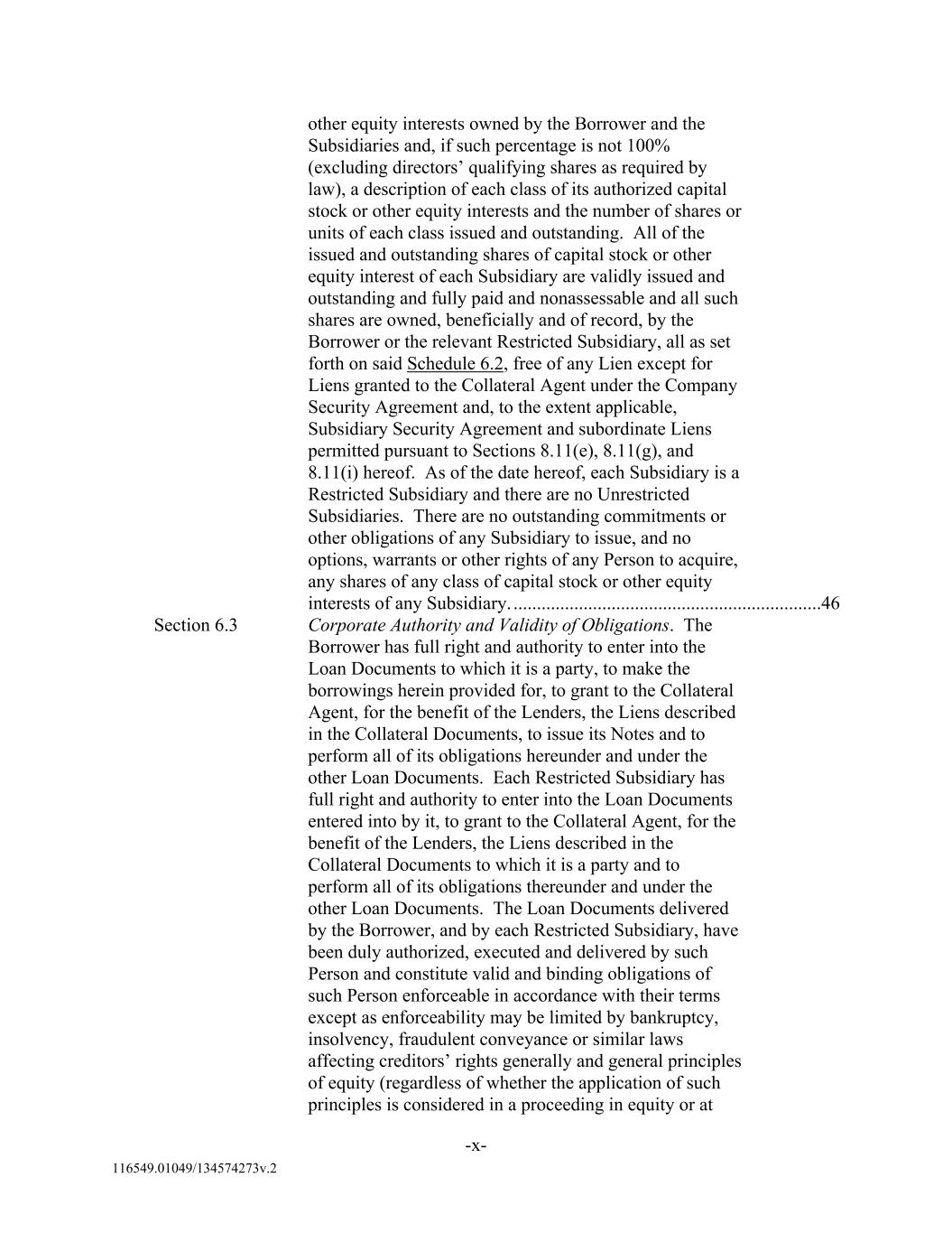 -x- 116549.01049/134574273v.2 other equity interests owned by the Borrower and the Subsidiaries and, if such percentage is not 100% (excluding directors’ qualifying shares as required by law), a description of each class of its authorized capital stock or other equity interests and the number of shares or units of each class issued and outstanding. All of the issued and outstanding shares of capital stock or other equity interest of each Subsidiary are validly issued and outstanding and fully paid and nonassessable and all such shares are owned, beneficially and of record, by the Borrower or the relevant Restricted Subsidiary, all as set forth on said Schedule 6.2, free of any Lien except for Liens granted to the Collateral Agent under the Company Security Agreement and, to the extent applicable, Subsidiary Security Agreement and subordinate Liens permitted pursuant to Sections 8.11(e), 8.11(g), and 8.11(i) hereof. As of the date hereof, each Subsidiary is a Restricted Subsidiary and there are no Unrestricted Subsidiaries. There are no outstanding commitments or other obligations of any Subsidiary to issue, and no options, warrants or other rights of any Person to acquire, any shares of any class of capital stock or other equity interests of any Subsidiary. ..................................................................46  Section 6.3  Corporate Authority and Validity of Obligations. The Borrower has full right and authority to enter into the Loan Documents to which it is a party, to make the borrowings herein provided for, to grant to the Collateral Agent, for the benefit of the Lenders, the Liens described in the Collateral Documents, to issue its Notes and to perform all of its obligations hereunder and under the other Loan Documents. Each Restricted Subsidiary has full right and authority to enter into the Loan Documents entered into by it, to grant to the Collateral Agent, for the benefit of the Lenders, the Liens described in the Collateral Documents to which it is a party and to perform all of its obligations thereunder and under the other Loan Documents. The Loan Documents delivered by the Borrower, and by each Restricted Subsidiary, have been duly authorized, executed and delivered by such Person and constitute valid and binding obligations of such Person enforceable in accordance with their terms except as enforceability may be limited by bankruptcy, insolvency, fraudulent conveyance or similar laws affecting creditors’ rights generally and general principles of equity (regardless of whether the application of such principles is considered in a proceeding in equity or at