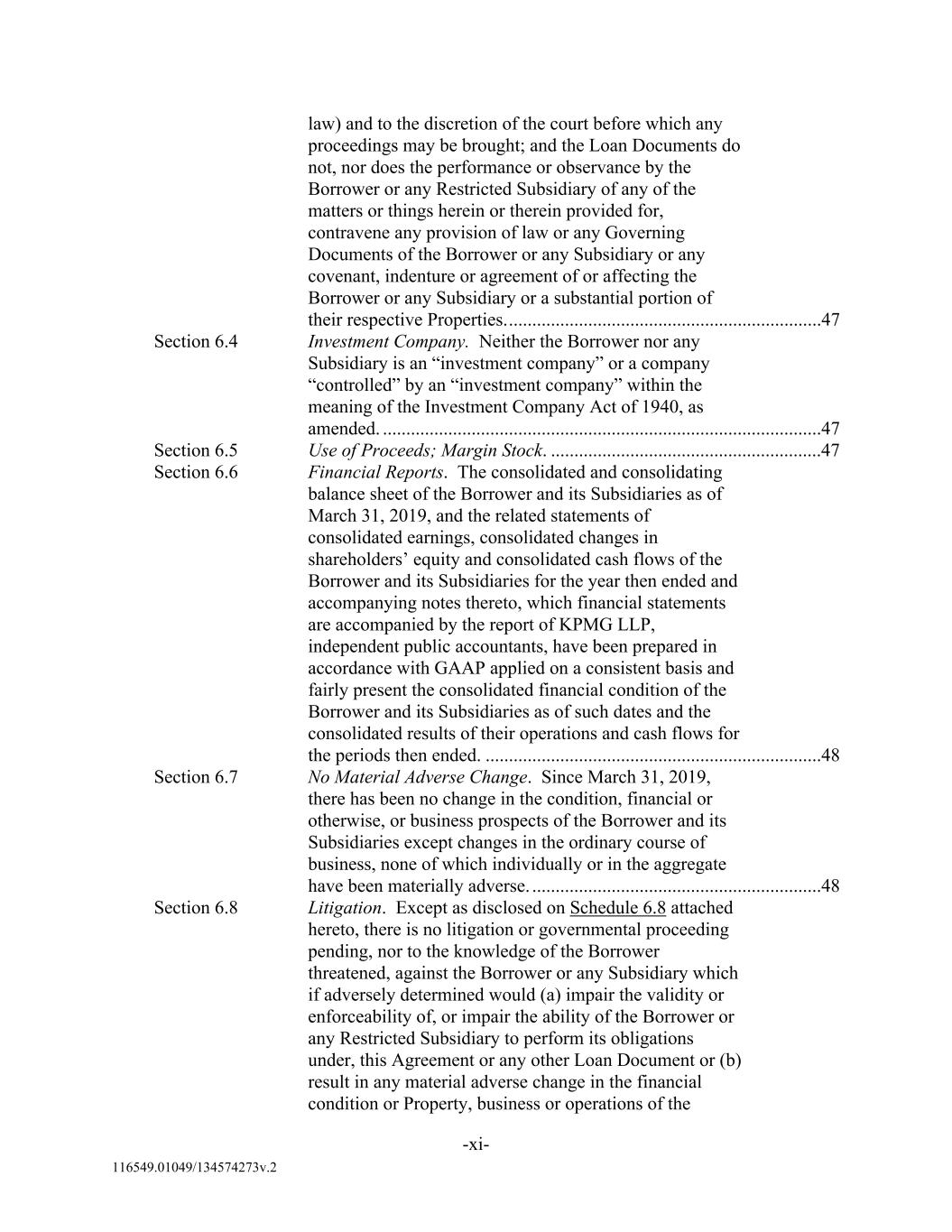 -xi- 116549.01049/134574273v.2 law) and to the discretion of the court before which any proceedings may be brought; and the Loan Documents do not, nor does the performance or observance by the Borrower or any Restricted Subsidiary of any of the matters or things herein or therein provided for, contravene any provision of law or any Governing Documents of the Borrower or any Subsidiary or any covenant, indenture or agreement of or affecting the Borrower or any Subsidiary or a substantial portion of their respective Properties. ...................................................................47  Section 6.4  Investment Company. Neither the Borrower nor any Subsidiary is an “investment company” or a company “controlled” by an “investment company” within the meaning of the Investment Company Act of 1940, as amended. ..............................................................................................47  Section 6.5  Use of Proceeds; Margin Stock. ..........................................................47  Section 6.6  Financial Reports. The consolidated and consolidating balance sheet of the Borrower and its Subsidiaries as of March 31, 2019, and the related statements of consolidated earnings, consolidated changes in shareholders’ equity and consolidated cash flows of the Borrower and its Subsidiaries for the year then ended and accompanying notes thereto, which financial statements are accompanied by the report of KPMG LLP, independent public accountants, have been prepared in accordance with GAAP applied on a consistent basis and fairly present the consolidated financial condition of the Borrower and its Subsidiaries as of such dates and the consolidated results of their operations and cash flows for the periods then ended. ........................................................................48  Section 6.7  No Material Adverse Change. Since March 31, 2019, there has been no change in the condition, financial or otherwise, or business prospects of the Borrower and its Subsidiaries except changes in the ordinary course of business, none of which individually or in the aggregate have been materially adverse. ..............................................................48  Section 6.8  Litigation. Except as disclosed on Schedule 6.8 attached hereto, there is no litigation or governmental proceeding pending, nor to the knowledge of the Borrower threatened, against the Borrower or any Subsidiary which if adversely determined would (a) impair the validity or enforceability of, or impair the ability of the Borrower or any Restricted Subsidiary to perform its obligations under, this Agreement or any other Loan Document or (b) result in any material adverse change in the financial condition or Property, business or operations of the