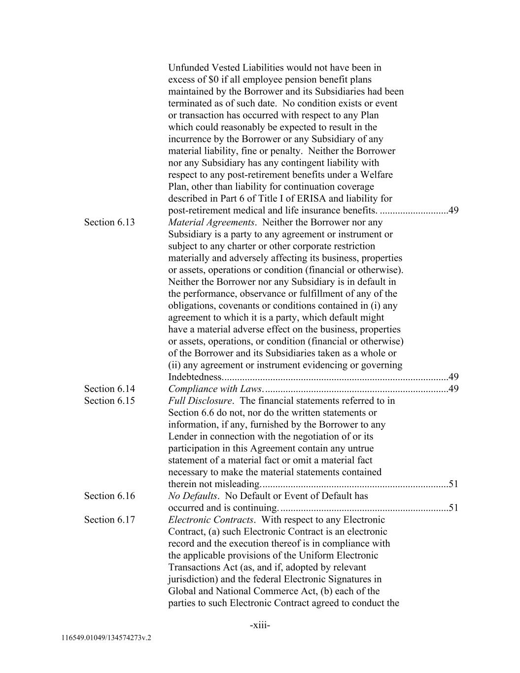 -xiii- 116549.01049/134574273v.2 Unfunded Vested Liabilities would not have been in excess of $0 if all employee pension benefit plans maintained by the Borrower and its Subsidiaries had been terminated as of such date. No condition exists or event or transaction has occurred with respect to any Plan which could reasonably be expected to result in the incurrence by the Borrower or any Subsidiary of any material liability, fine or penalty. Neither the Borrower nor any Subsidiary has any contingent liability with respect to any post-retirement benefits under a Welfare Plan, other than liability for continuation coverage described in Part 6 of Title I of ERISA and liability for post-retirement medical and life insurance benefits. ...........................49  Section 6.13  Material Agreements. Neither the Borrower nor any Subsidiary is a party to any agreement or instrument or subject to any charter or other corporate restriction materially and adversely affecting its business, properties or assets, operations or condition (financial or otherwise). Neither the Borrower nor any Subsidiary is in default in the performance, observance or fulfillment of any of the obligations, covenants or conditions contained in (i) any agreement to which it is a party, which default might have a material adverse effect on the business, properties or assets, operations, or condition (financial or otherwise) of the Borrower and its Subsidiaries taken as a whole or (ii) any agreement or instrument evidencing or governing Indebtedness. ........................................................................................49  Section 6.14  Compliance with Laws. ........................................................................49  Section 6.15  Full Disclosure. The financial statements referred to in Section 6.6 do not, nor do the written statements or information, if any, furnished by the Borrower to any Lender in connection with the negotiation of or its participation in this Agreement contain any untrue statement of a material fact or omit a material fact necessary to make the material statements contained therein not misleading. .........................................................................51  Section 6.16  No Defaults. No Default or Event of Default has occurred and is continuing. ..................................................................51  Section 6.17  Electronic Contracts. With respect to any Electronic Contract, (a) such Electronic Contract is an electronic record and the execution thereof is in compliance with the applicable provisions of the Uniform Electronic Transactions Act (as, and if, adopted by relevant jurisdiction) and the federal Electronic Signatures in Global and National Commerce Act, (b) each of the parties to such Electronic Contract agreed to conduct the