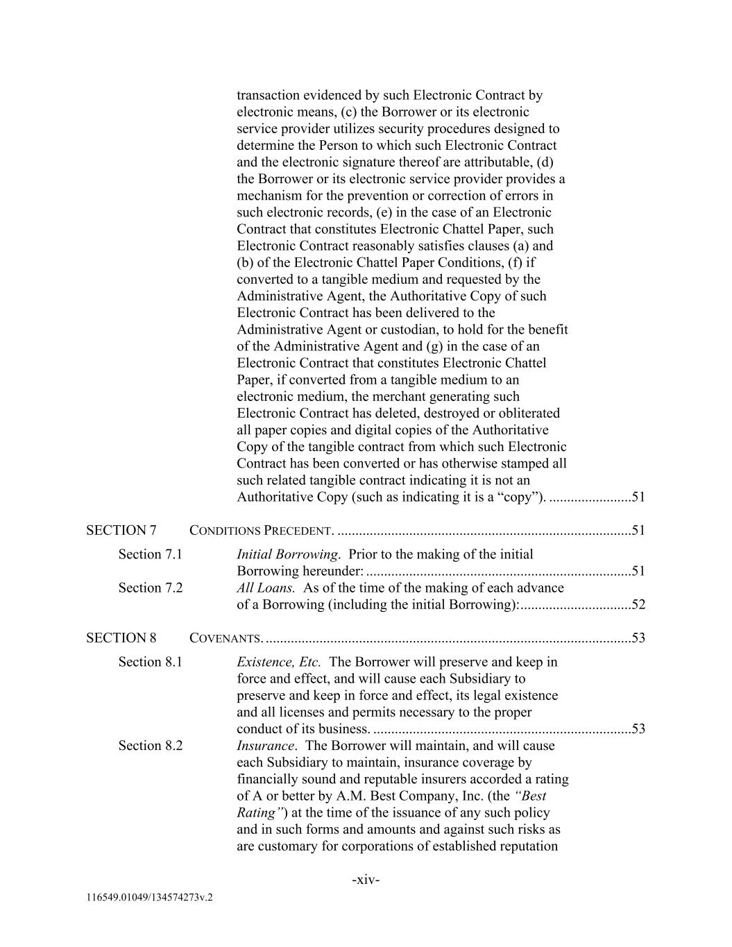 -xiv- 116549.01049/134574273v.2 transaction evidenced by such Electronic Contract by electronic means, (c) the Borrower or its electronic service provider utilizes security procedures designed to determine the Person to which such Electronic Contract and the electronic signature thereof are attributable, (d) the Borrower or its electronic service provider provides a mechanism for the prevention or correction of errors in such electronic records, (e) in the case of an Electronic Contract that constitutes Electronic Chattel Paper, such Electronic Contract reasonably satisfies clauses (a) and (b) of the Electronic Chattel Paper Conditions, (f) if converted to a tangible medium and requested by the Administrative Agent, the Authoritative Copy of such Electronic Contract has been delivered to the Administrative Agent or custodian, to hold for the benefit of the Administrative Agent and (g) in the case of an Electronic Contract that constitutes Electronic Chattel Paper, if converted from a tangible medium to an electronic medium, the merchant generating such Electronic Contract has deleted, destroyed or obliterated all paper copies and digital copies of the Authoritative Copy of the tangible contract from which such Electronic Contract has been converted or has otherwise stamped all such related tangible contract indicating it is not an Authoritative Copy (such as indicating it is a “copy”). .......................51  SECTION 7  CONDITIONS PRECEDENT. ..................................................................................51  Section 7.1  Initial Borrowing. Prior to the making of the initial Borrowing hereunder: ..........................................................................51  Section 7.2  All Loans. As of the time of the making of each advance of a Borrowing (including the initial Borrowing): ...............................52  SECTION 8  COVENANTS. ......................................................................................................53  Section 8.1  Existence, Etc. The Borrower will preserve and keep in force and effect, and will cause each Subsidiary to preserve and keep in force and effect, its legal existence and all licenses and permits necessary to the proper conduct of its business. ........................................................................53  Section 8.2  Insurance. The Borrower will maintain, and will cause each Subsidiary to maintain, insurance coverage by financially sound and reputable insurers accorded a rating of A or better by A.M. Best Company, Inc. (the “Best Rating”) at the time of the issuance of any such policy and in such forms and amounts and against such risks as are customary for corporations of established reputation