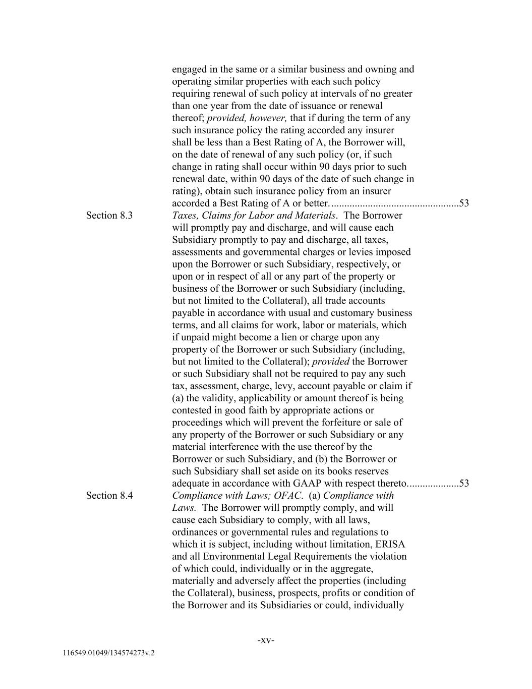 -xv- 116549.01049/134574273v.2 engaged in the same or a similar business and owning and operating similar properties with each such policy requiring renewal of such policy at intervals of no greater than one year from the date of issuance or renewal thereof; provided, however, that if during the term of any such insurance policy the rating accorded any insurer shall be less than a Best Rating of A, the Borrower will, on the date of renewal of any such policy (or, if such change in rating shall occur within 90 days prior to such renewal date, within 90 days of the date of such change in rating), obtain such insurance policy from an insurer accorded a Best Rating of A or better. .................................................53  Section 8.3  Taxes, Claims for Labor and Materials. The Borrower will promptly pay and discharge, and will cause each Subsidiary promptly to pay and discharge, all taxes, assessments and governmental charges or levies imposed upon the Borrower or such Subsidiary, respectively, or upon or in respect of all or any part of the property or business of the Borrower or such Subsidiary (including, but not limited to the Collateral), all trade accounts payable in accordance with usual and customary business terms, and all claims for work, labor or materials, which if unpaid might become a lien or charge upon any property of the Borrower or such Subsidiary (including, but not limited to the Collateral); provided the Borrower or such Subsidiary shall not be required to pay any such tax, assessment, charge, levy, account payable or claim if (a) the validity, applicability or amount thereof is being contested in good faith by appropriate actions or proceedings which will prevent the forfeiture or sale of any property of the Borrower or such Subsidiary or any material interference with the use thereof by the Borrower or such Subsidiary, and (b) the Borrower or such Subsidiary shall set aside on its books reserves adequate in accordance with GAAP with respect thereto. ...................53  Section 8.4  Compliance with Laws; OFAC. (a) Compliance with Laws. The Borrower will promptly comply, and will cause each Subsidiary to comply, with all laws, ordinances or governmental rules and regulations to which it is subject, including without limitation, ERISA and all Environmental Legal Requirements the violation of which could, individually or in the aggregate, materially and adversely affect the properties (including the Collateral), business, prospects, profits or condition of the Borrower and its Subsidiaries or could, individually