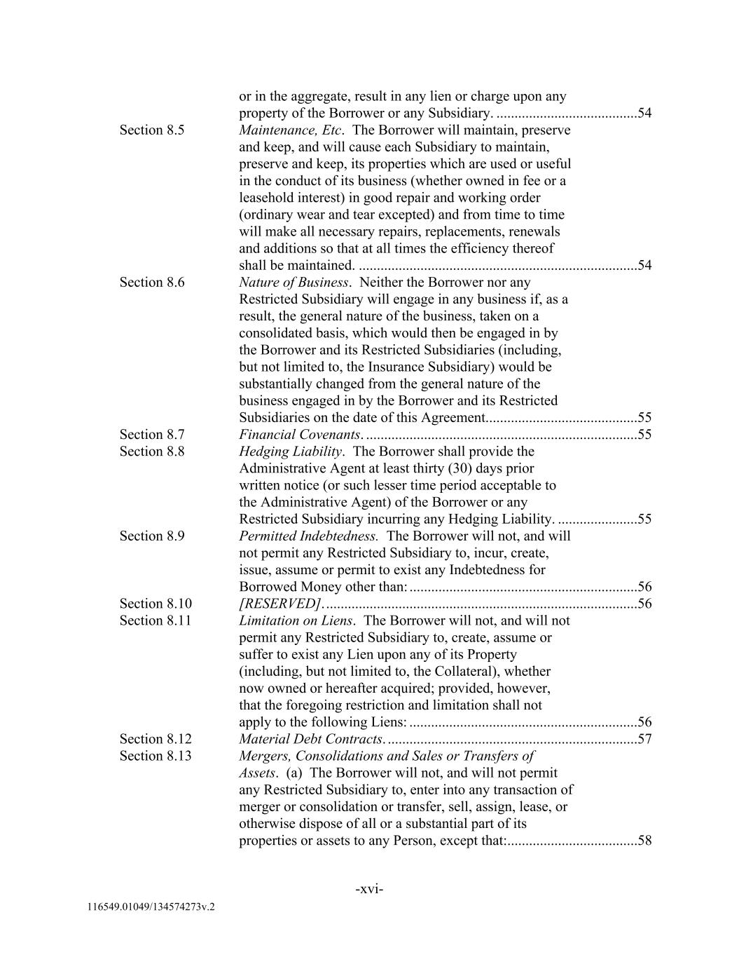 -xvi- 116549.01049/134574273v.2 or in the aggregate, result in any lien or charge upon any property of the Borrower or any Subsidiary. .......................................54  Section 8.5  Maintenance, Etc. The Borrower will maintain, preserve and keep, and will cause each Subsidiary to maintain, preserve and keep, its properties which are used or useful in the conduct of its business (whether owned in fee or a leasehold interest) in good repair and working order (ordinary wear and tear excepted) and from time to time will make all necessary repairs, replacements, renewals and additions so that at all times the efficiency thereof shall be maintained. .............................................................................54  Section 8.6  Nature of Business. Neither the Borrower nor any Restricted Subsidiary will engage in any business if, as a result, the general nature of the business, taken on a consolidated basis, which would then be engaged in by the Borrower and its Restricted Subsidiaries (including, but not limited to, the Insurance Subsidiary) would be substantially changed from the general nature of the business engaged in by the Borrower and its Restricted Subsidiaries on the date of this Agreement. .........................................55  Section 8.7  Financial Covenants. ...........................................................................55  Section 8.8  Hedging Liability. The Borrower shall provide the Administrative Agent at least thirty (30) days prior written notice (or such lesser time period acceptable to the Administrative Agent) of the Borrower or any Restricted Subsidiary incurring any Hedging Liability. ......................55  Section 8.9  Permitted Indebtedness. The Borrower will not, and will not permit any Restricted Subsidiary to, incur, create, issue, assume or permit to exist any Indebtedness for Borrowed Money other than: ...............................................................56  Section 8.10  [RESERVED]. ......................................................................................56  Section 8.11  Limitation on Liens. The Borrower will not, and will not permit any Restricted Subsidiary to, create, assume or suffer to exist any Lien upon any of its Property (including, but not limited to, the Collateral), whether now owned or hereafter acquired; provided, however, that the foregoing restriction and limitation shall not apply to the following Liens: ...............................................................56  Section 8.12  Material Debt Contracts. .....................................................................57  Section 8.13  Mergers, Consolidations and Sales or Transfers of Assets. (a) The Borrower will not, and will not permit any Restricted Subsidiary to, enter into any transaction of merger or consolidation or transfer, sell, assign, lease, or otherwise dispose of all or a substantial part of its properties or assets to any Person, except that: ....................................58