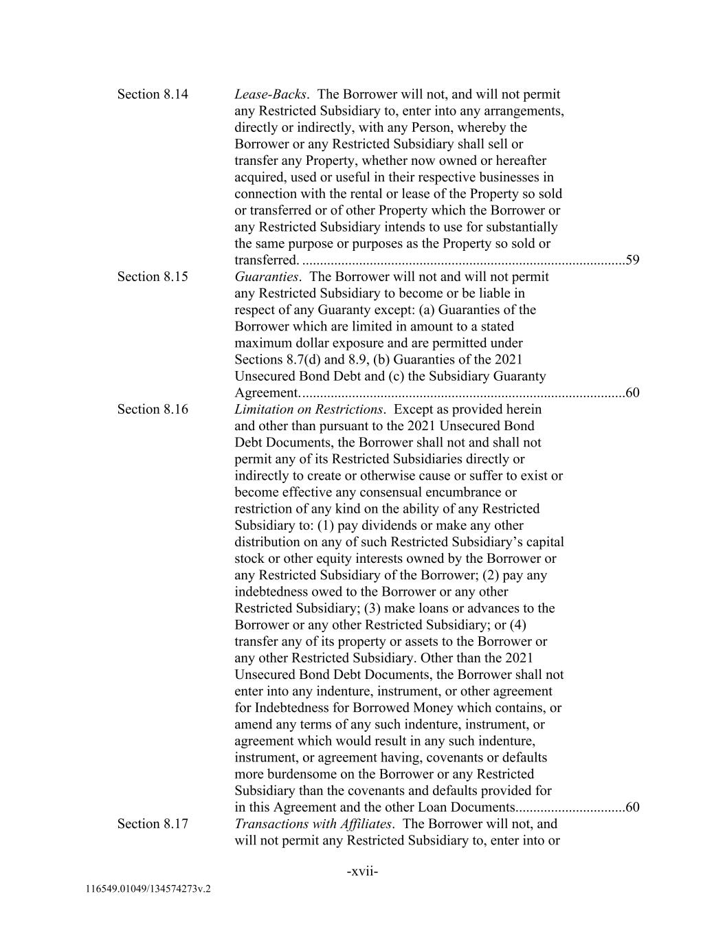 -xvii- 116549.01049/134574273v.2 Section 8.14  Lease-Backs. The Borrower will not, and will not permit any Restricted Subsidiary to, enter into any arrangements, directly or indirectly, with any Person, whereby the Borrower or any Restricted Subsidiary shall sell or transfer any Property, whether now owned or hereafter acquired, used or useful in their respective businesses in connection with the rental or lease of the Property so sold or transferred or of other Property which the Borrower or any Restricted Subsidiary intends to use for substantially the same purpose or purposes as the Property so sold or transferred. ...........................................................................................59  Section 8.15  Guaranties. The Borrower will not and will not permit any Restricted Subsidiary to become or be liable in respect of any Guaranty except: (a) Guaranties of the Borrower which are limited in amount to a stated maximum dollar exposure and are permitted under Sections 8.7(d) and 8.9, (b) Guaranties of the 2021 Unsecured Bond Debt and (c) the Subsidiary Guaranty Agreement. ...........................................................................................60  Section 8.16  Limitation on Restrictions. Except as provided herein and other than pursuant to the 2021 Unsecured Bond Debt Documents, the Borrower shall not and shall not permit any of its Restricted Subsidiaries directly or indirectly to create or otherwise cause or suffer to exist or become effective any consensual encumbrance or restriction of any kind on the ability of any Restricted Subsidiary to: (1) pay dividends or make any other distribution on any of such Restricted Subsidiary’s capital stock or other equity interests owned by the Borrower or any Restricted Subsidiary of the Borrower; (2) pay any indebtedness owed to the Borrower or any other Restricted Subsidiary; (3) make loans or advances to the Borrower or any other Restricted Subsidiary; or (4) transfer any of its property or assets to the Borrower or any other Restricted Subsidiary. Other than the 2021 Unsecured Bond Debt Documents, the Borrower shall not enter into any indenture, instrument, or other agreement for Indebtedness for Borrowed Money which contains, or amend any terms of any such indenture, instrument, or agreement which would result in any such indenture, instrument, or agreement having, covenants or defaults more burdensome on the Borrower or any Restricted Subsidiary than the covenants and defaults provided for in this Agreement and the other Loan Documents. ..............................60  Section 8.17  Transactions with Affiliates. The Borrower will not, and will not permit any Restricted Subsidiary to, enter into or