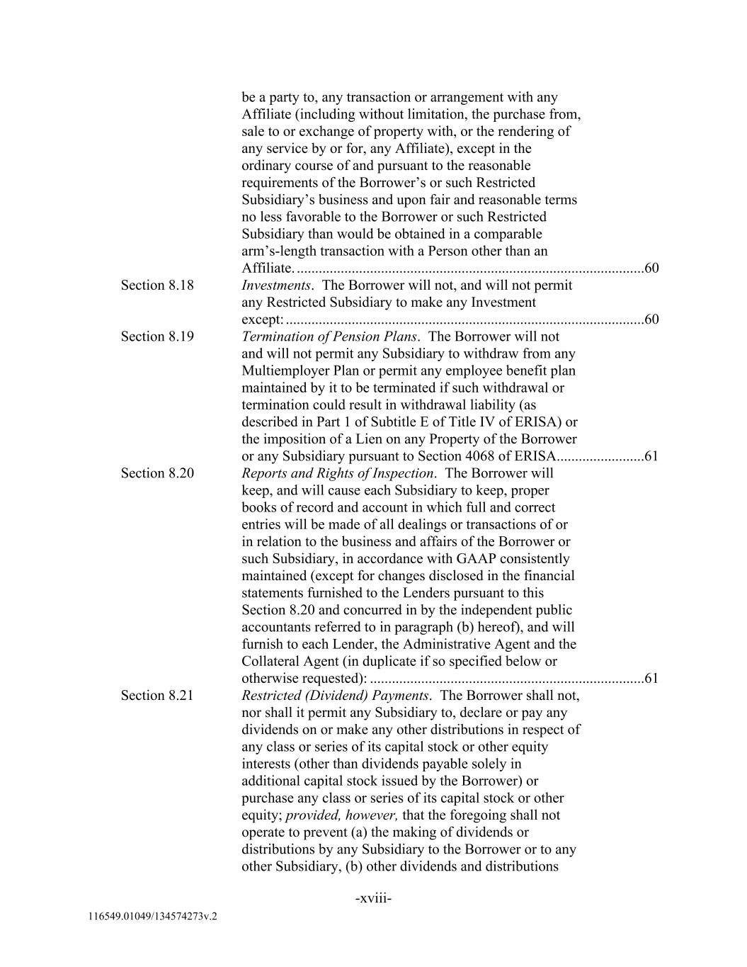 -xviii- 116549.01049/134574273v.2 be a party to, any transaction or arrangement with any Affiliate (including without limitation, the purchase from, sale to or exchange of property with, or the rendering of any service by or for, any Affiliate), except in the ordinary course of and pursuant to the reasonable requirements of the Borrower’s or such Restricted Subsidiary’s business and upon fair and reasonable terms no less favorable to the Borrower or such Restricted Subsidiary than would be obtained in a comparable arm’s-length transaction with a Person other than an Affiliate. ...............................................................................................60  Section 8.18  Investments. The Borrower will not, and will not permit any Restricted Subsidiary to make any Investment except: ..................................................................................................60  Section 8.19  Termination of Pension Plans. The Borrower will not and will not permit any Subsidiary to withdraw from any Multiemployer Plan or permit any employee benefit plan maintained by it to be terminated if such withdrawal or termination could result in withdrawal liability (as described in Part 1 of Subtitle E of Title IV of ERISA) or the imposition of a Lien on any Property of the Borrower or any Subsidiary pursuant to Section 4068 of ERISA. .......................61  Section 8.20  Reports and Rights of Inspection. The Borrower will keep, and will cause each Subsidiary to keep, proper books of record and account in which full and correct entries will be made of all dealings or transactions of or in relation to the business and affairs of the Borrower or such Subsidiary, in accordance with GAAP consistently maintained (except for changes disclosed in the financial statements furnished to the Lenders pursuant to this Section 8.20 and concurred in by the independent public accountants referred to in paragraph (b) hereof), and will furnish to each Lender, the Administrative Agent and the Collateral Agent (in duplicate if so specified below or otherwise requested): ...........................................................................61  Section 8.21  Restricted (Dividend) Payments. The Borrower shall not, nor shall it permit any Subsidiary to, declare or pay any dividends on or make any other distributions in respect of any class or series of its capital stock or other equity interests (other than dividends payable solely in additional capital stock issued by the Borrower) or purchase any class or series of its capital stock or other equity; provided, however, that the foregoing shall not operate to prevent (a) the making of dividends or distributions by any Subsidiary to the Borrower or to any other Subsidiary, (b) other dividends and distributions